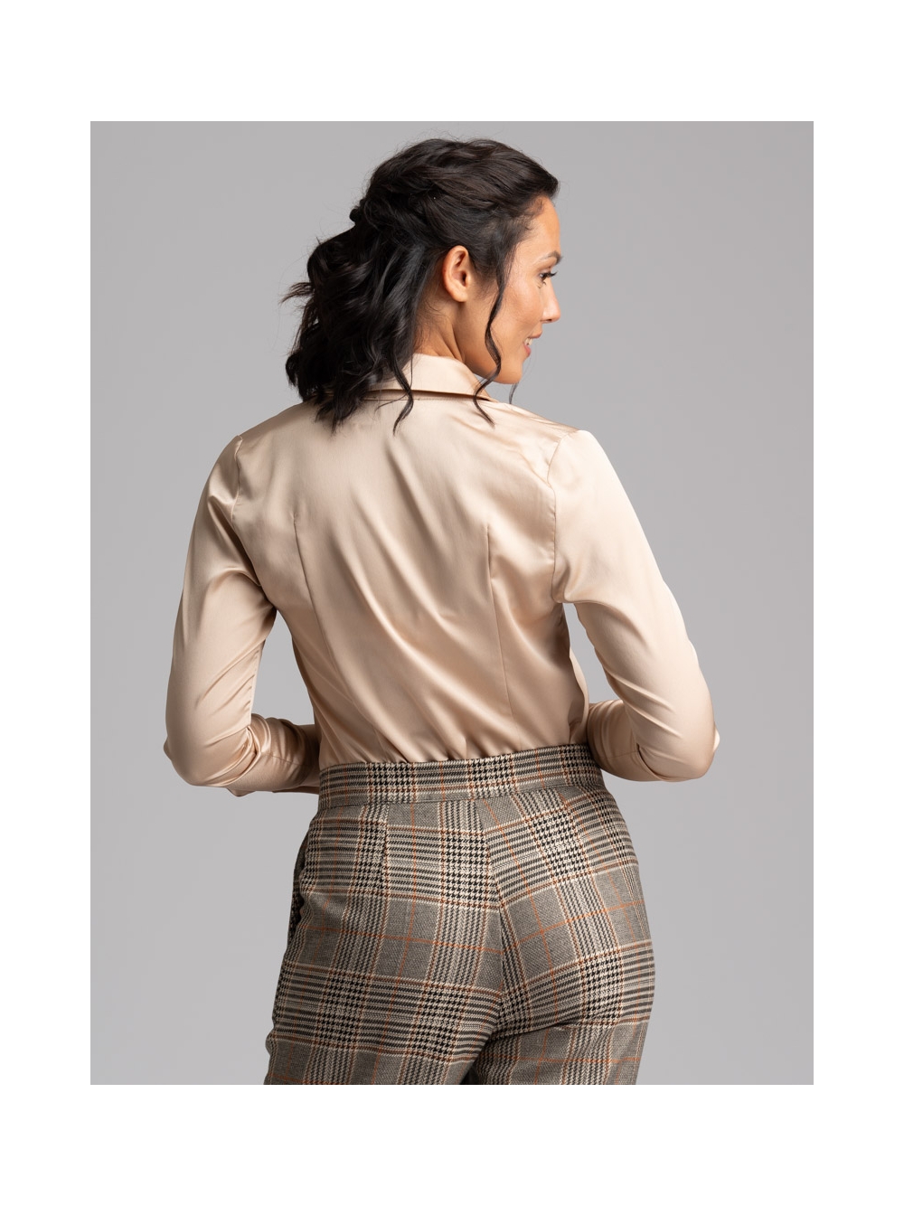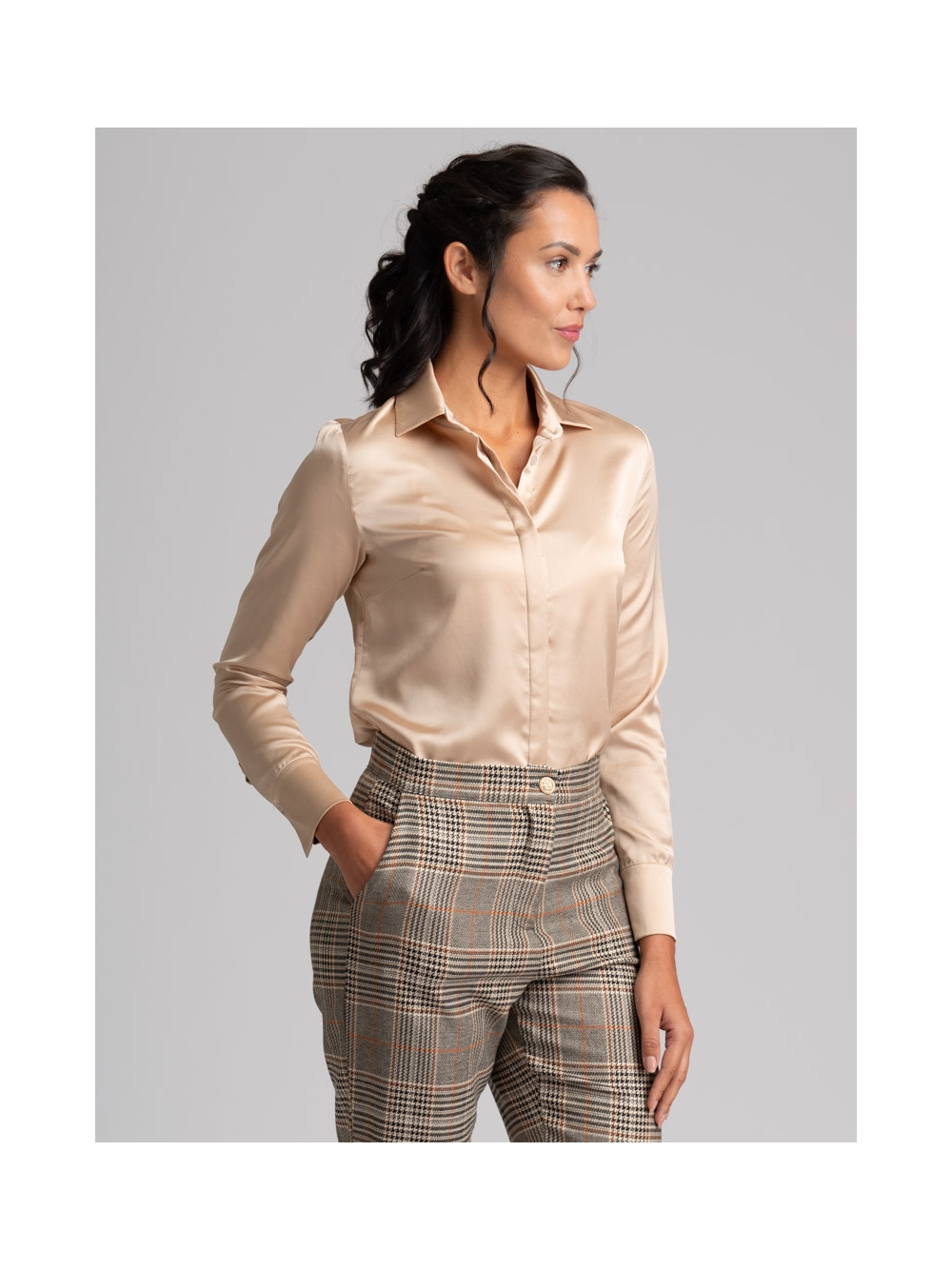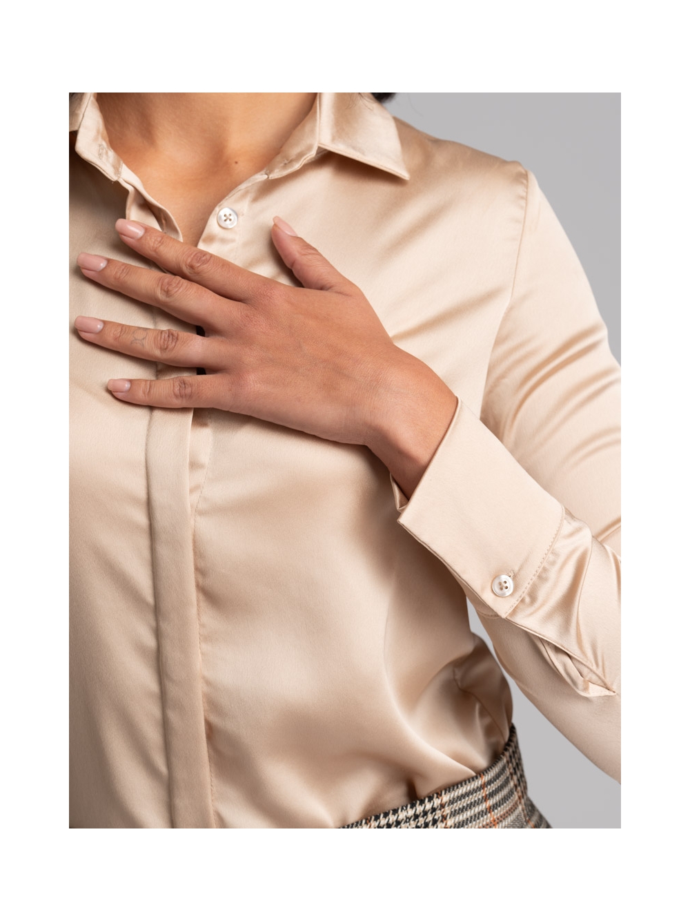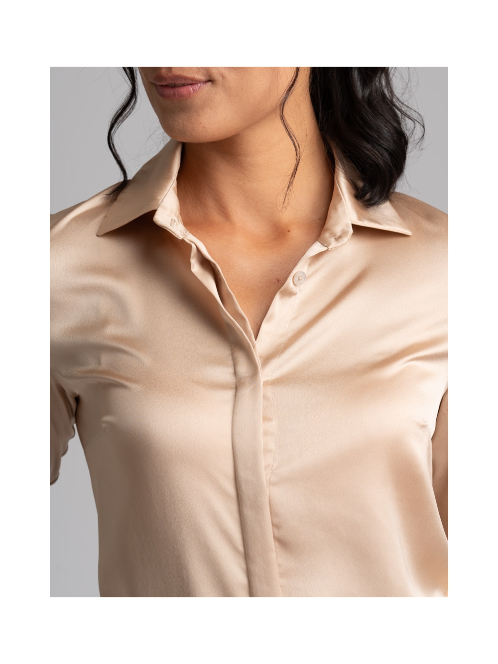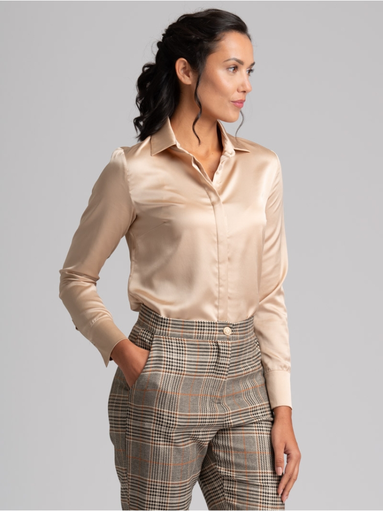 Camicia donna a manica lunga dalla vestibilità classica realizzata in satin tinta unita con abbottonatura coperta e pinces sul retro e all’altezza seno per accentuare la silhouette e donare femminilità. Questa camicia è disponibile nella variante colore bianco e nel color sabbia.