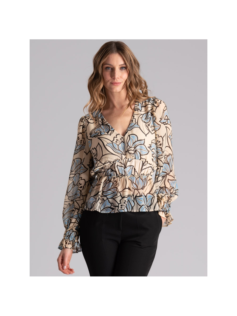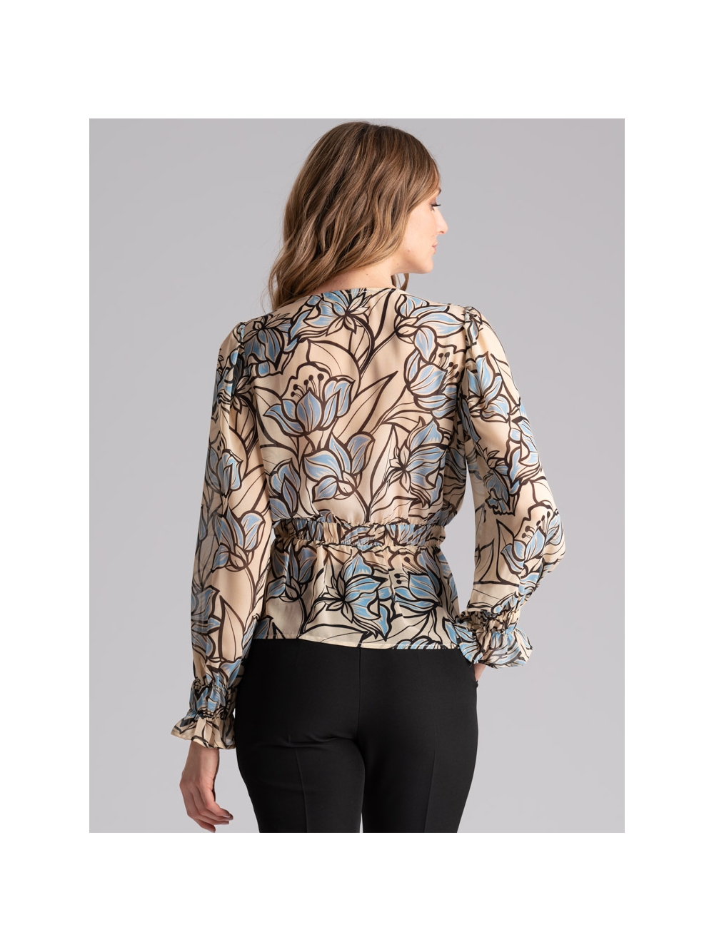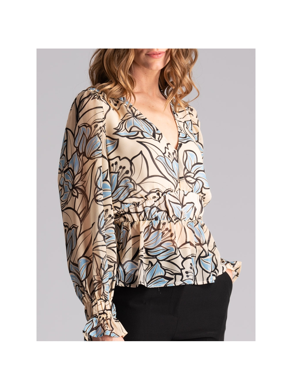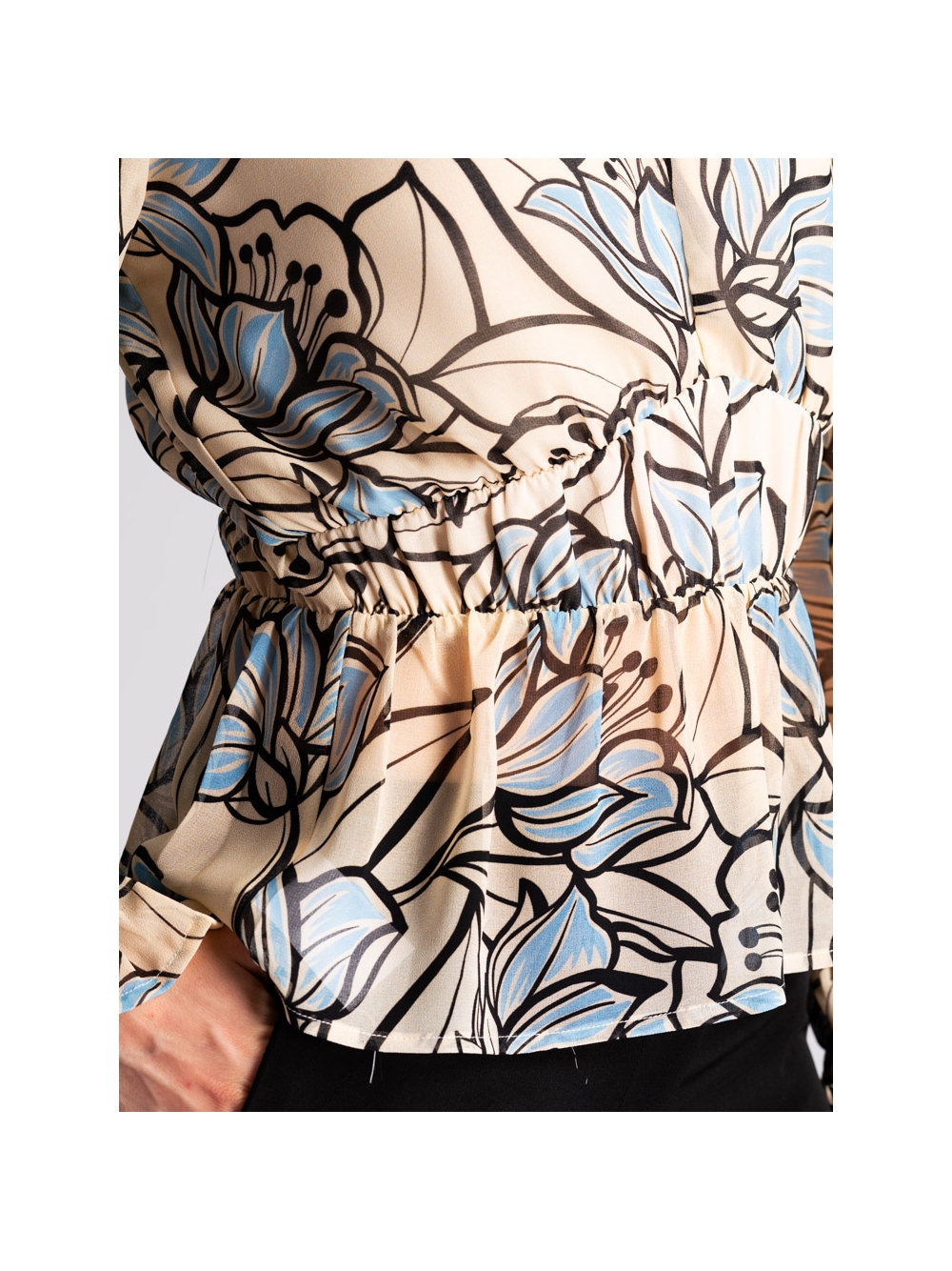 Camicia donna realizzata in tessuto georgette con stampa floreale, caratterizzata da uno scollo a V, elastico in vita e manica con doppio elastico.
