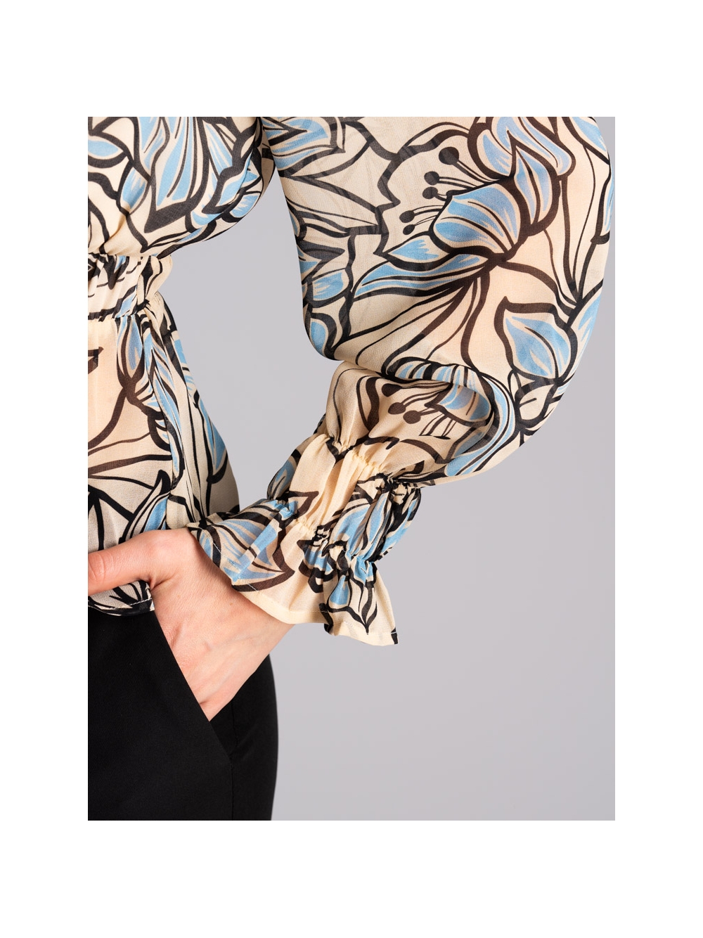 Camicia donna scollo a V, elastico in vita e manica con doppio elastico, realizzata in georgette con stampa floreale.