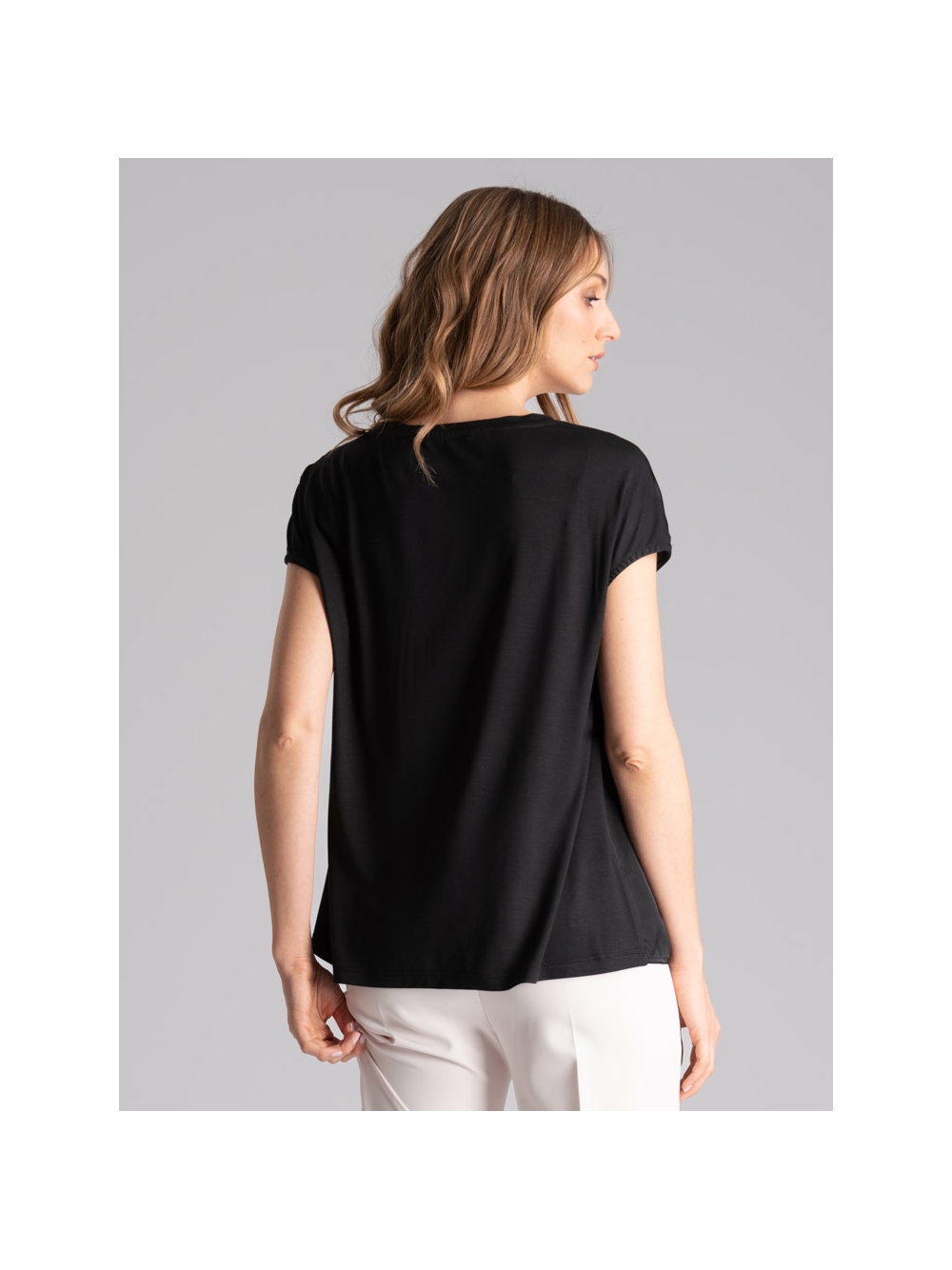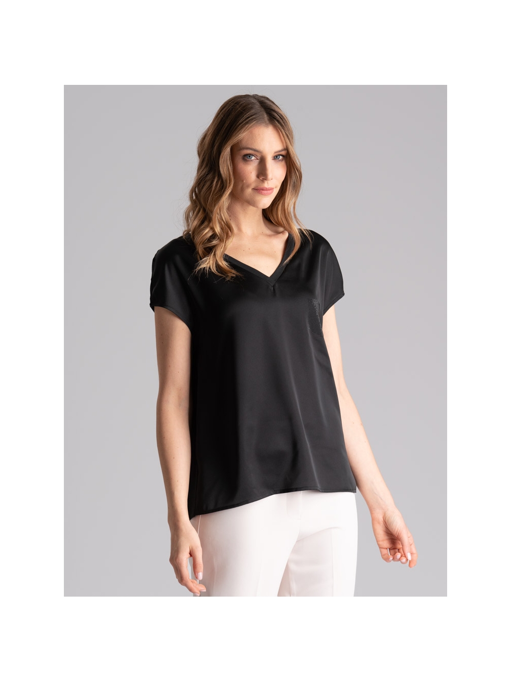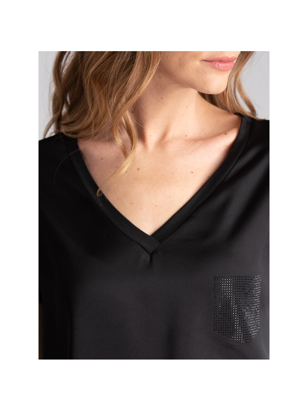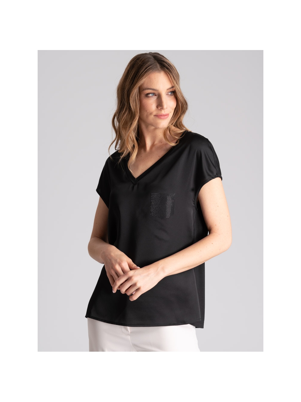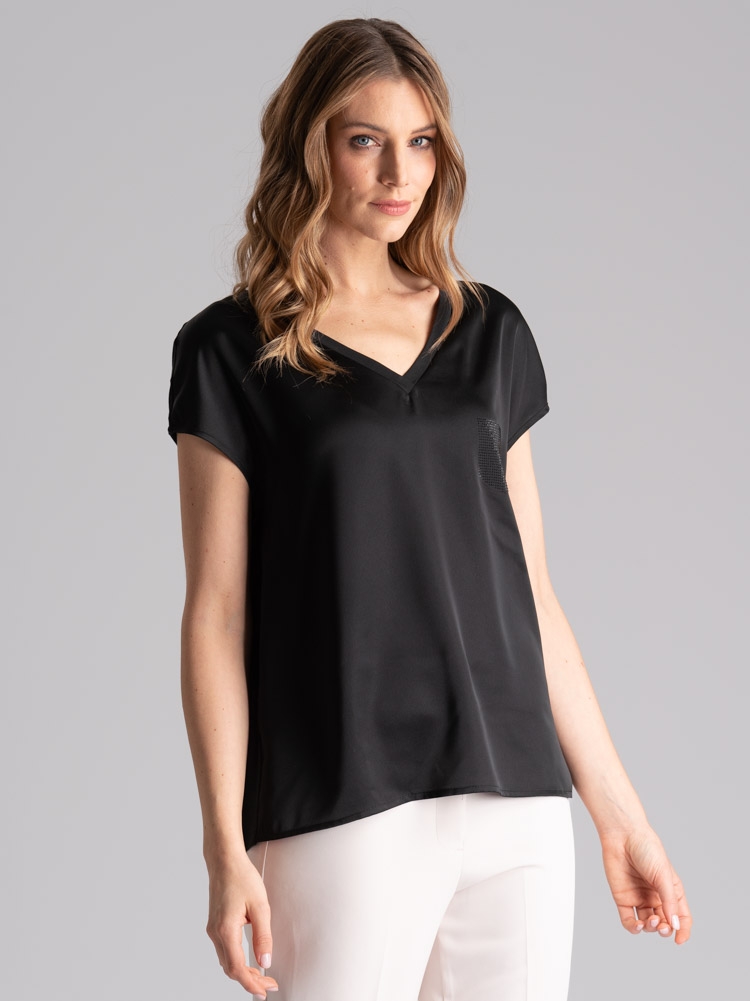 Camicia donna in jersey e satin, con scollo a V, giromanica a chimono ed applicazione strass a forma di taschino.