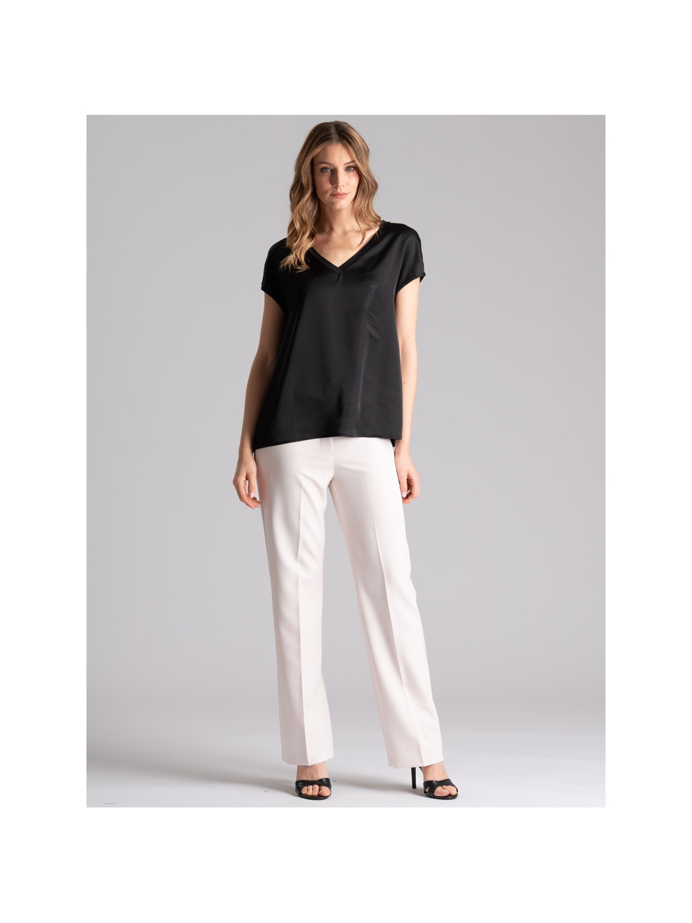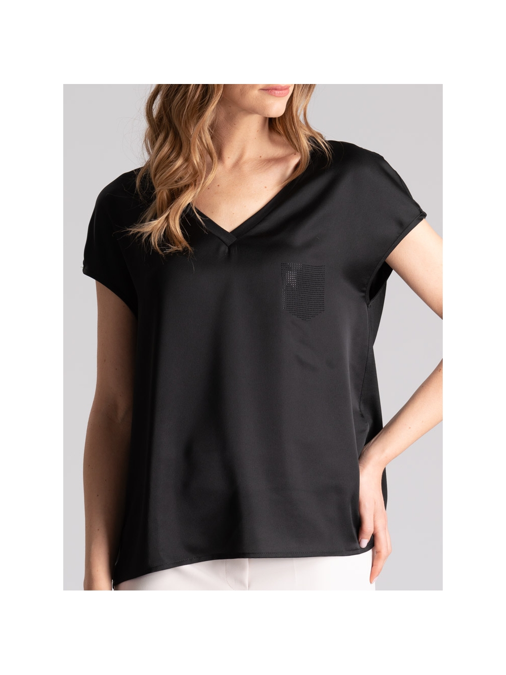 Blusa donna smanicata con scollo a V e giromanica a kimono, realizzata in jersey con davanti in satin e applicazione strass a forma di taschino. Disponibile nelle varianti colore sabbia e nero.