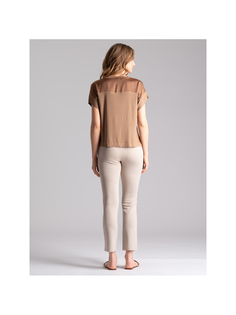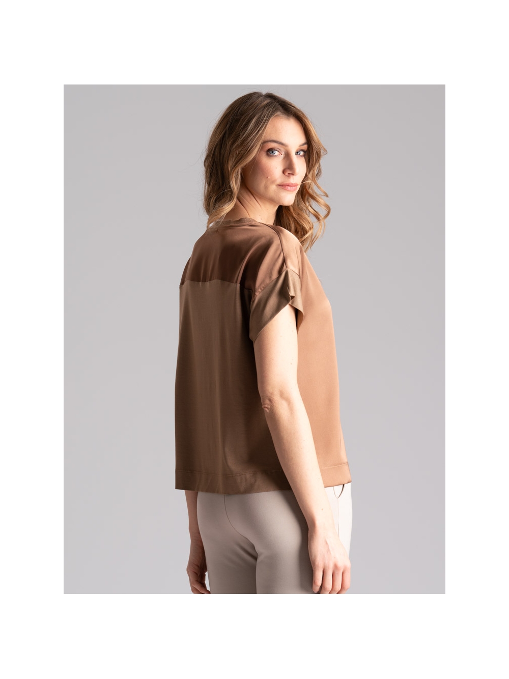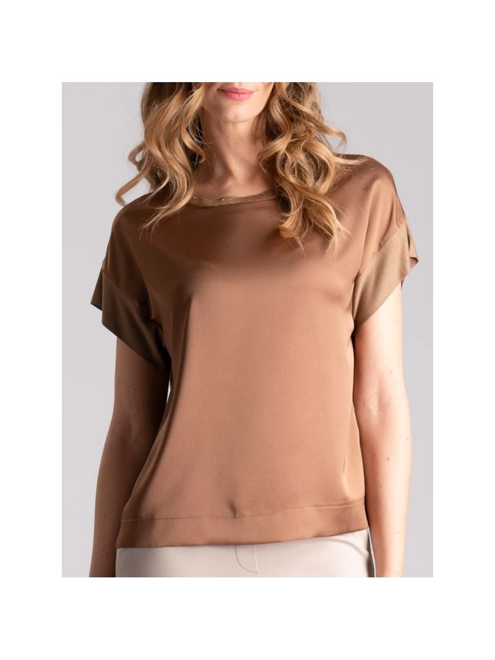 Blusa donna mezza manica con manica scesa, modello girocollo con punta di lurex, realizzata in jersey con davanti in satin. Disponibile nelle varianti colore terra e verde acqua.
