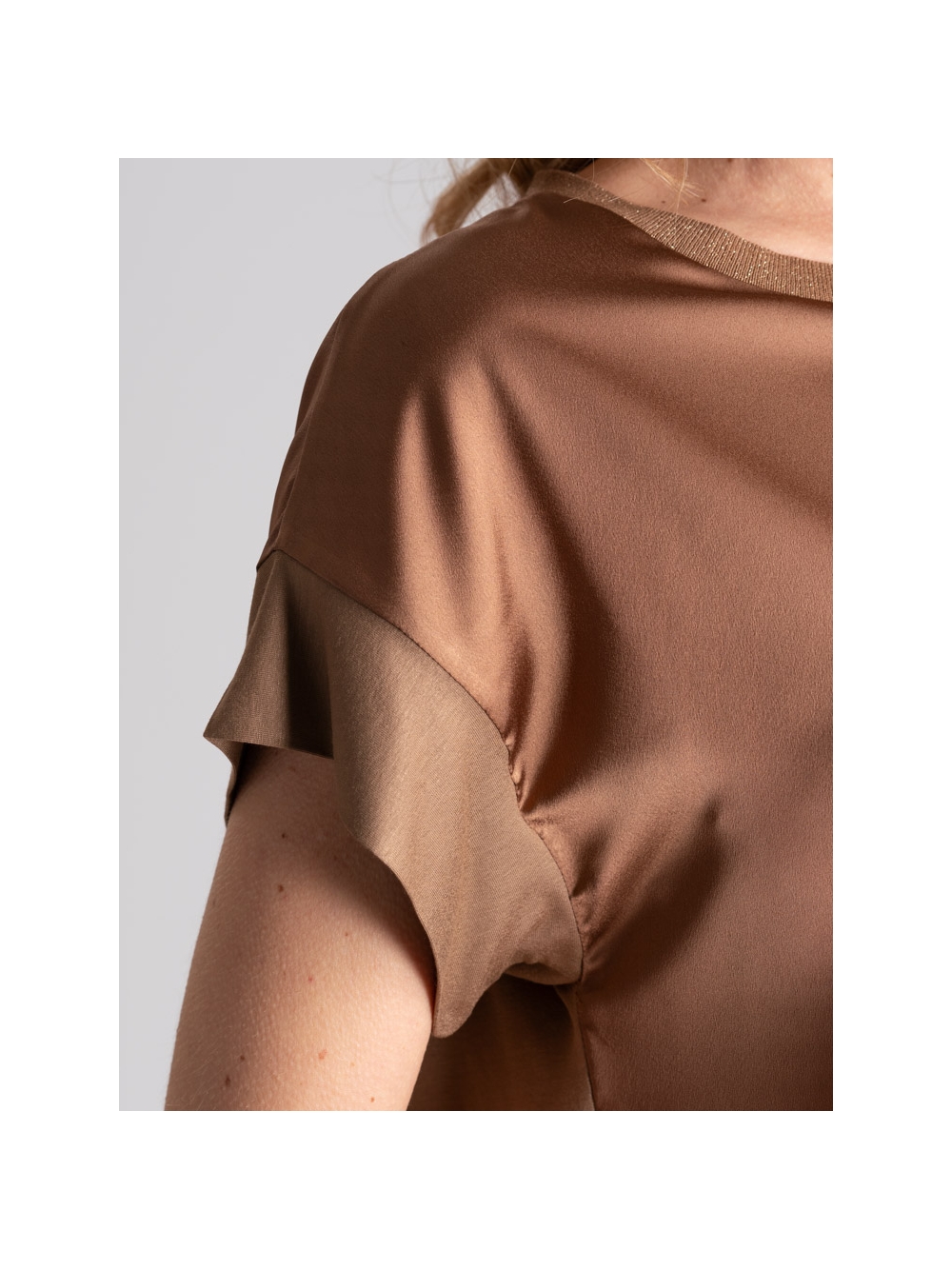 Camicia donna in jersey e satin, girocollo con punta di lurex e mezza manica con manica scesa.