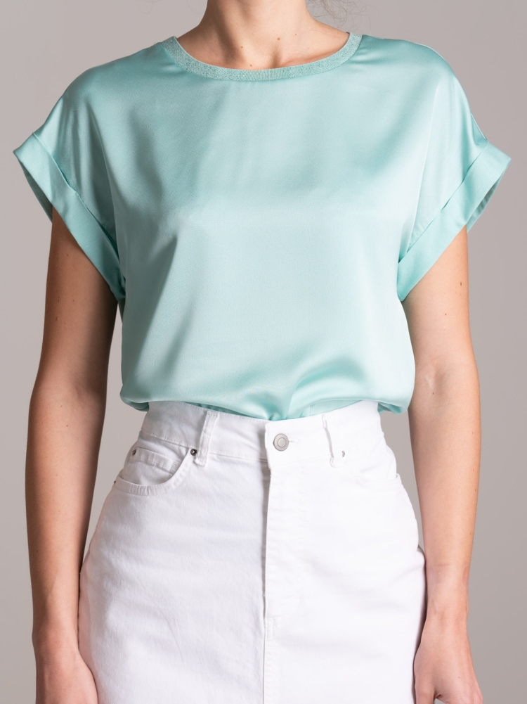 Blusa donna mezza manica con manica scesa, modello girocollo con punta di lurex, realizzata in jersey con davanti in satin. Disponibile nelle varianti colore terra e verde acqua.