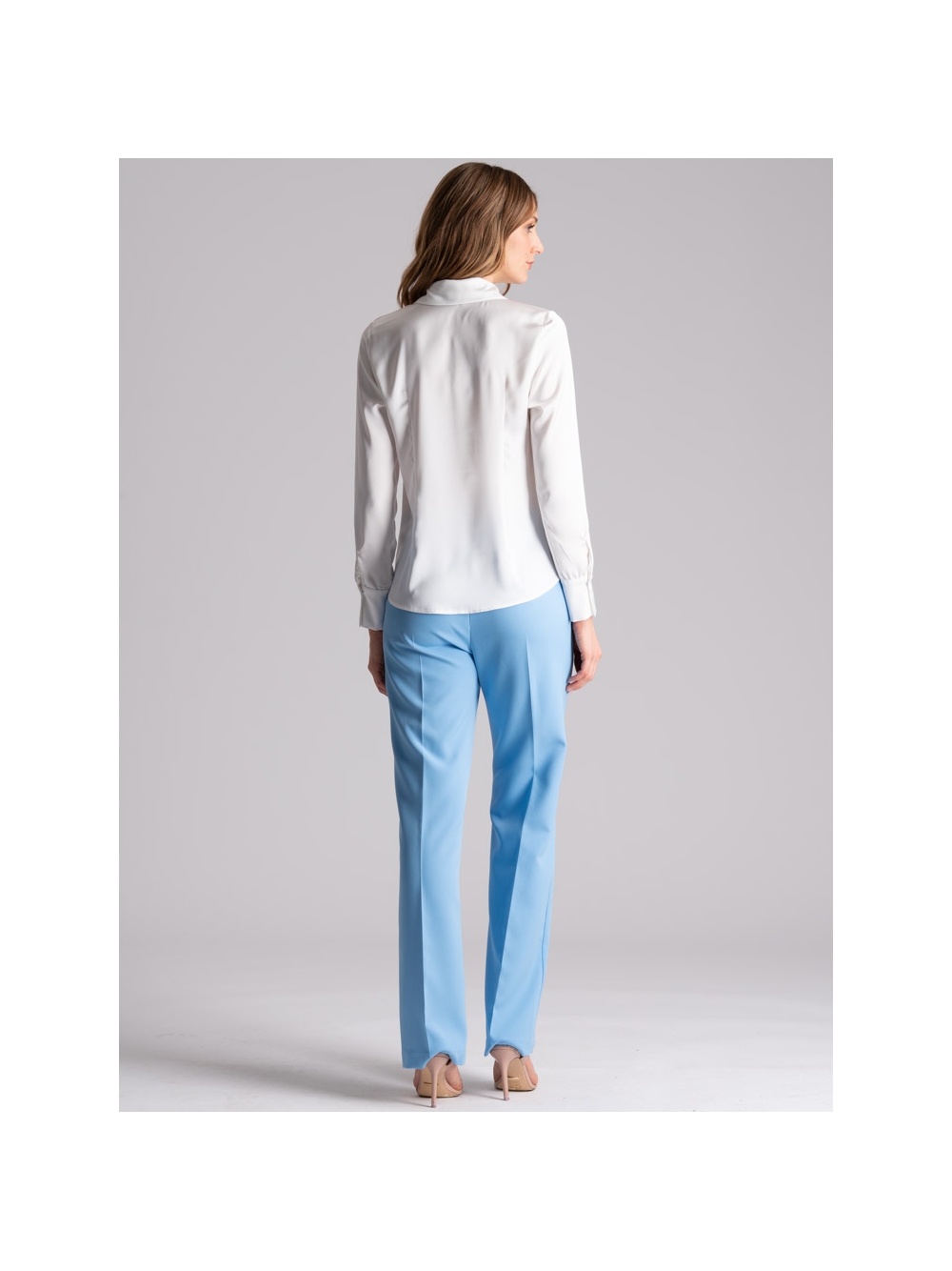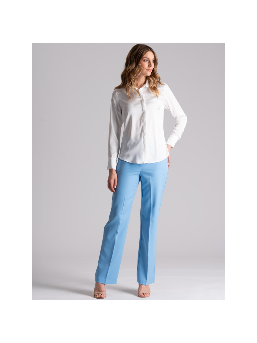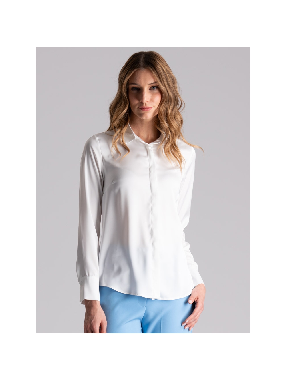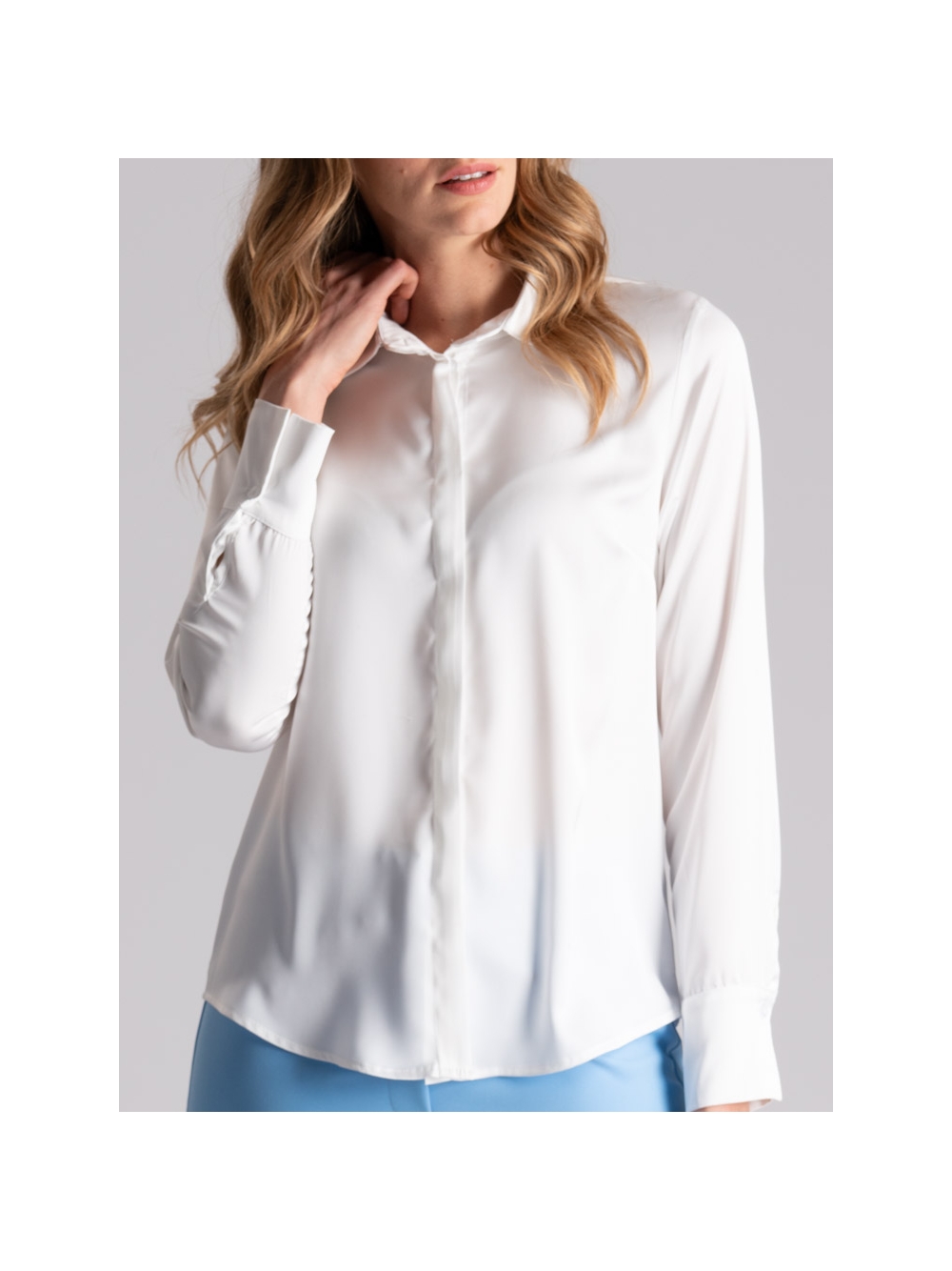 Camicia donna classica a manica lunga realizzata in satin tinta unita con abbottonatura coperta e pinces sul retro e all’altezza seno.