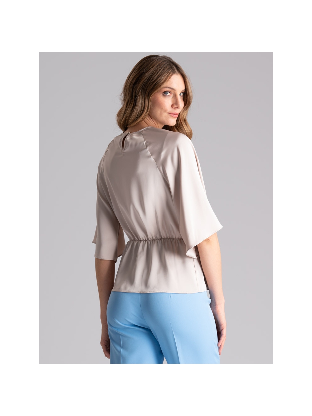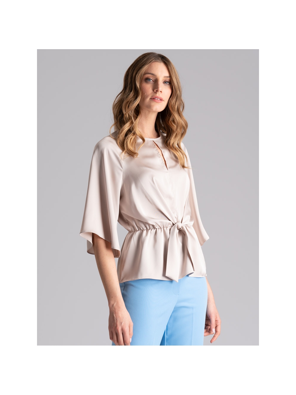 Camicia donna con finto nodo asimmetrico, elastico in vita e manica raglan a tre quarti, in satin beige.