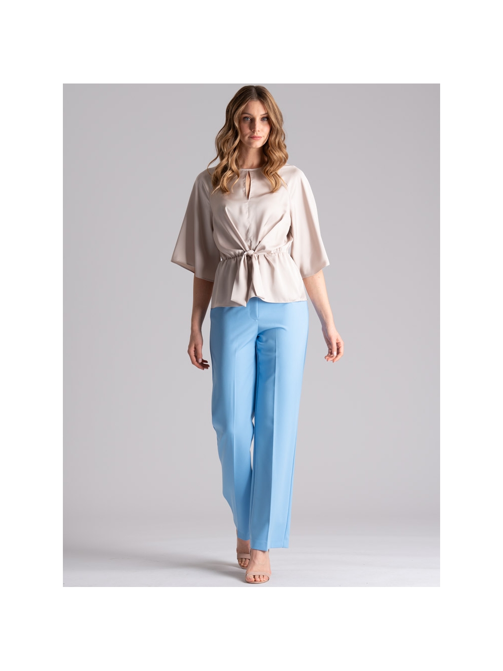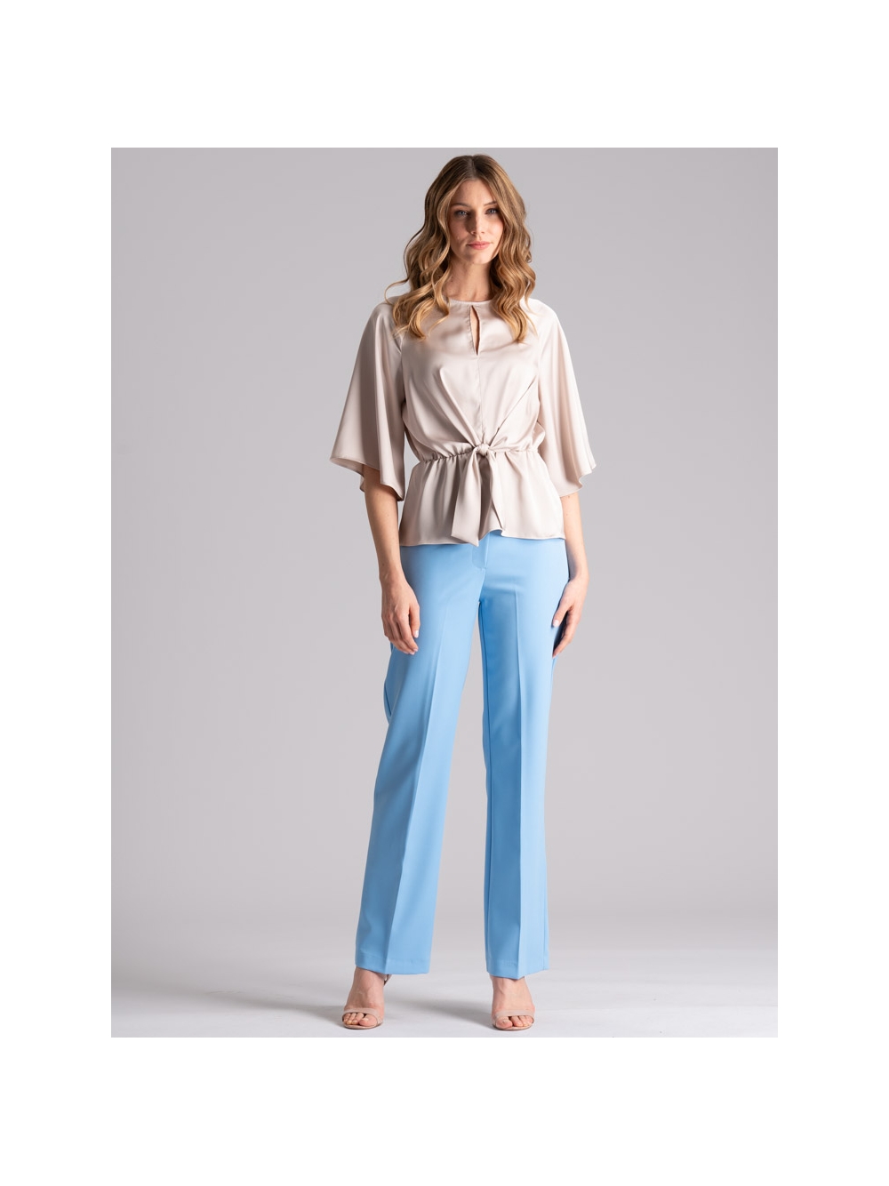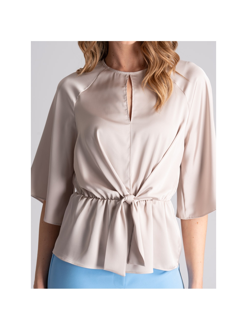 Camicia donna con manica raglan a tre quarti, girocollo con scollatura a goccia, elastico in vita e finto nodo asimmetrico davanti. Questa camicia donna è realizzata in satin color beige