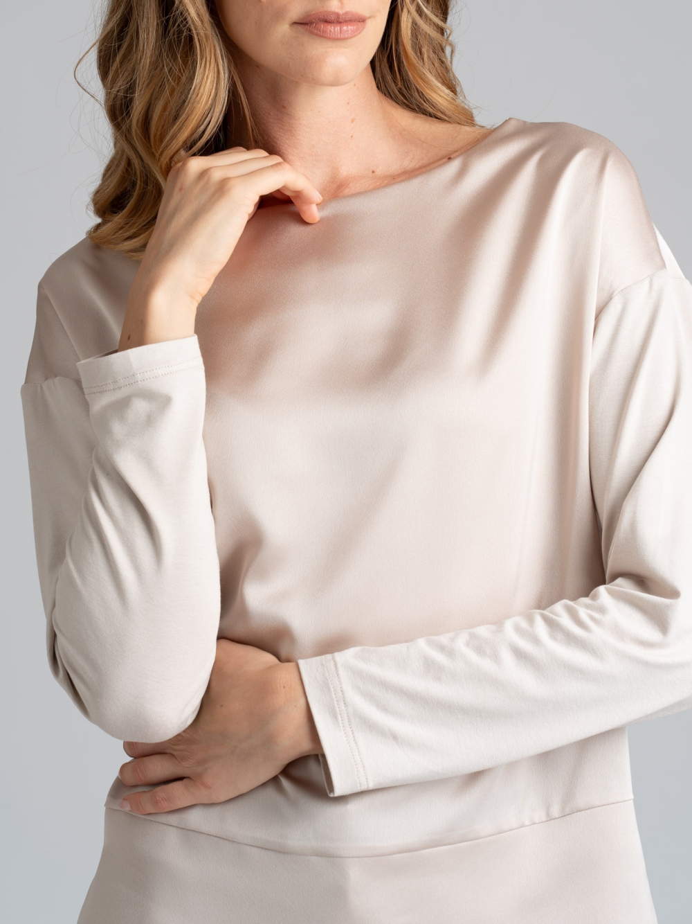 Blusa donna a maniche lunghe in tessuto satin e jersey, con spacchi sul fondo e scollo a barchetta.