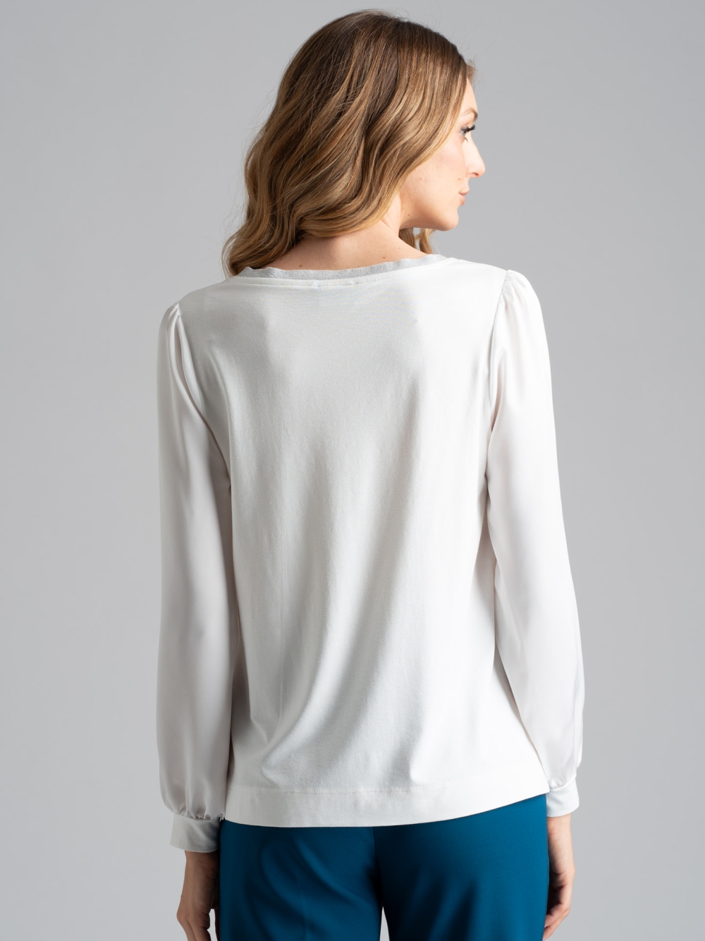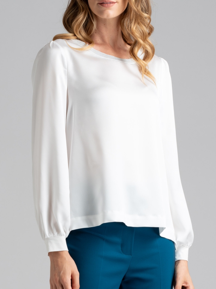 Blusa donna girocollo con manica a sbuffo e spacco sul fondo, caratterizzata da rib con lurex leggero.
