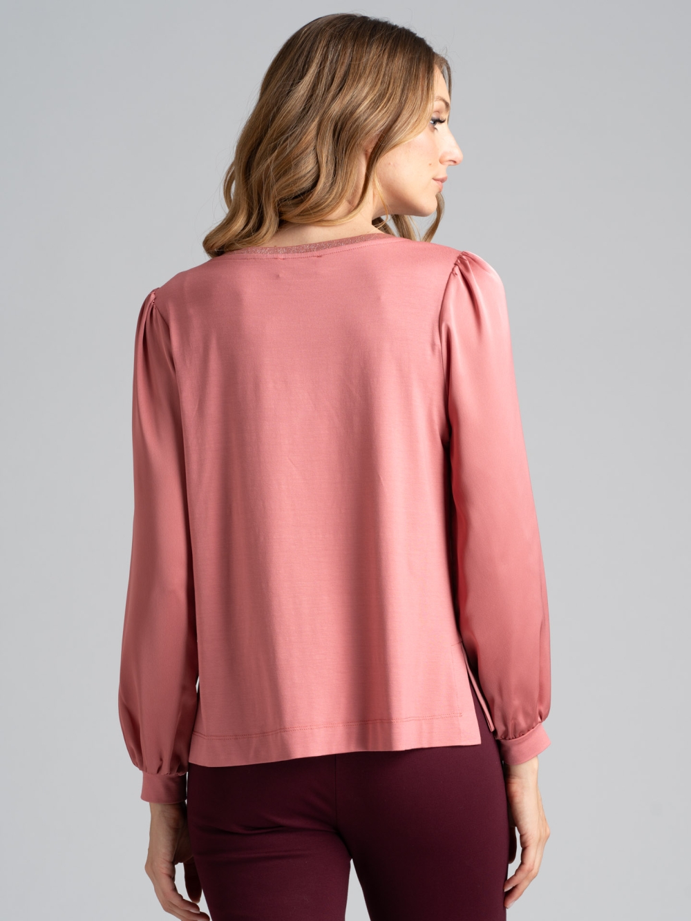 La blusa donna in tessuto satin e jersey tinta unita a girocollo, è caratterizzata da rib con lurex leggero sulla scollatura, manica a sbuffo e spacco sul fondo. Questo modello è disponibile nelle varianti colore bianco e rosa antico.