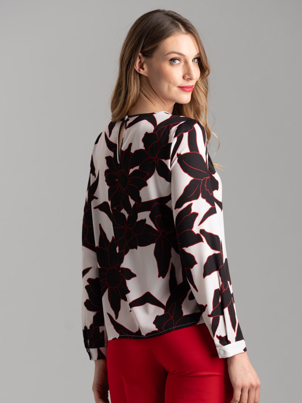 Camicia donna fantasia macro fiore nero bordato rosso su fondo bianco, con girocollo aperto, chiusura posteriore a goccia e manica lunga.