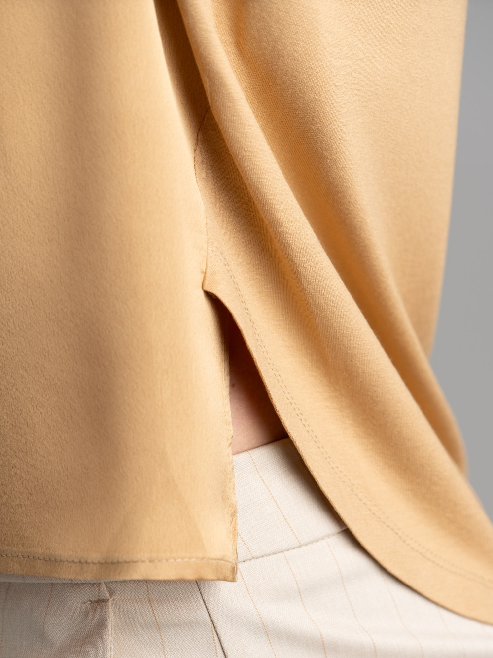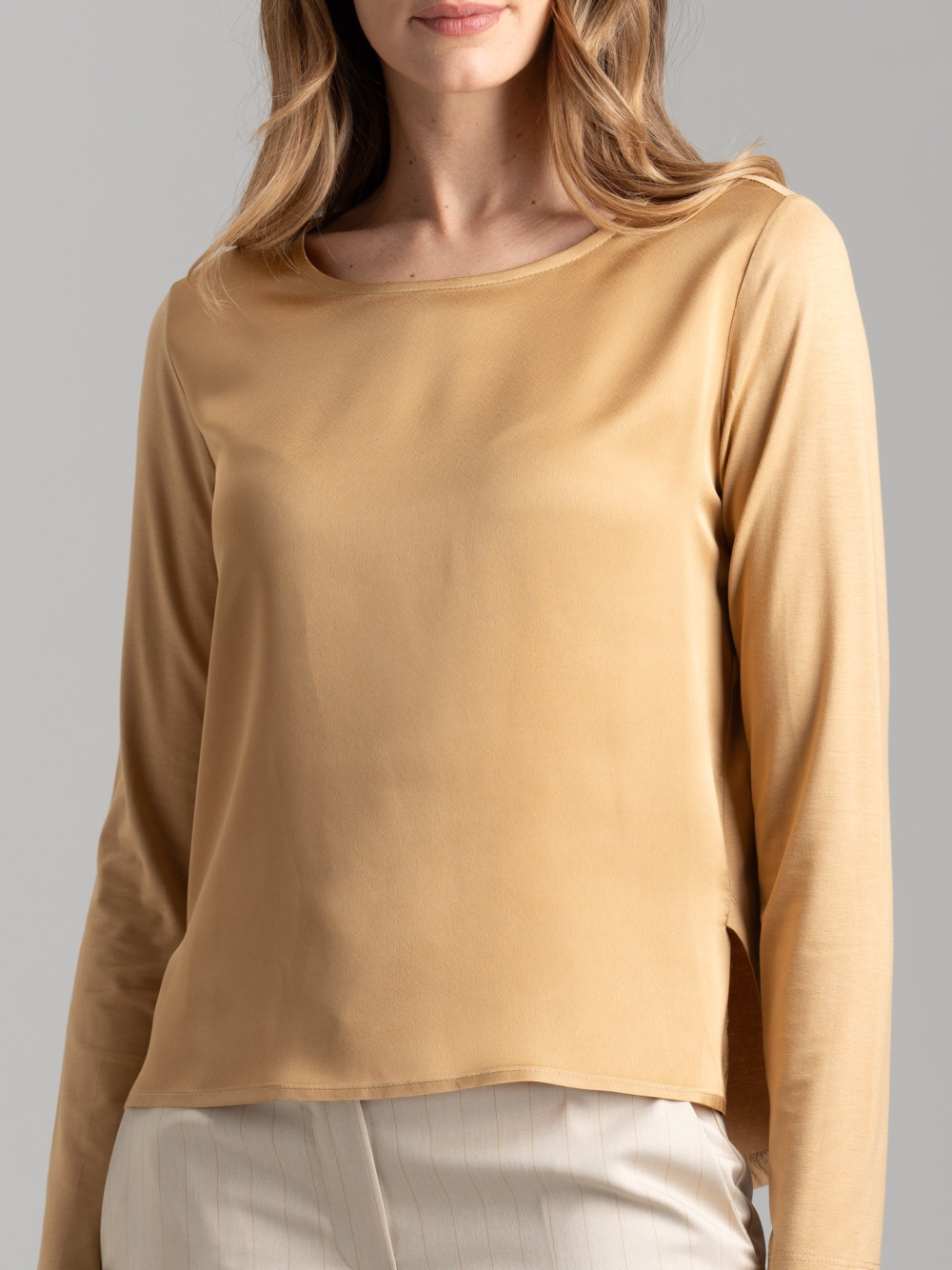 Camicia donna in jersey e satin, con girocollo sceso, manica lunga, spacco asimmetrico e vestibilità fluida.