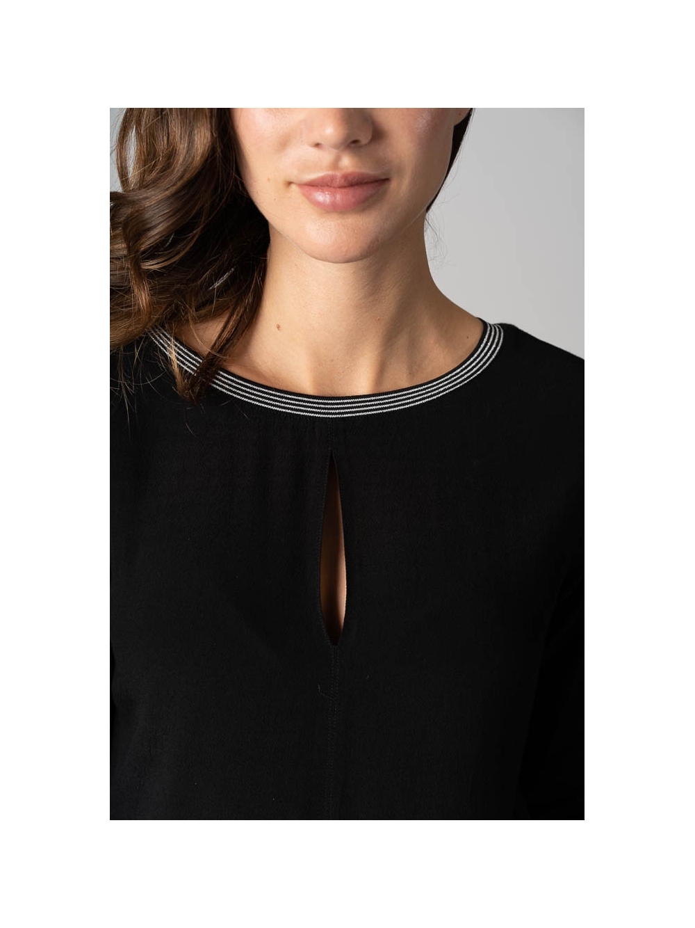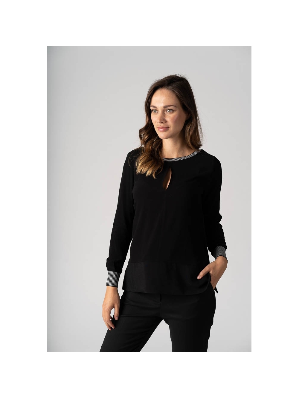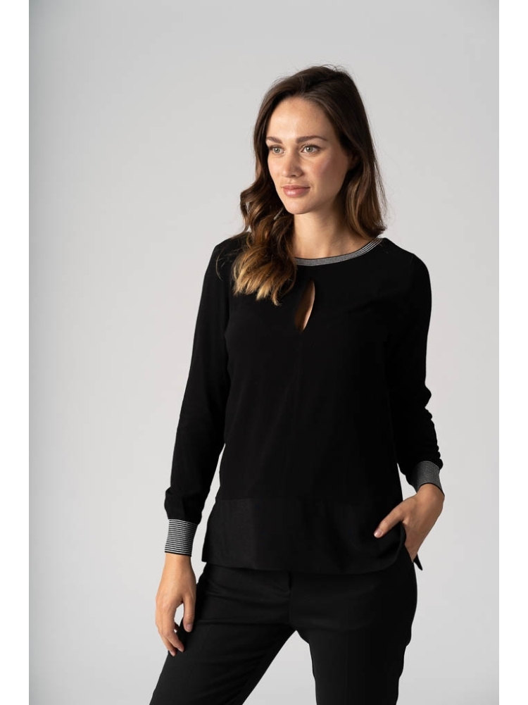 Camicetta donna girocollo dalla vestibilità fluida, realizzata in viscosa operata mista jersey con micro spacco a goccia sul davanti , polsini e collo rifiniti con rib micro-righe in lurex