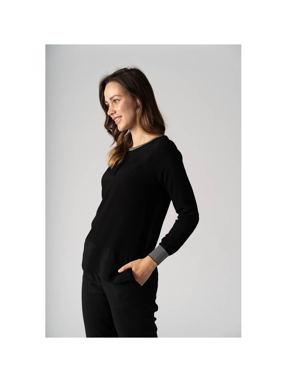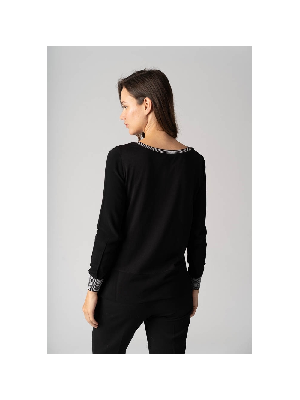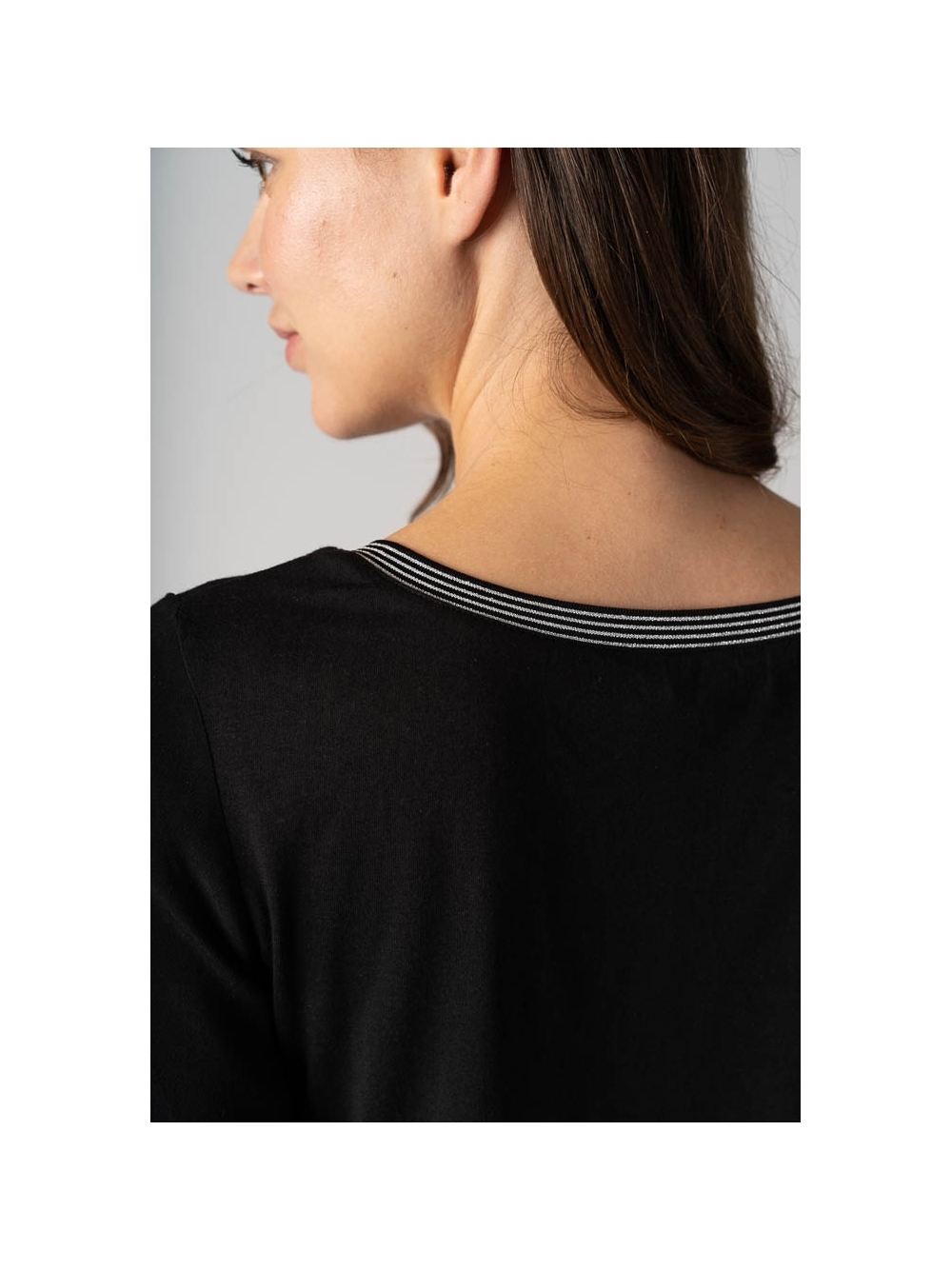 Camicetta donna girocollo dalla vestibilità fluida, realizzata in viscosa operata mista jersey con micro spacco a goccia sul davanti , polsini e collo rifiniti con rib micro-righe in lurex