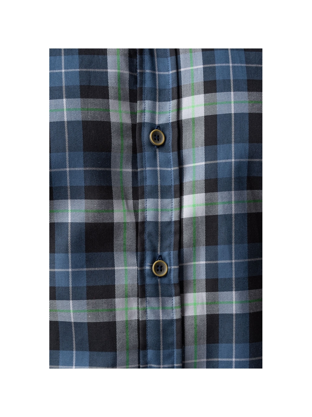 Camicia uomo realizzata in cotone twill madras con inserti di filato fluo, nastro in colore a contrasto applicato sul canolo bottoni, collo button down