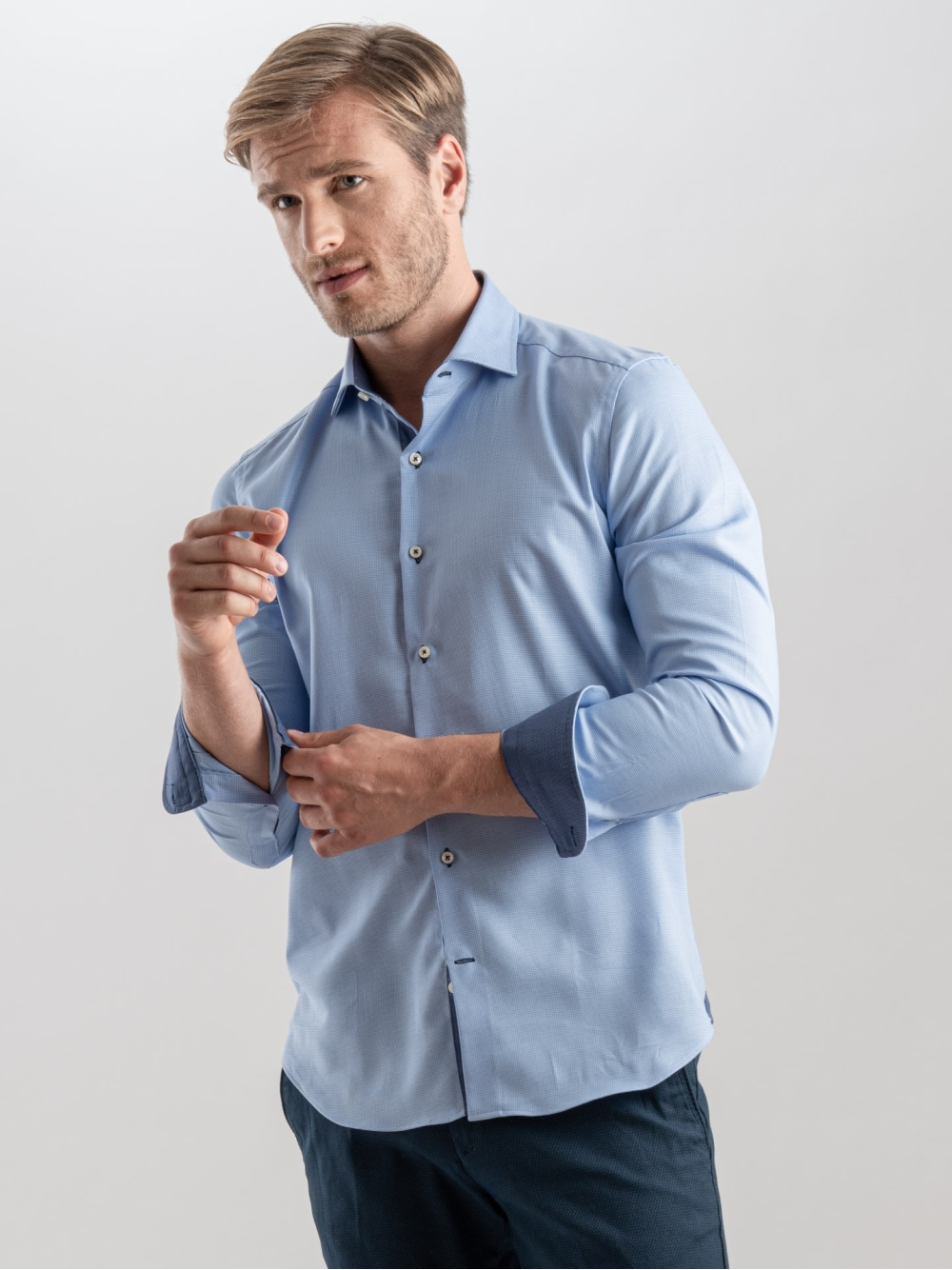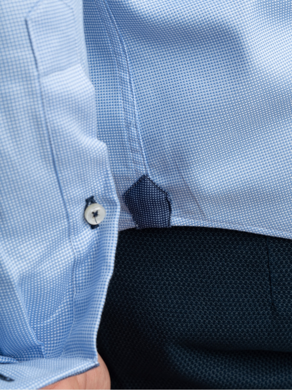 Camicia uomo realizzata in cotone operato bicolor effetto jacquard, nastro in colore a contrasto applicato sull'interno collo e canolo bottoni, collo button down.