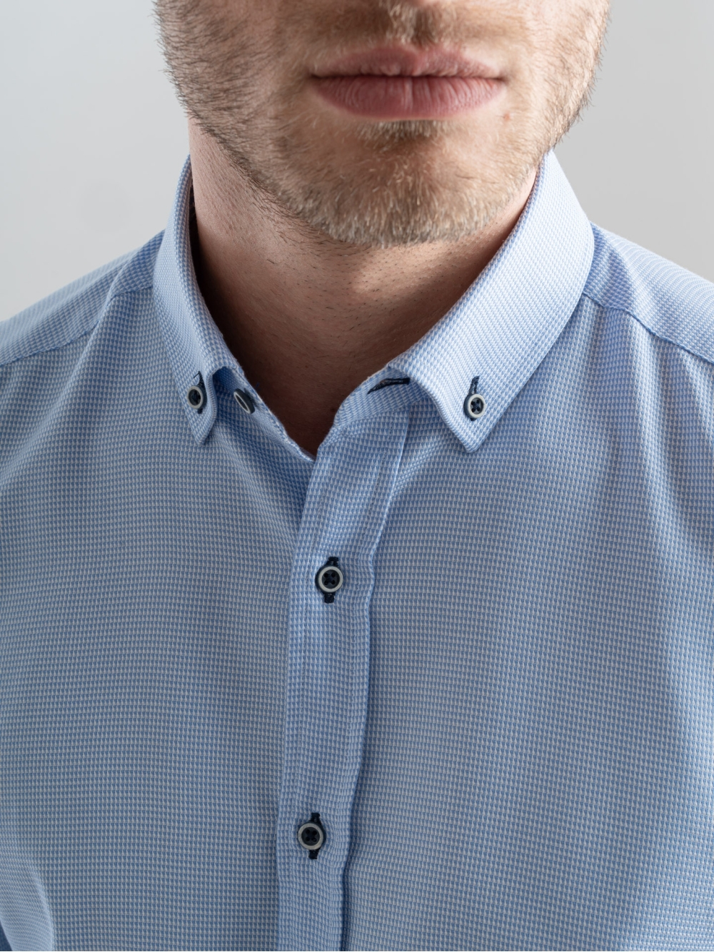 Camicia uomo realizzata in cotone armaturato azzurro, particolare tessuto in fantasia a contrasto sull'interno collo e interno polso , collo button down.