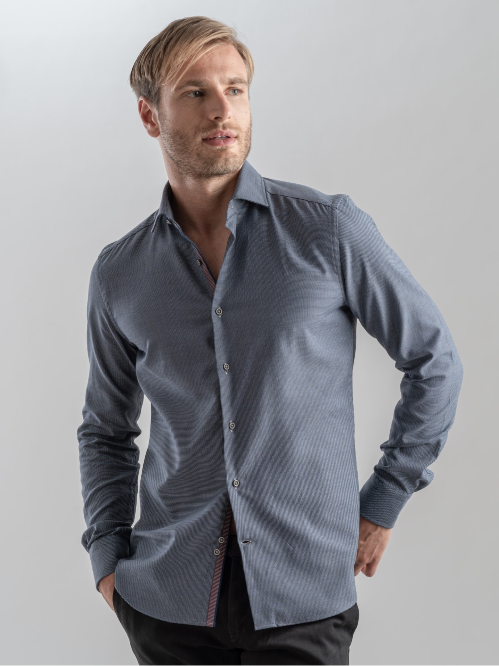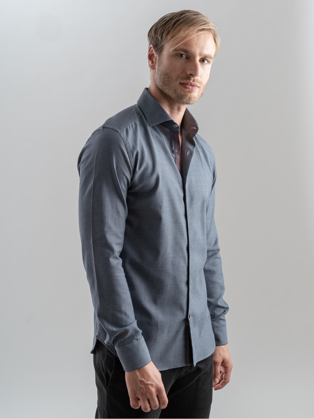 Camicia uomo realizzata in cotone operato bicolor, particolare nastro in fantasia a contrasto applicato sull'interno collo e sul canolo bottoni , collo semi francese.