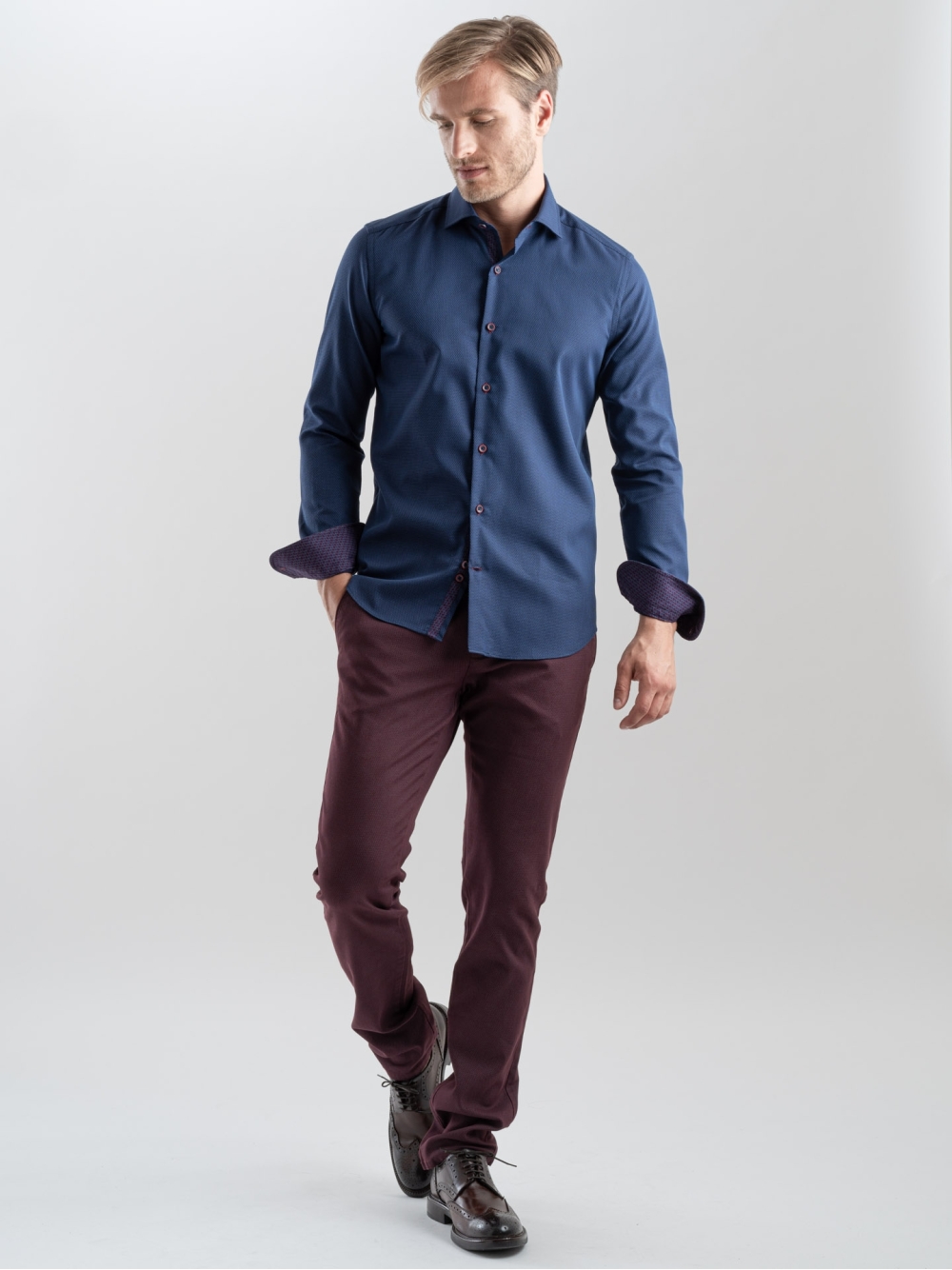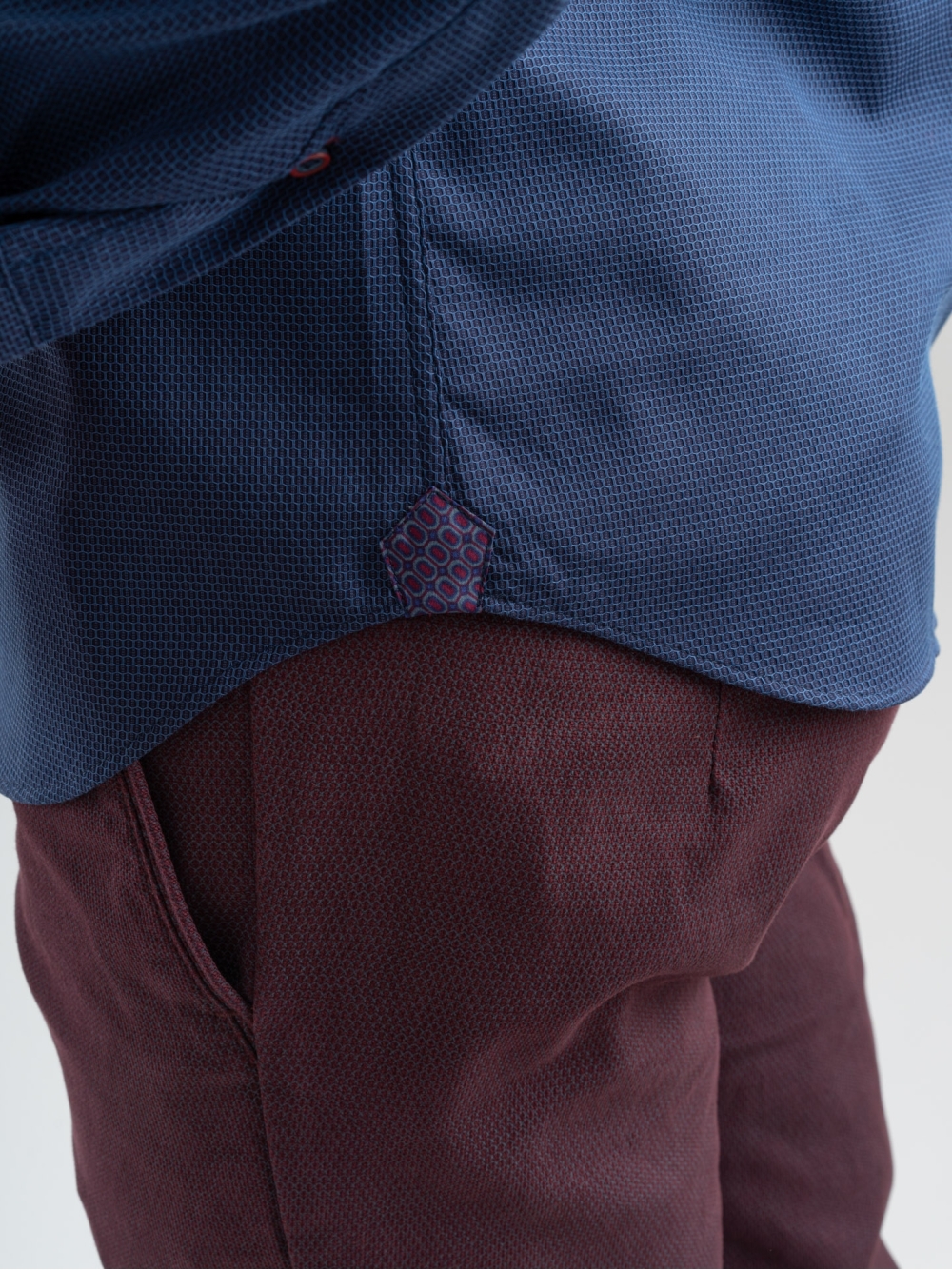 Camicia uomo realizzata in cotone armaturato, particolare tessuto in fantasia a contrasto applicato sull'interno ed esterno collo e sull'interno polso , collo semi francese .