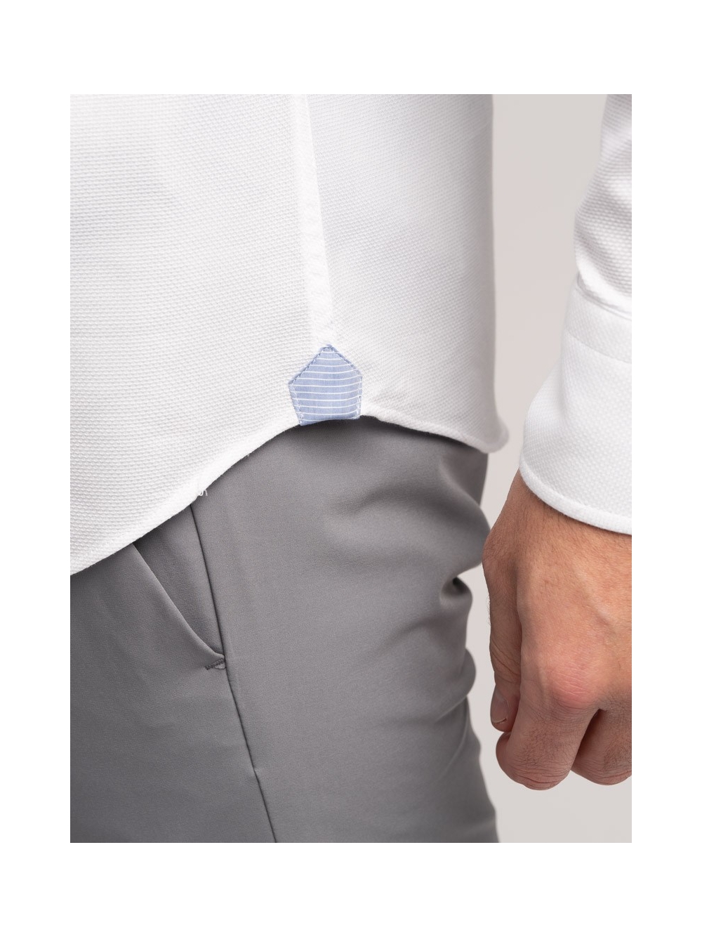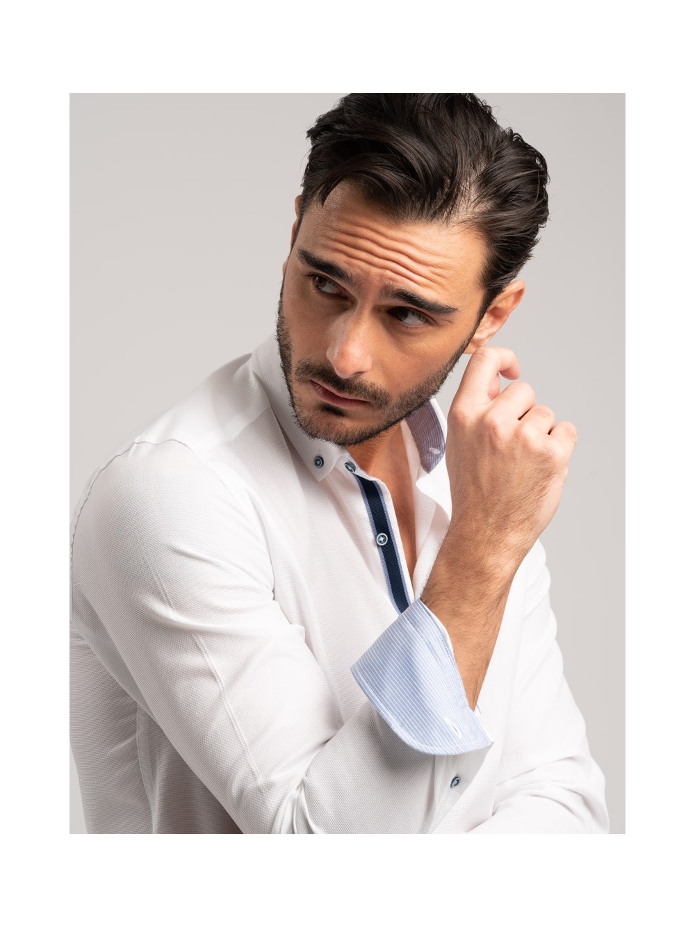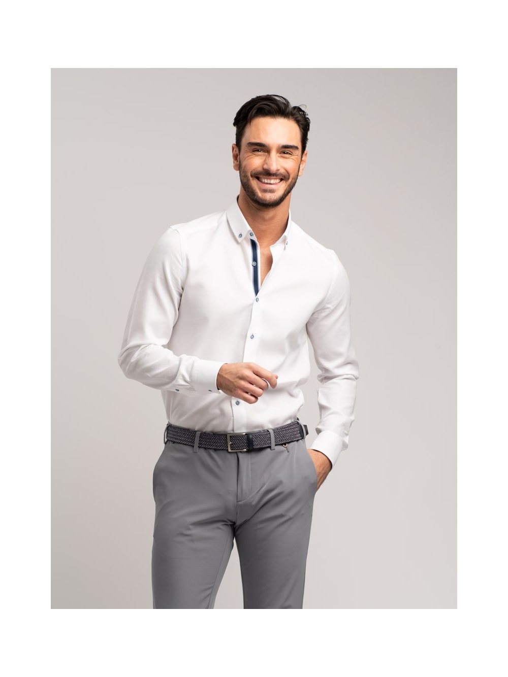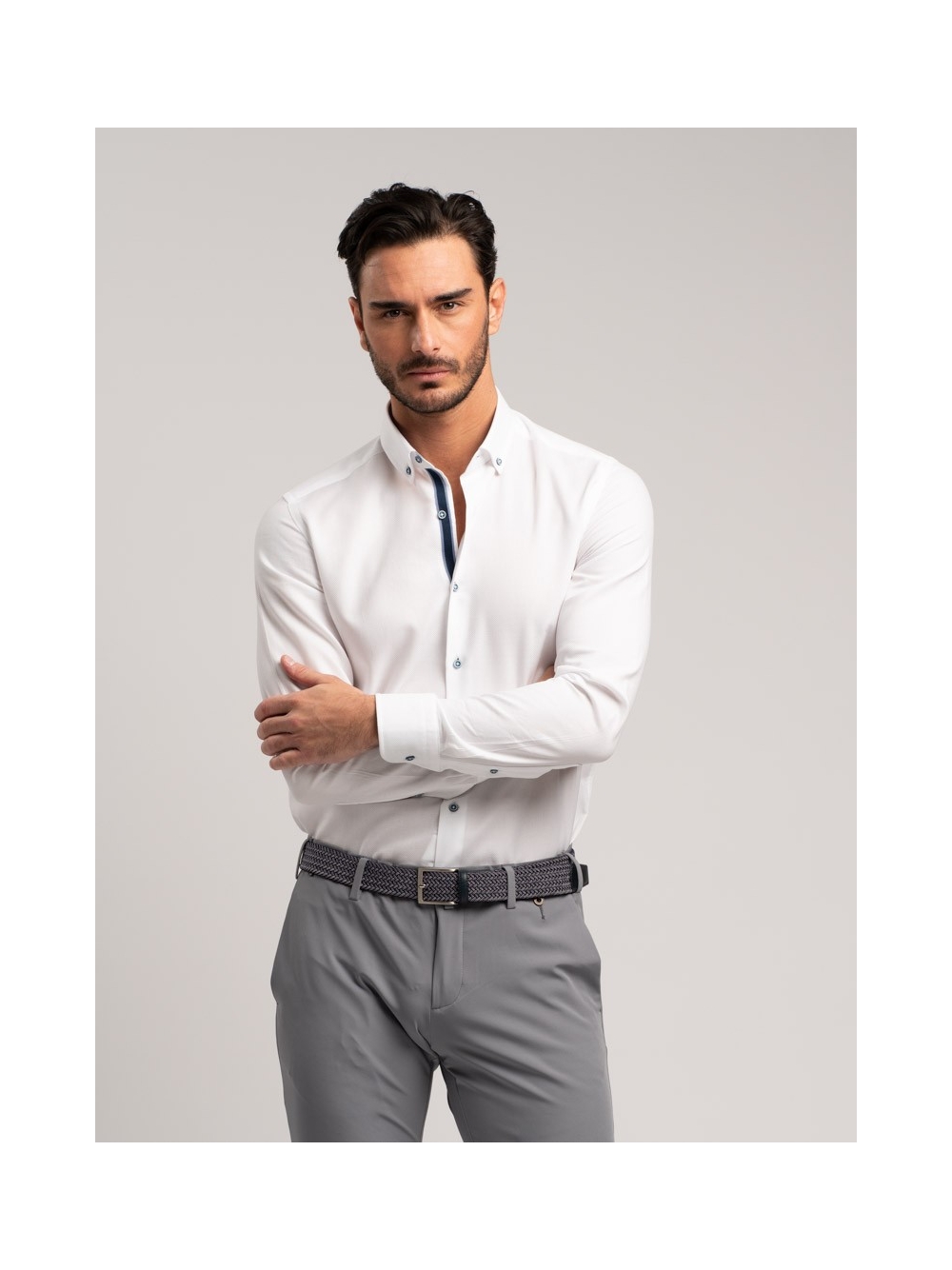 Camicia uomo tinta unita con collo botton down realizzata in puro cotone armaturato con inserti in tessuto a contrasto e applicazionde di gross grain sul canolo.