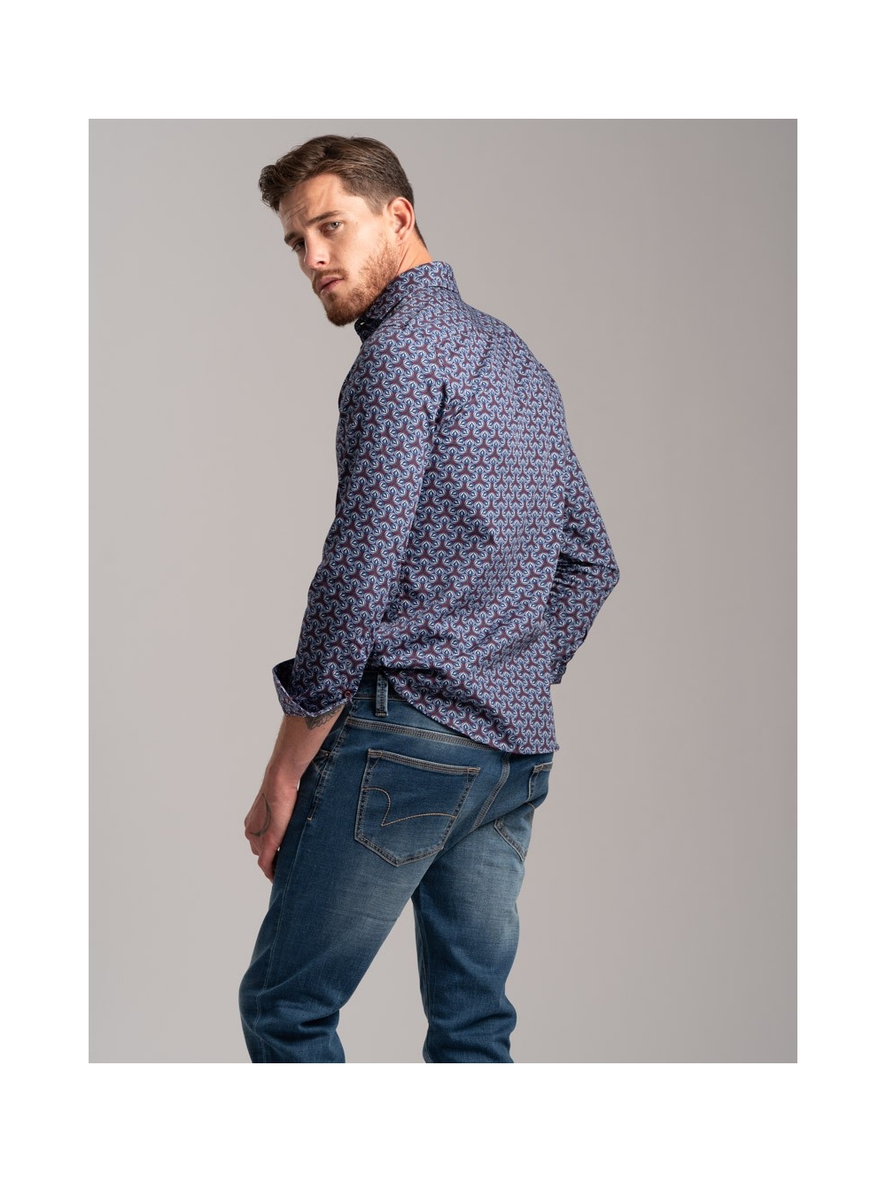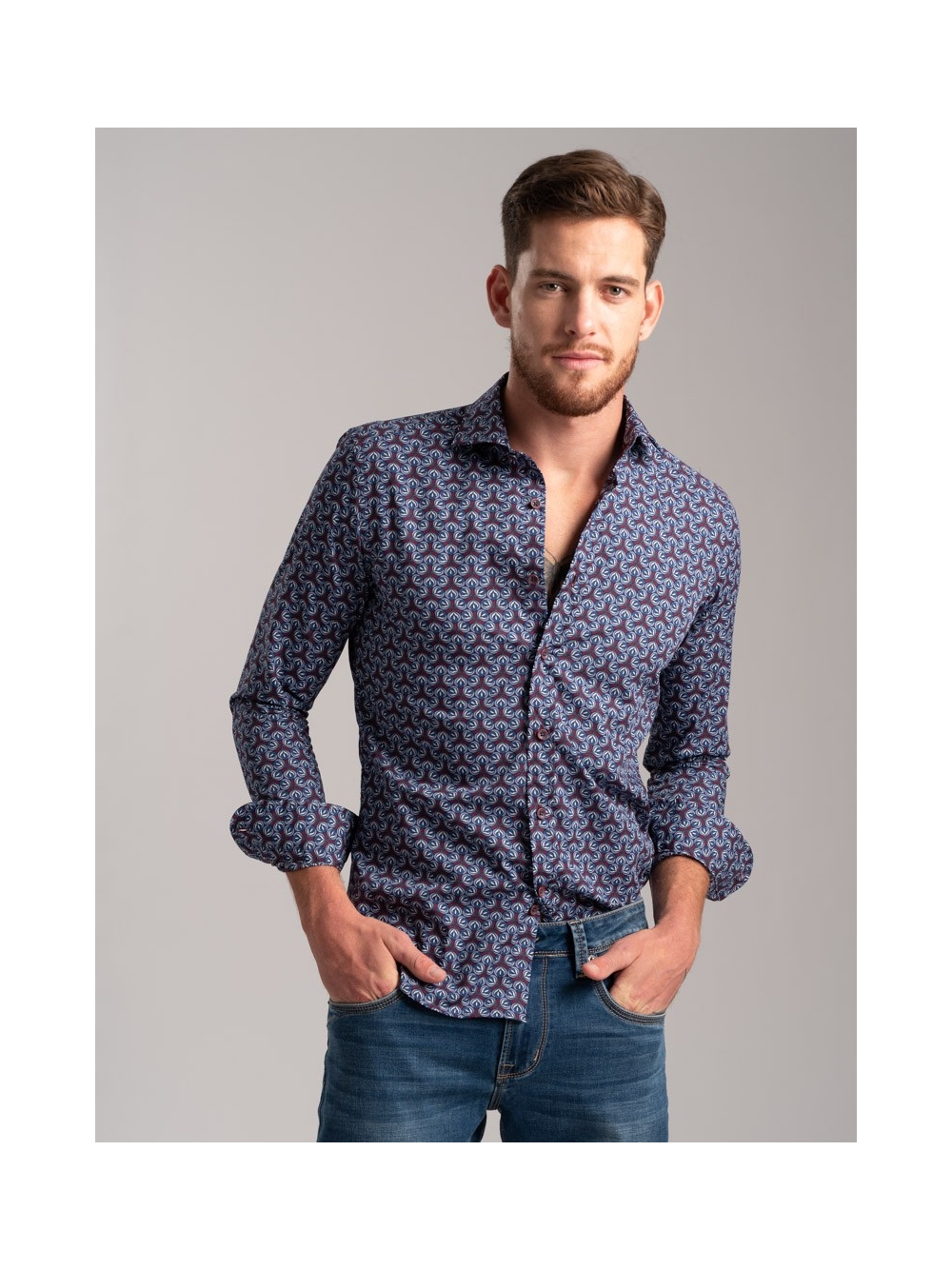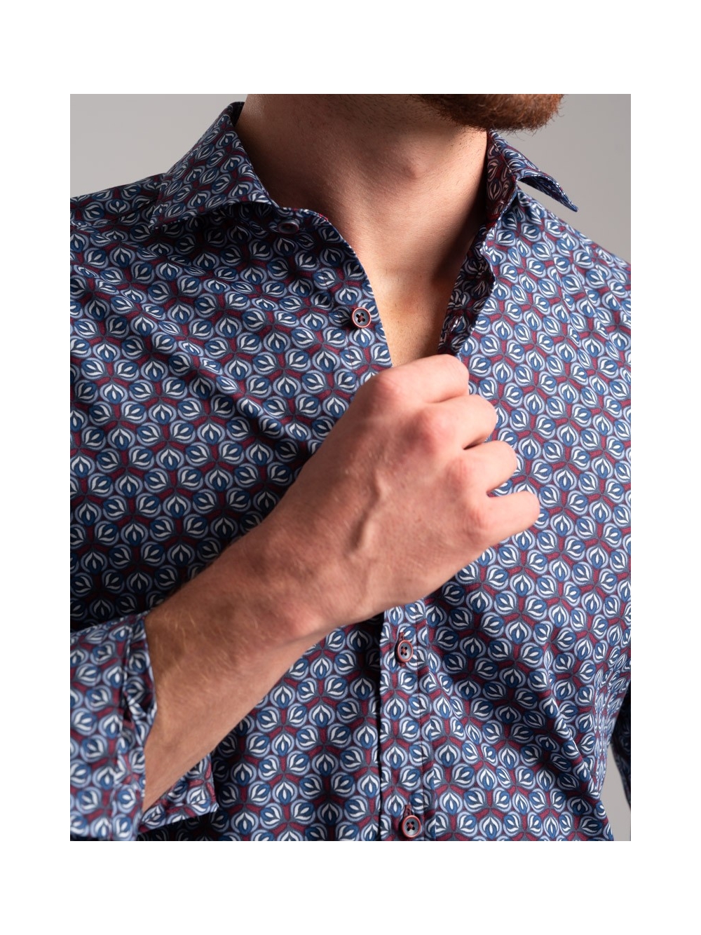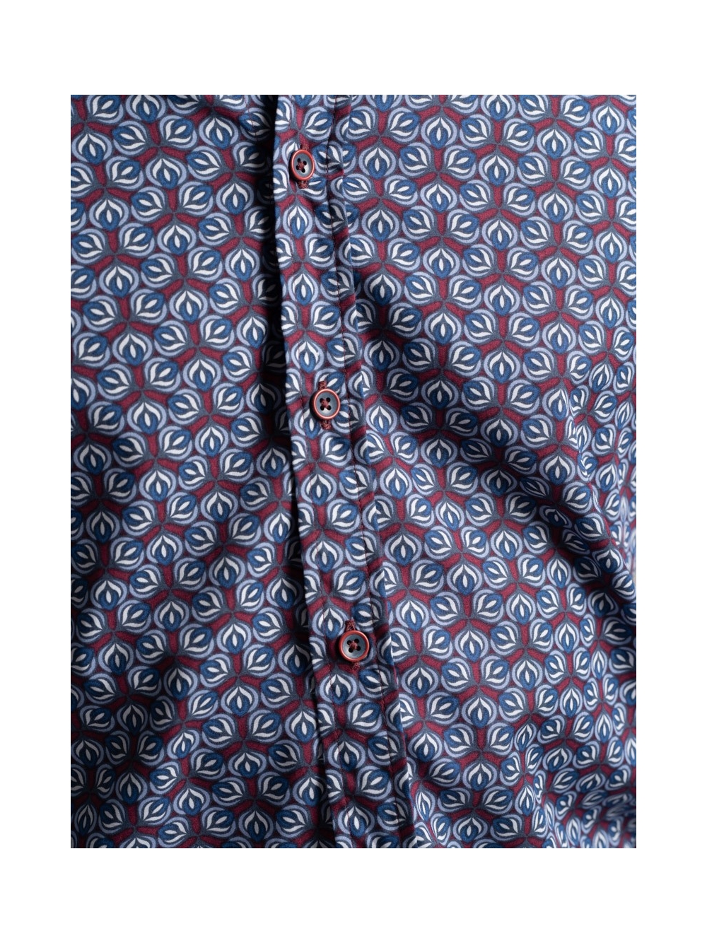 Camicia uomo fantasia stampa geometrica astratta in tessuto popeline, collo semi francese, con applicazione del nastro a contrasto nell'interno collo. Bottoni bicolor bordeaux e avio.