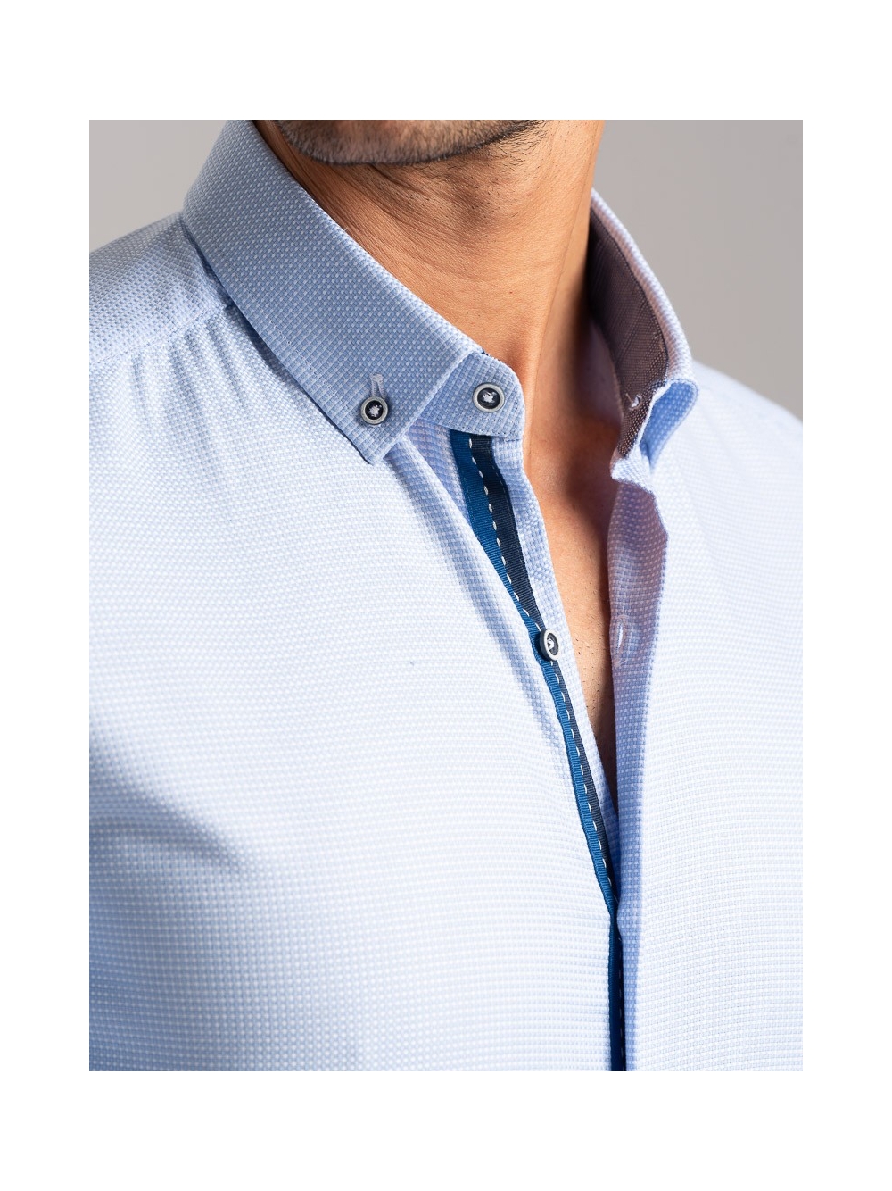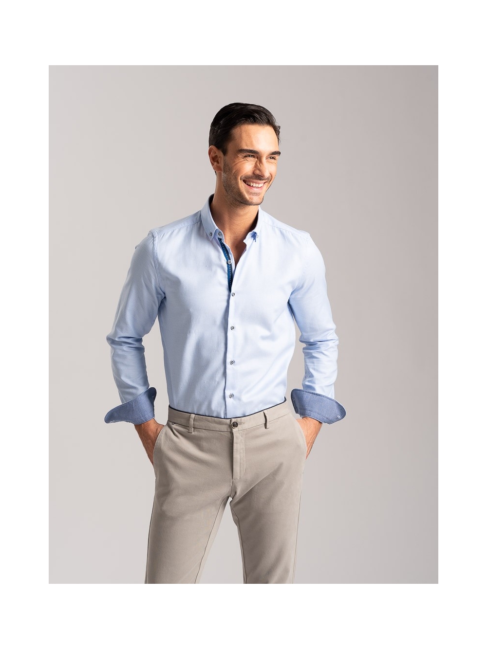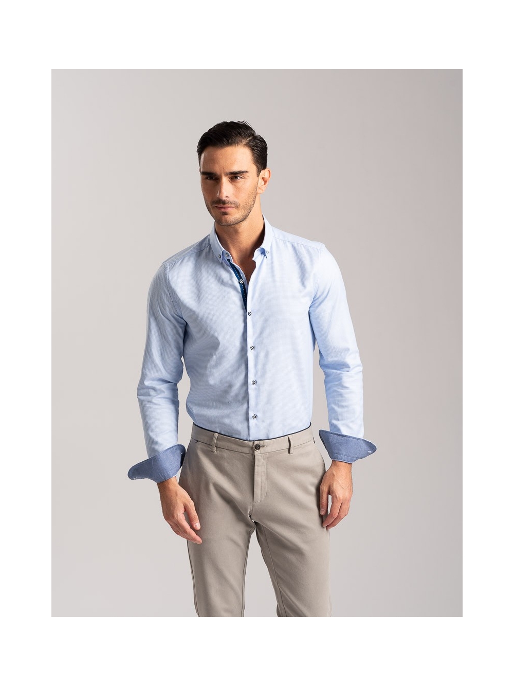 Camicia uomo tinta unita in tessuto armaturato, collo bottn down, realizzata con inserto collo e polsi con tessuto a contrasto e applicazione nastro colorato su canolo bottone. Bottoni blu vintage a contrasto