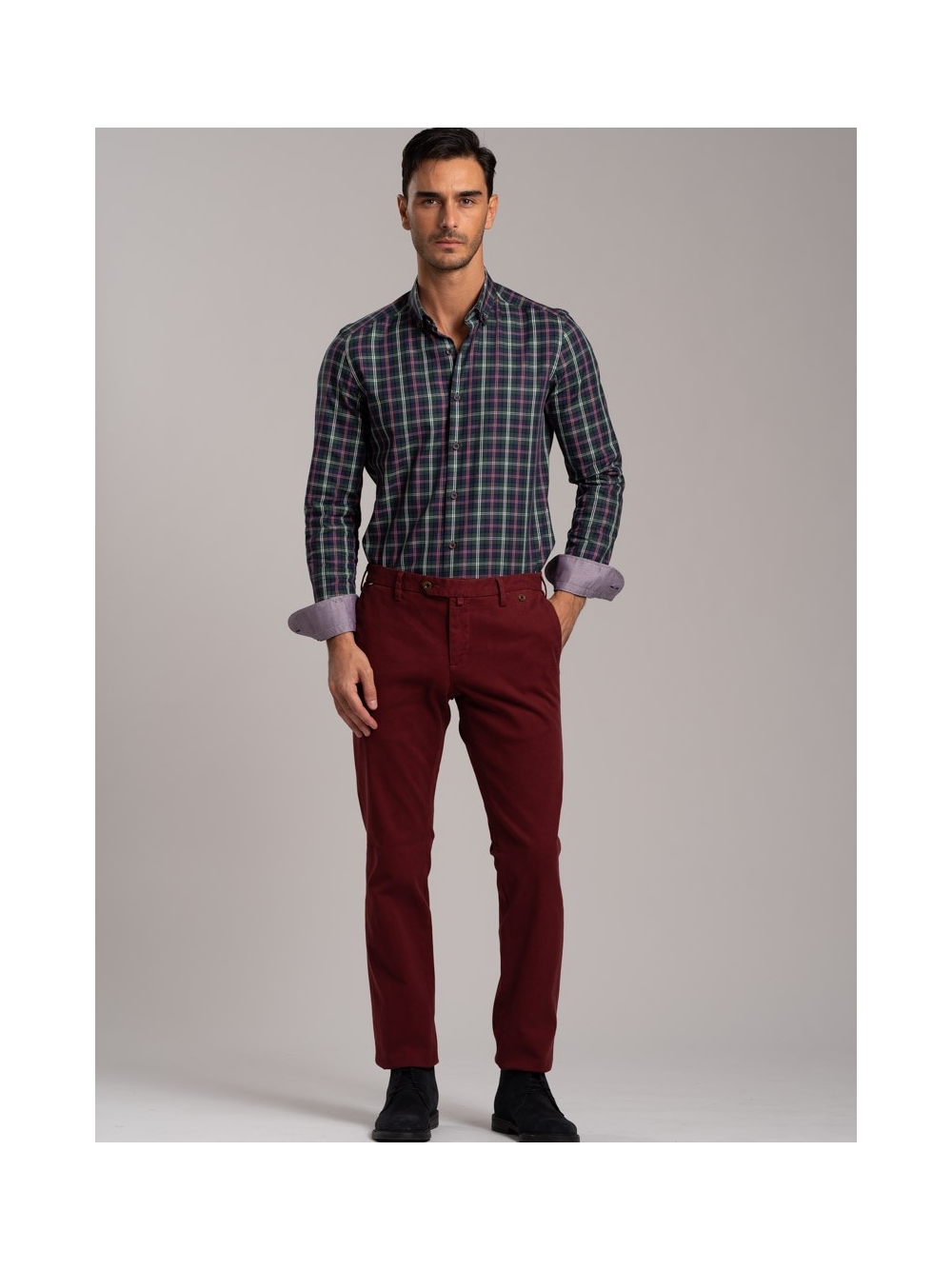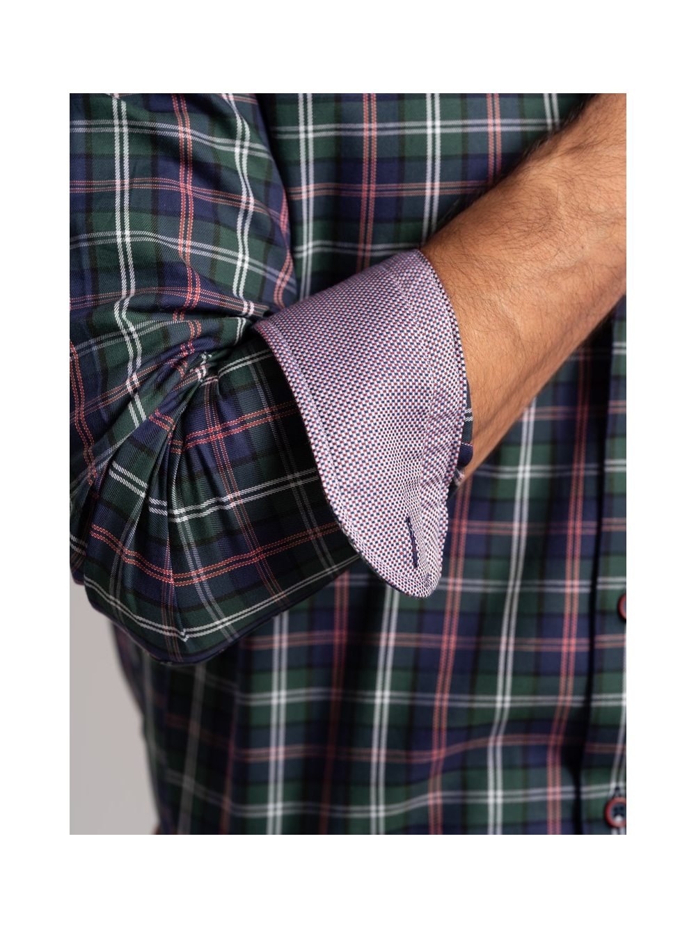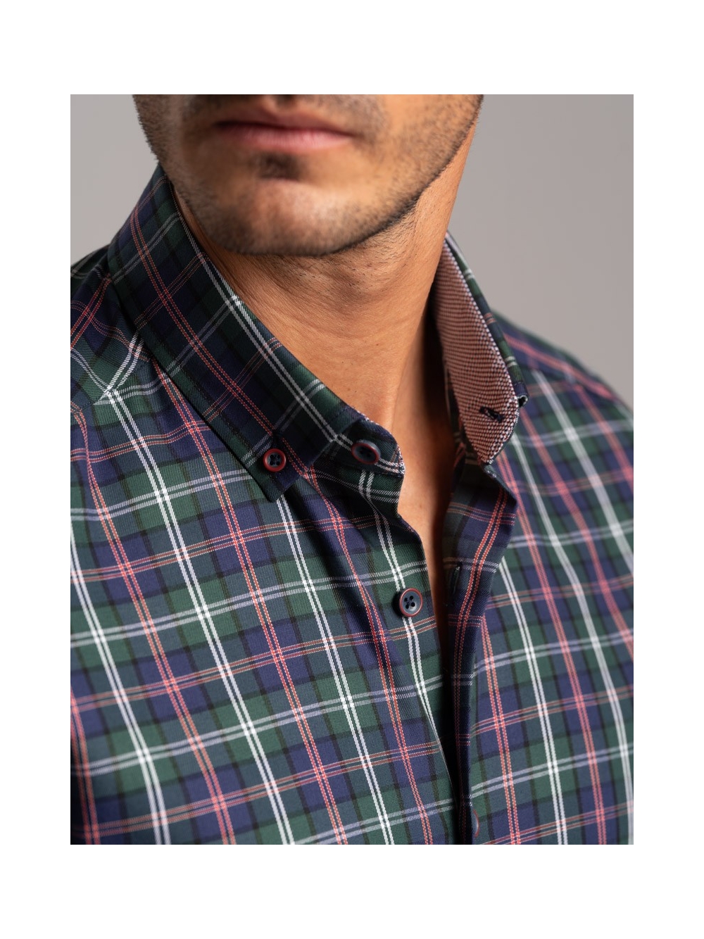 Camicia uomo madras multicolor in tessuto twill, collo botton down con interno collo e polsi a contrasto. Bottoni bicolor bordeaux avio.