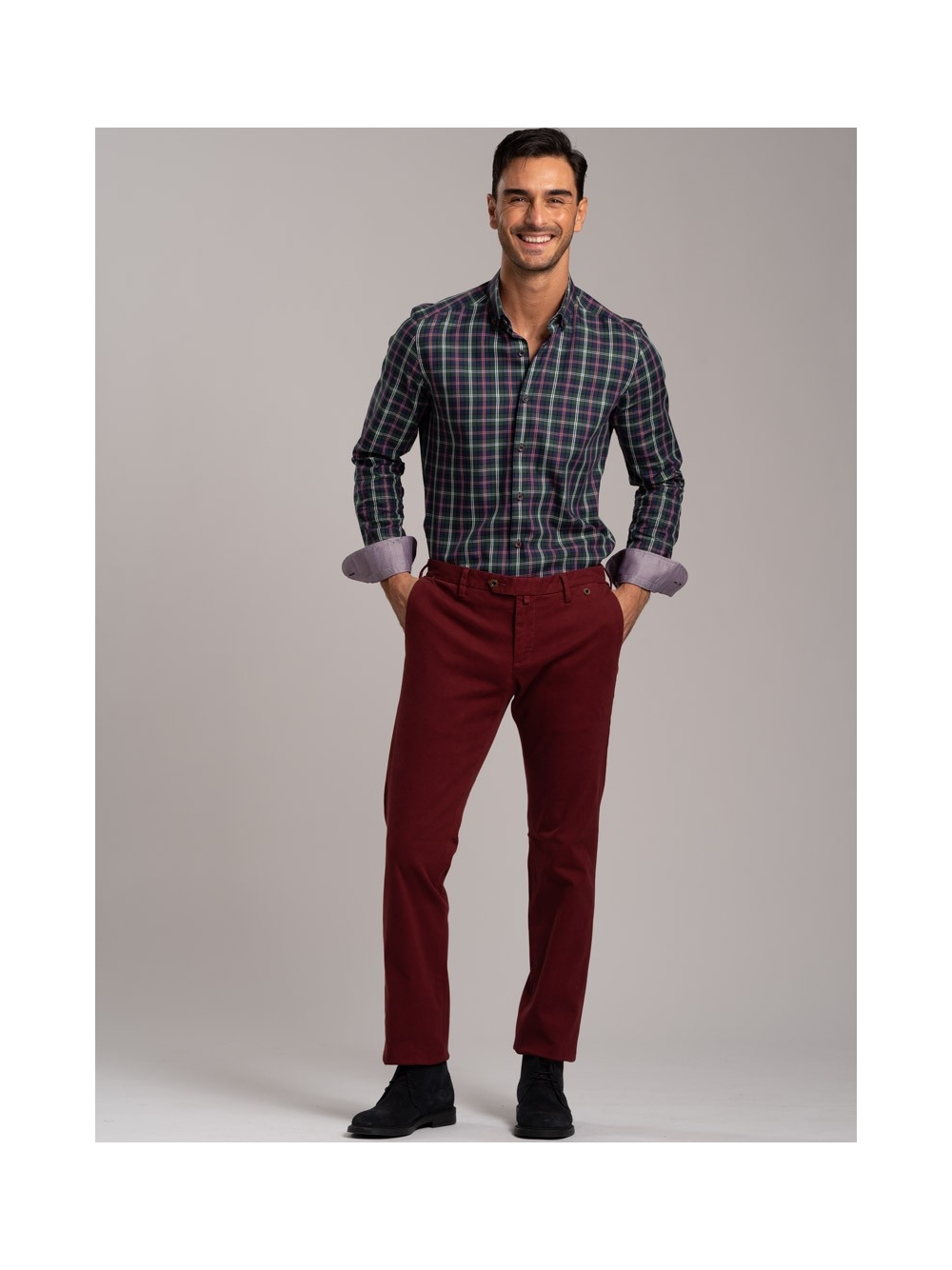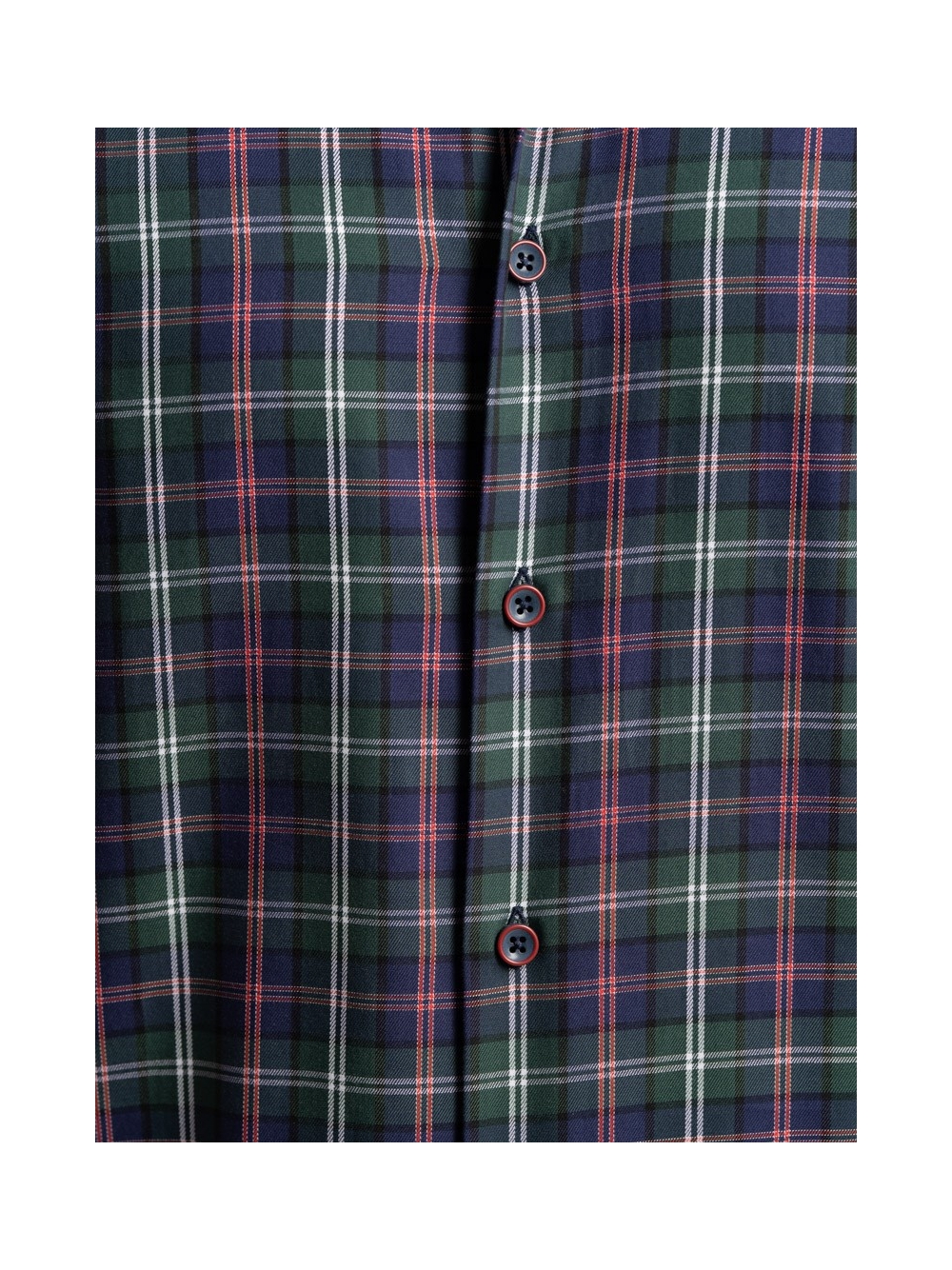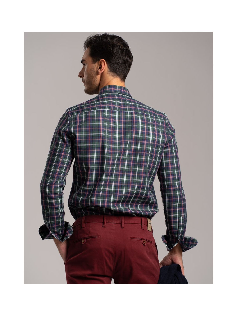 Camicia uomo madras multicolor in tessuto twill, collo botton down con interno collo e polsi a contrasto. Bottoni bicolor bordeaux avio.