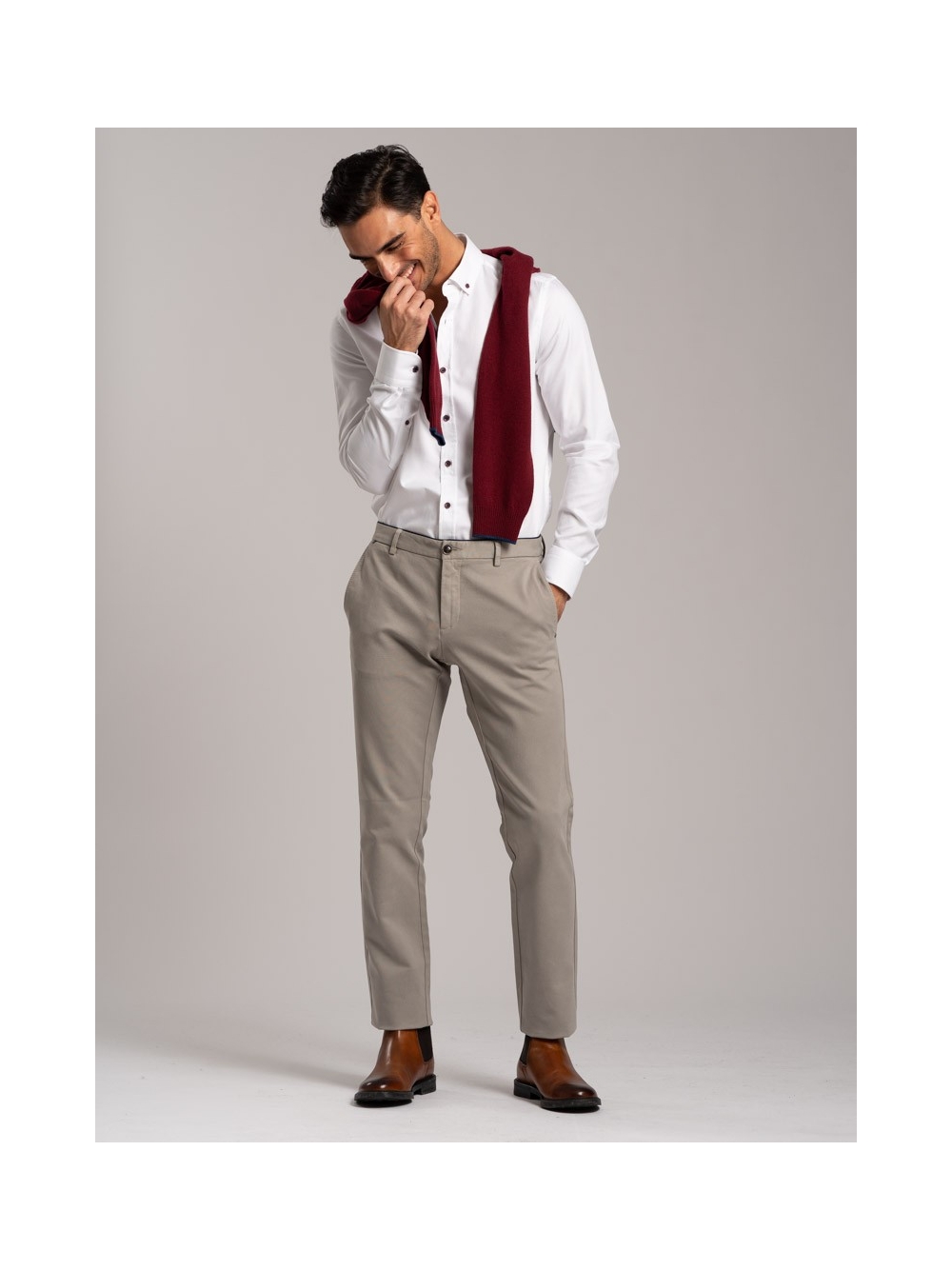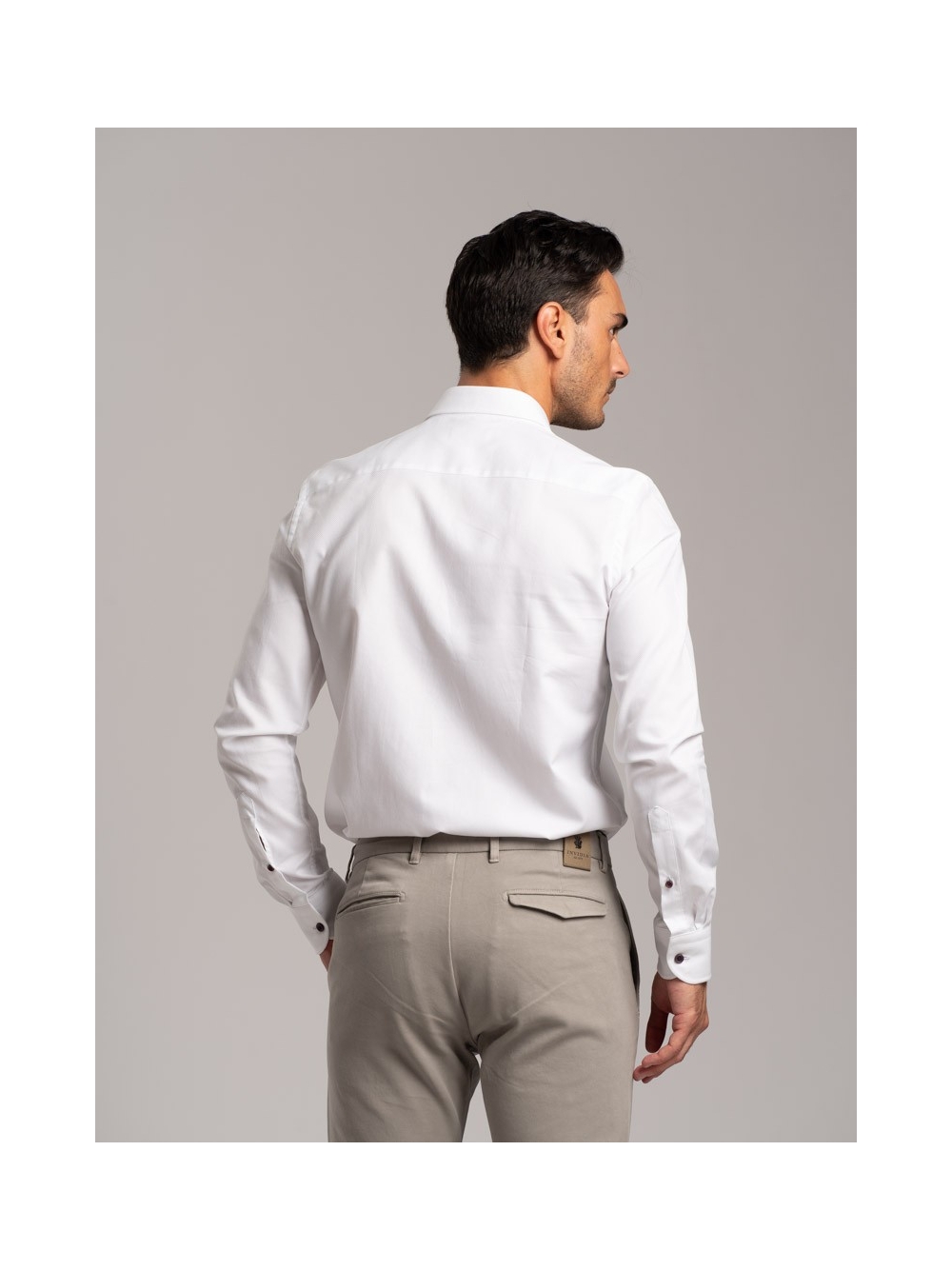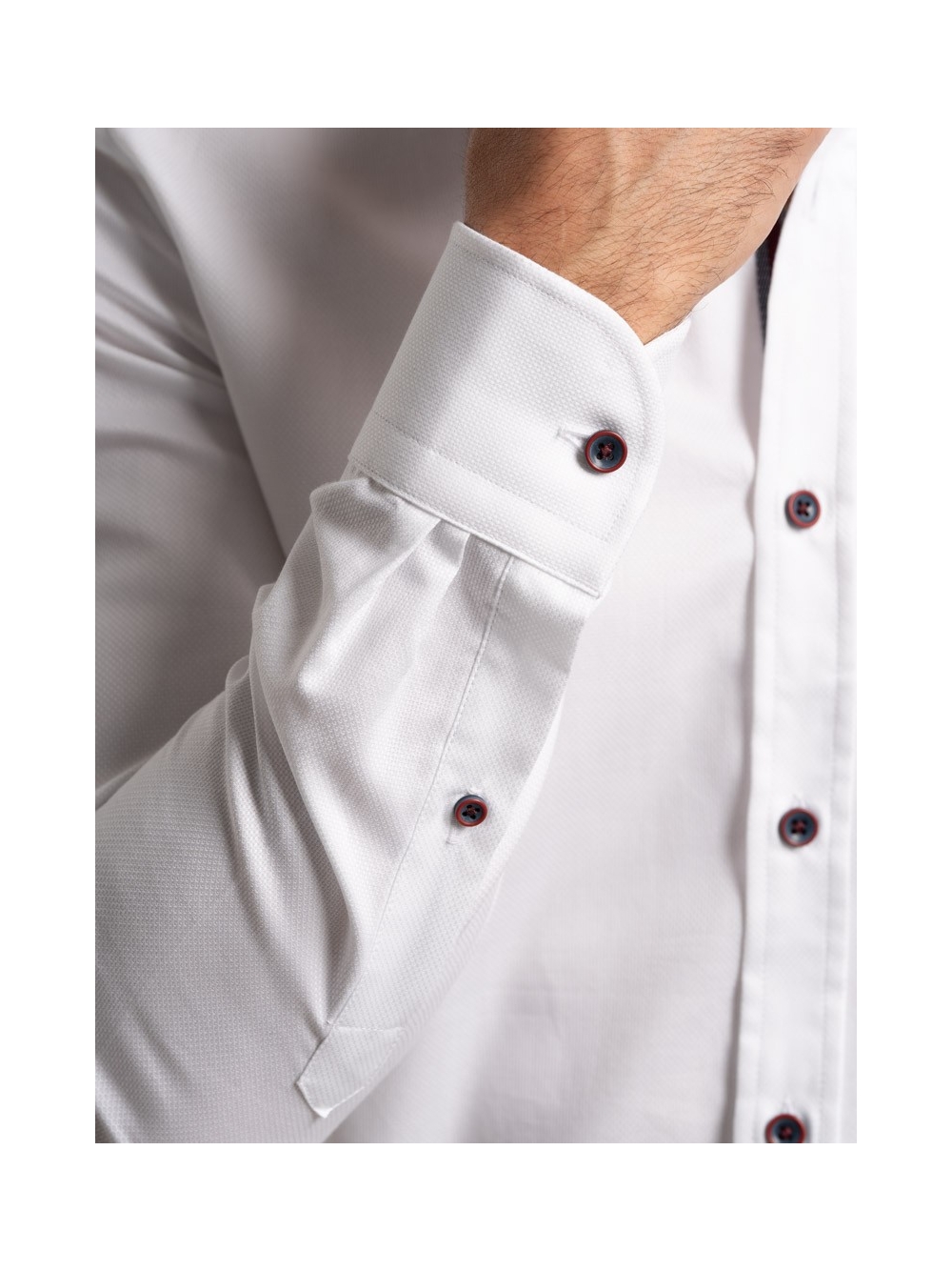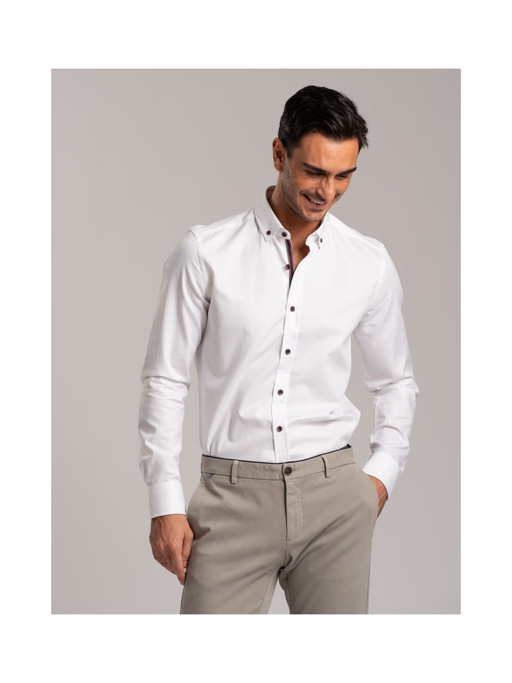 Camicia uomo tinta unita in tessuto armaturato, collo botton down, realizzata con applicazione nastro colorato su interno collo e canolo bottone. Bottoni bicolor bordeaux avio a contrasto.