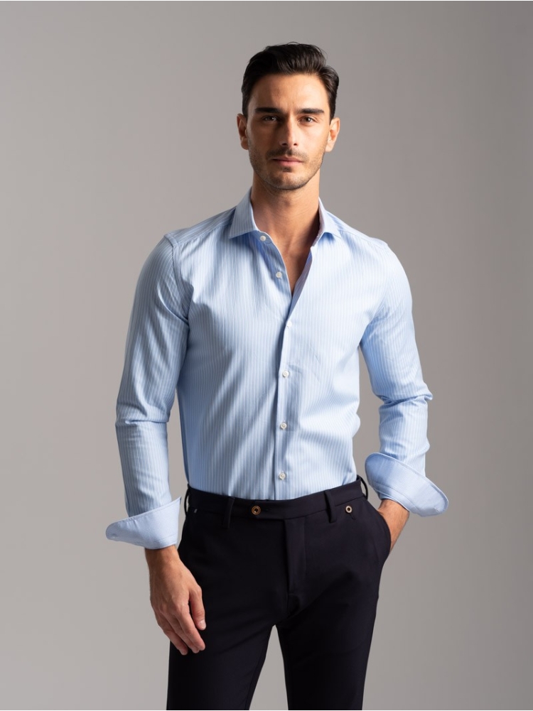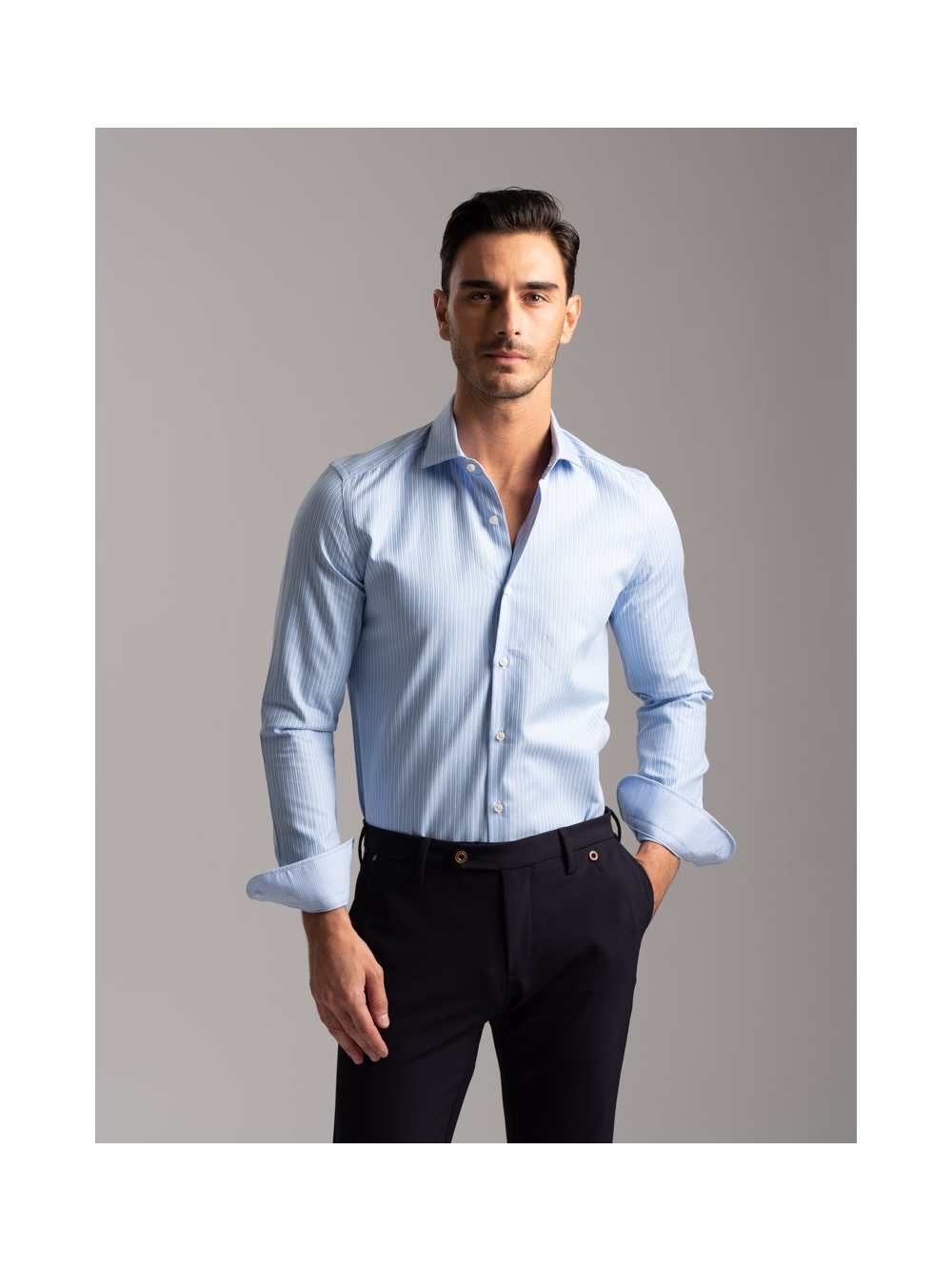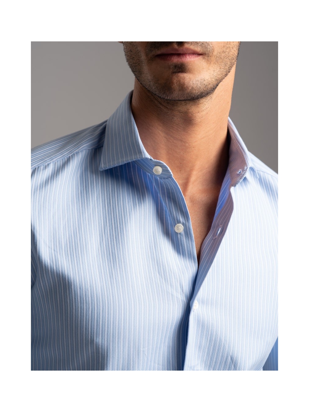 Camicia uomo rigata in tessuto twill micro spina pesce, collo semi francese con interno collo in tinta.