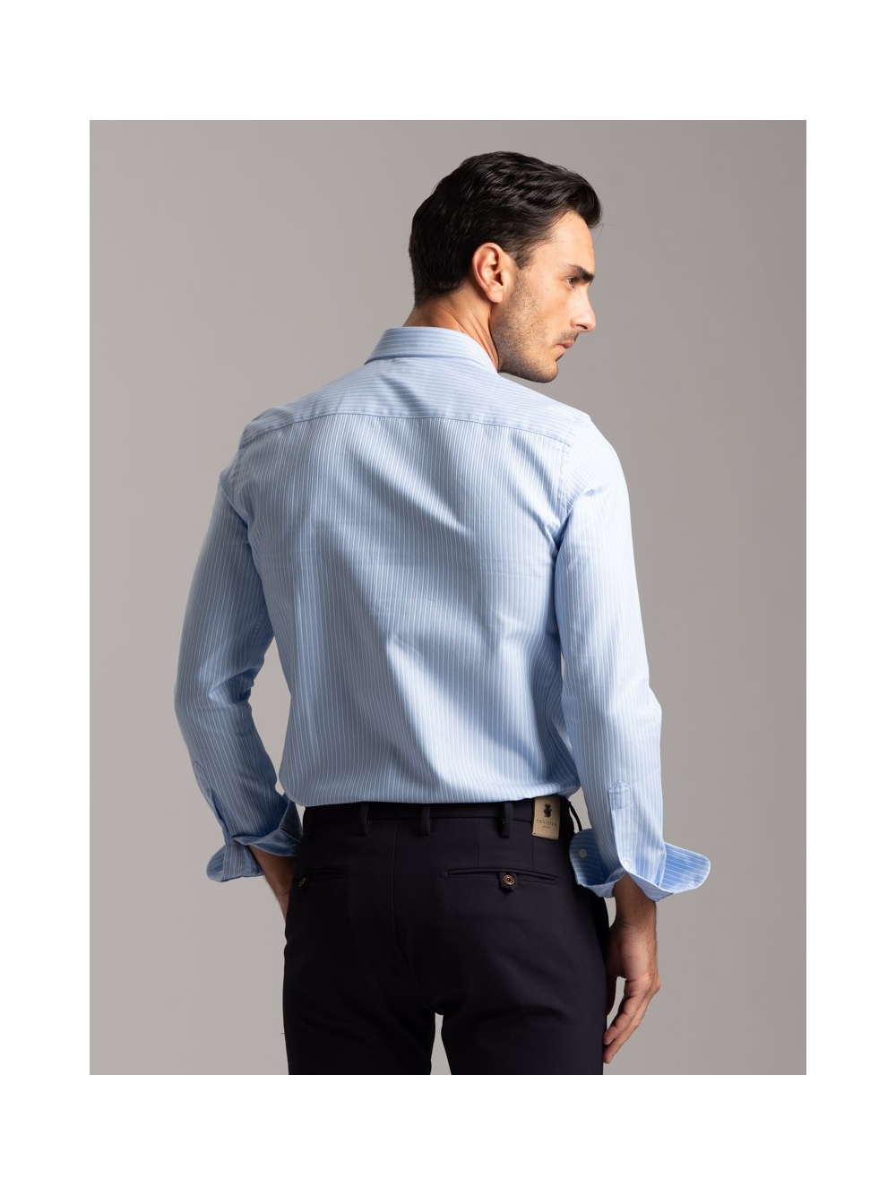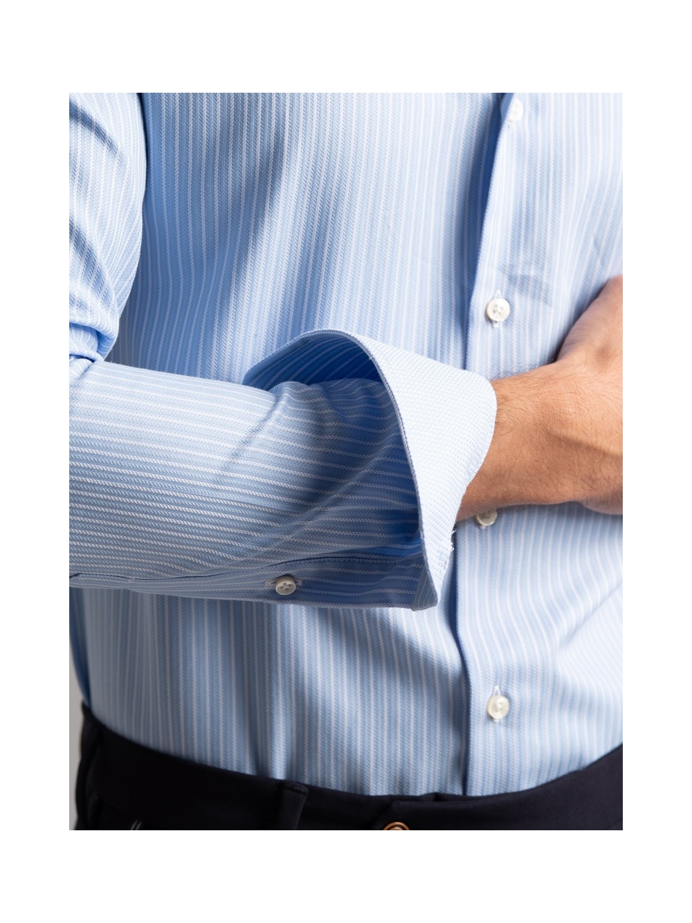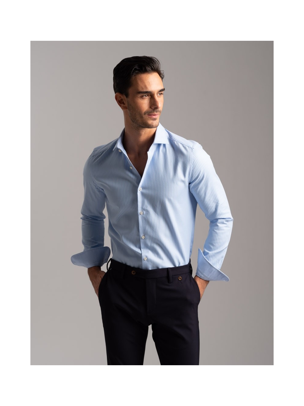 Camicia uomo rigata in tessuto twill micro spina pesce, collo semi francese con interno collo in tinta.