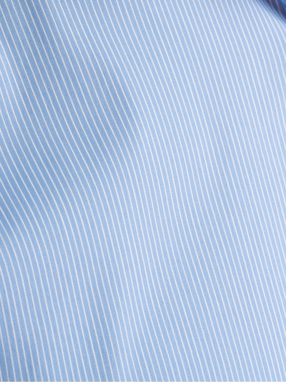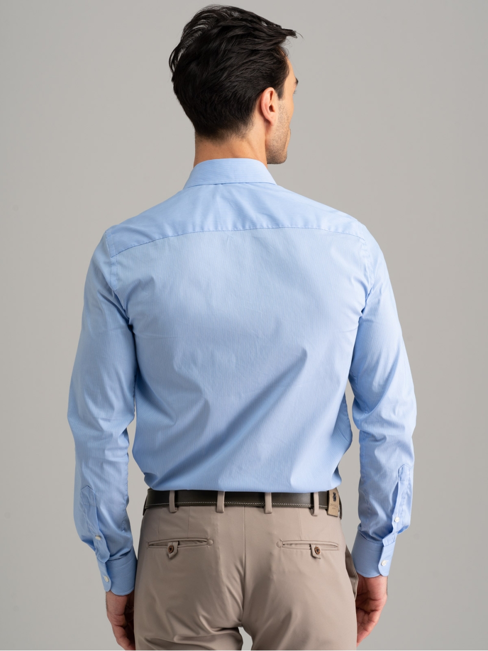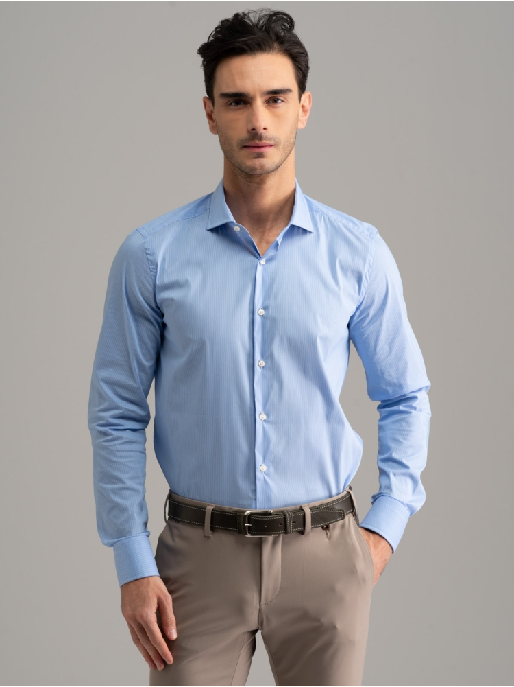 Camicia uomo a manica lunga, vestibilità slim e collo semi francese, in tessuto popeline stretch 100% cotone con micro riga azzurra.