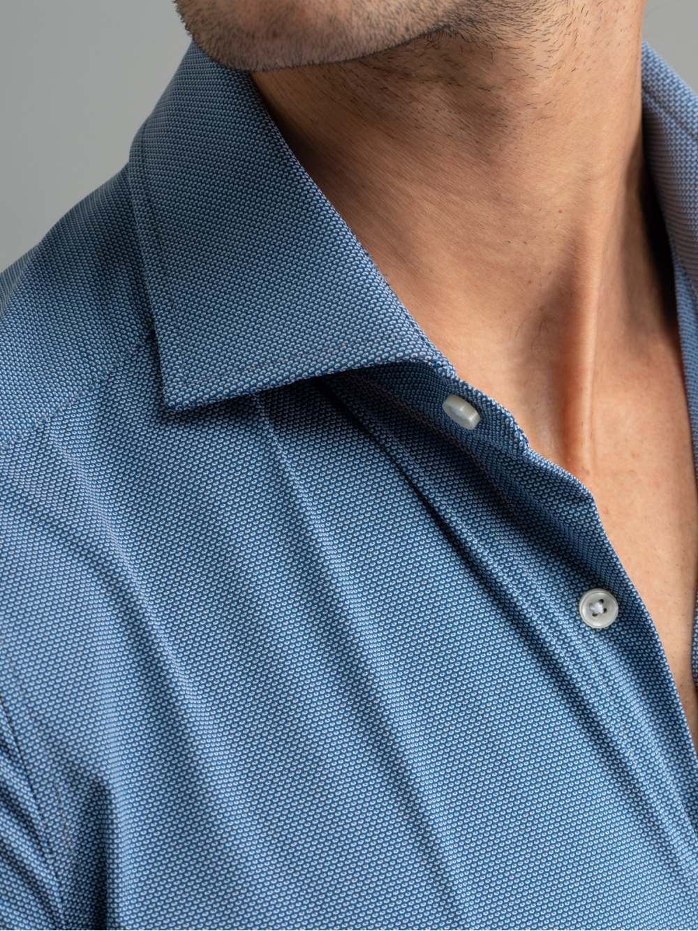 Camicia uomo a manica lunga, con collo semi francese, realizzata in tessuto TECNO armaturato tinta unita azzurro melange. I tessuti della linea TECNO sono altamente performanti e assicurano: elasticità e resistenza, perfetta vestibilità, traspirabilità e leggerezza, controllo termico, rapida asciugatura e stiro facile.