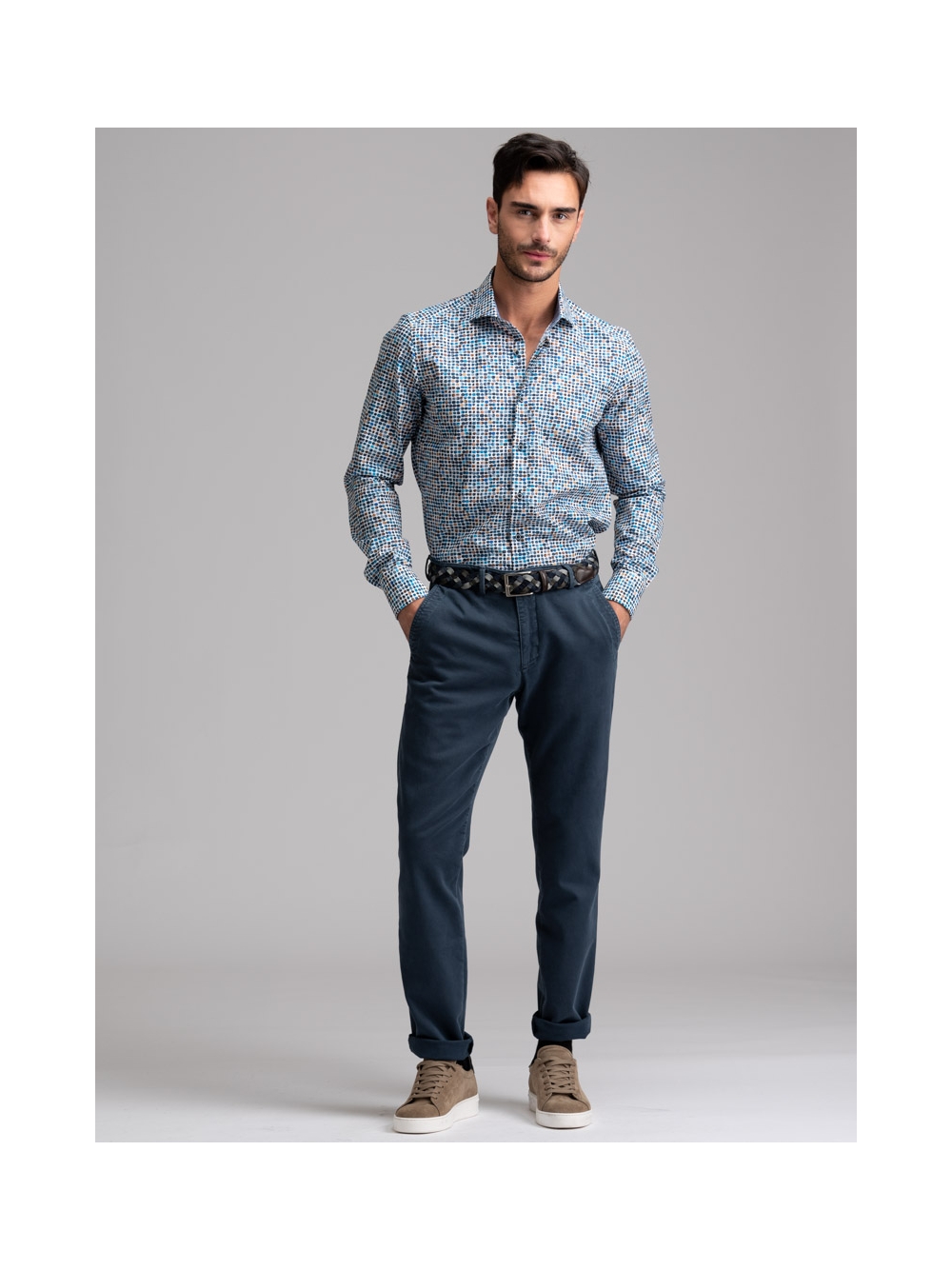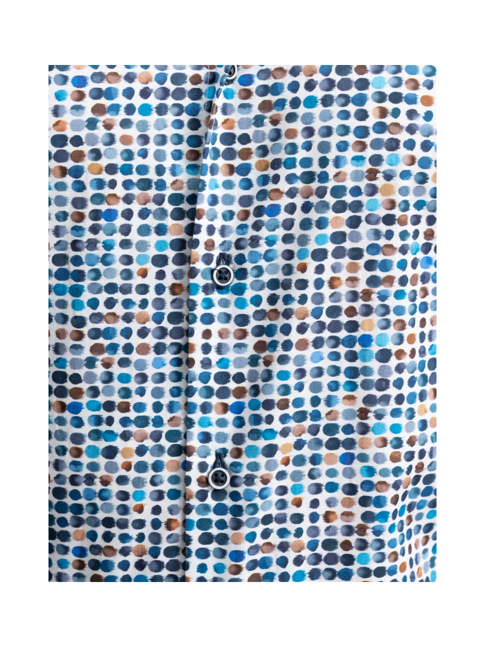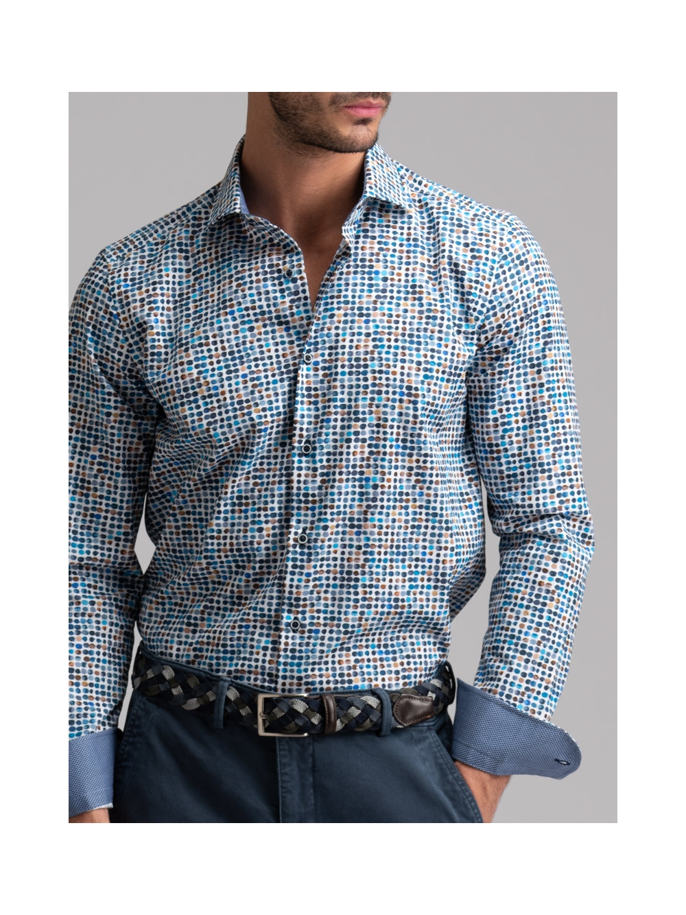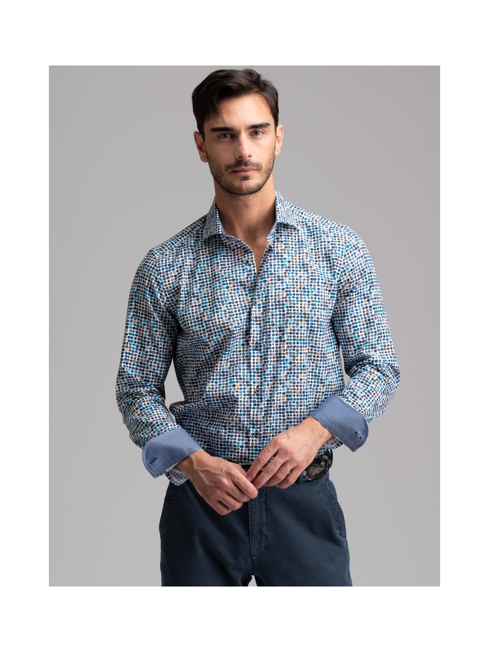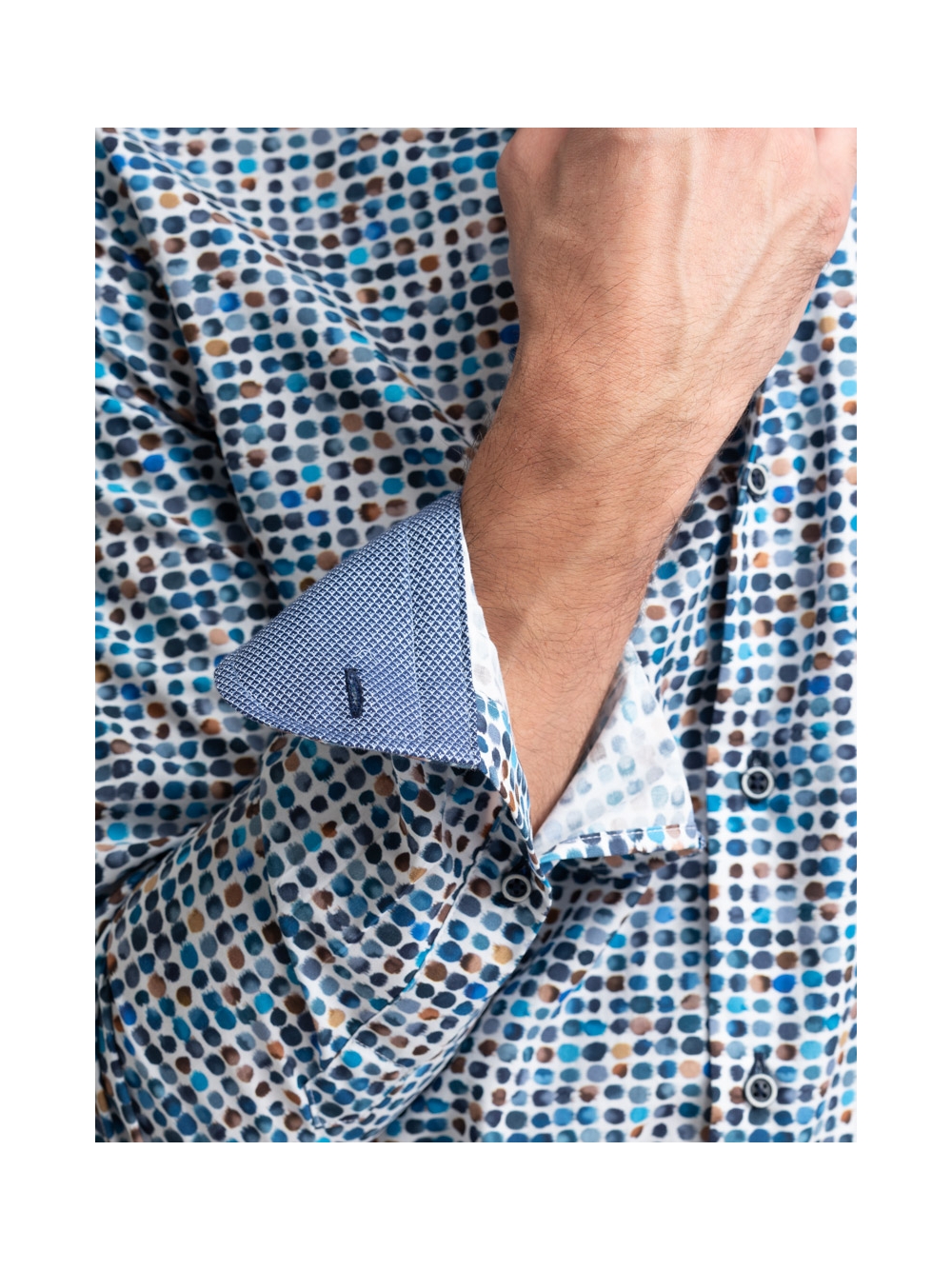 Camicia uomo con collo semi francese realizzata in tessuto base popeline con stampa micro pois. La camicia è arricchita da un’applicazione in tessuto micro fantasia blu e avio nell’interno collo e polsi e bottoni blu. Con la manica lunga e una vestibilità slim, questa è una camicia casual per una moda uomo ricercata.