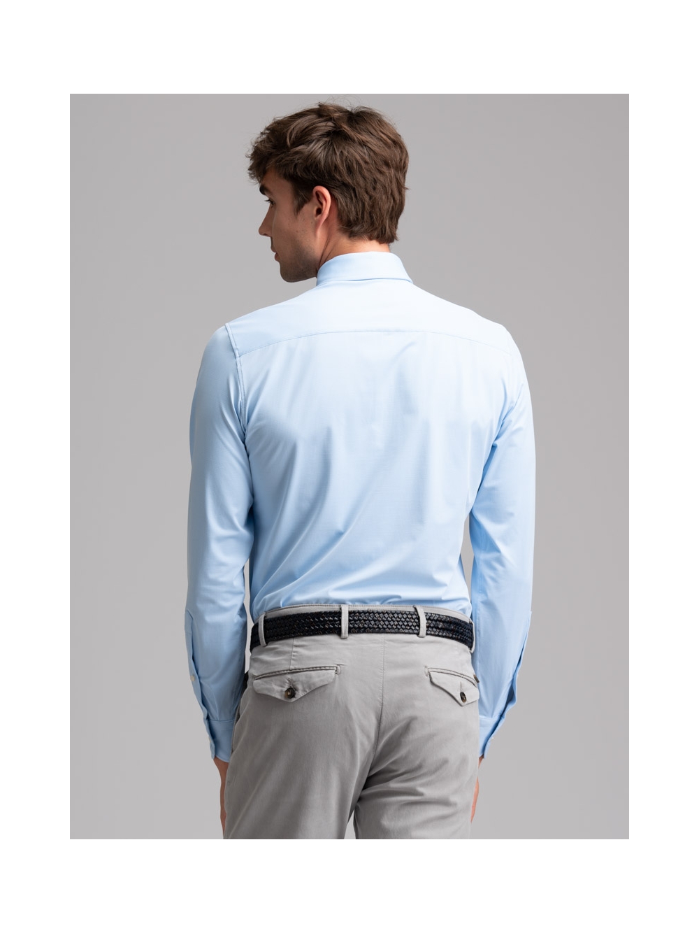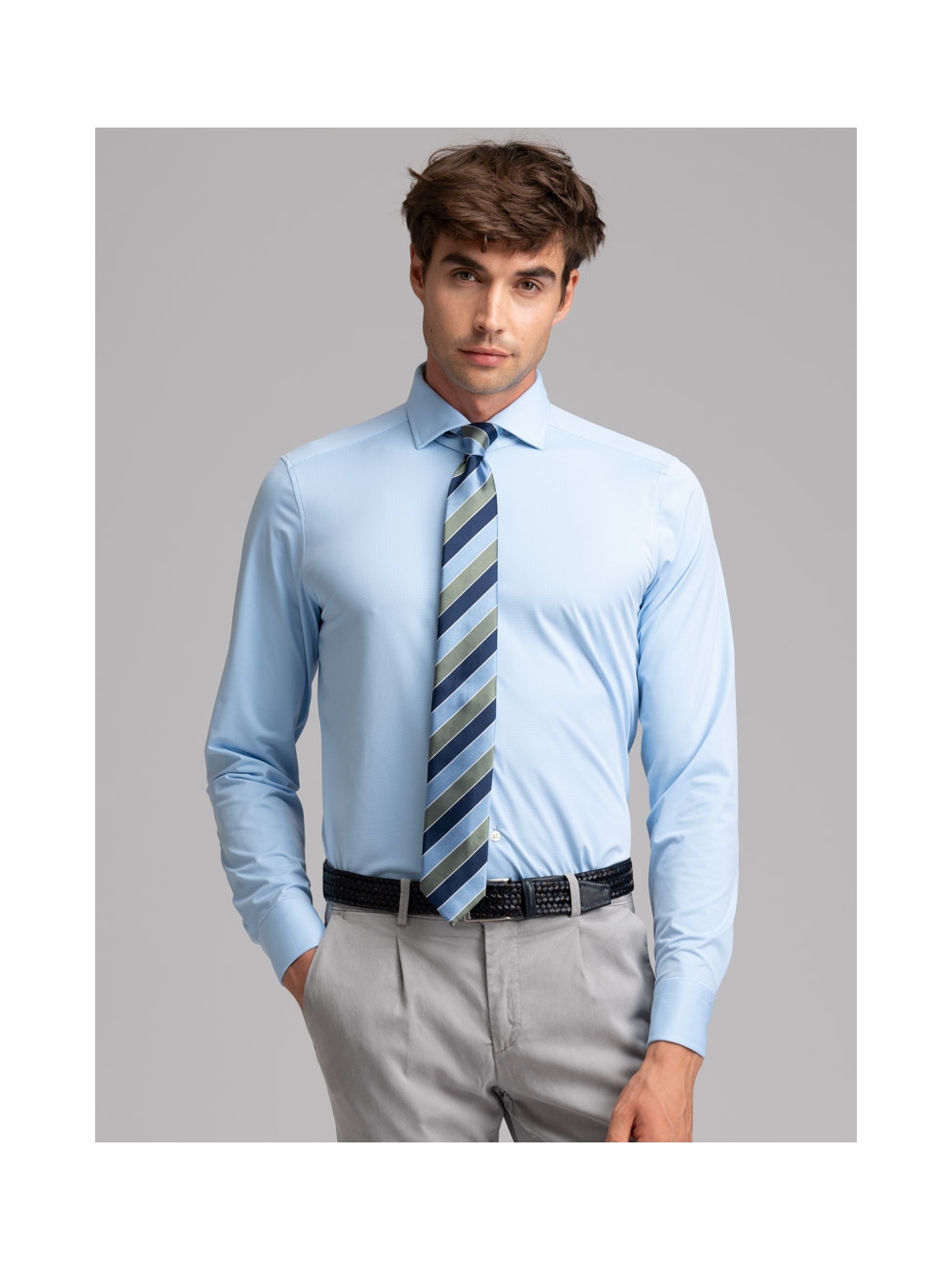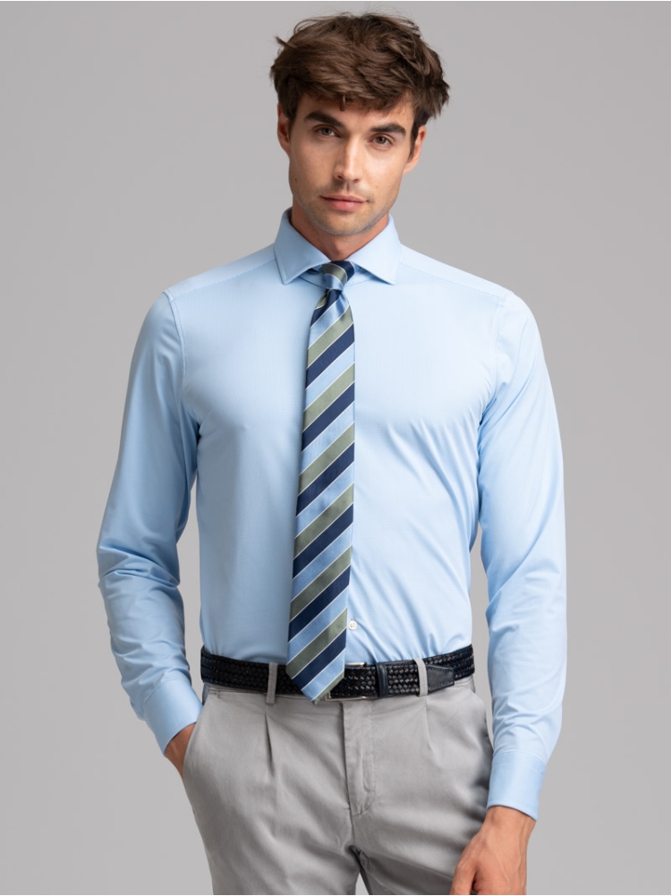 Camicia uomo a manica lunga realizzata in tessuto TECNO azzurro con armatura a micro quadretto e collo semi francese.