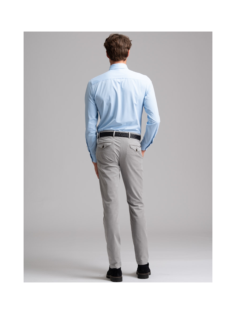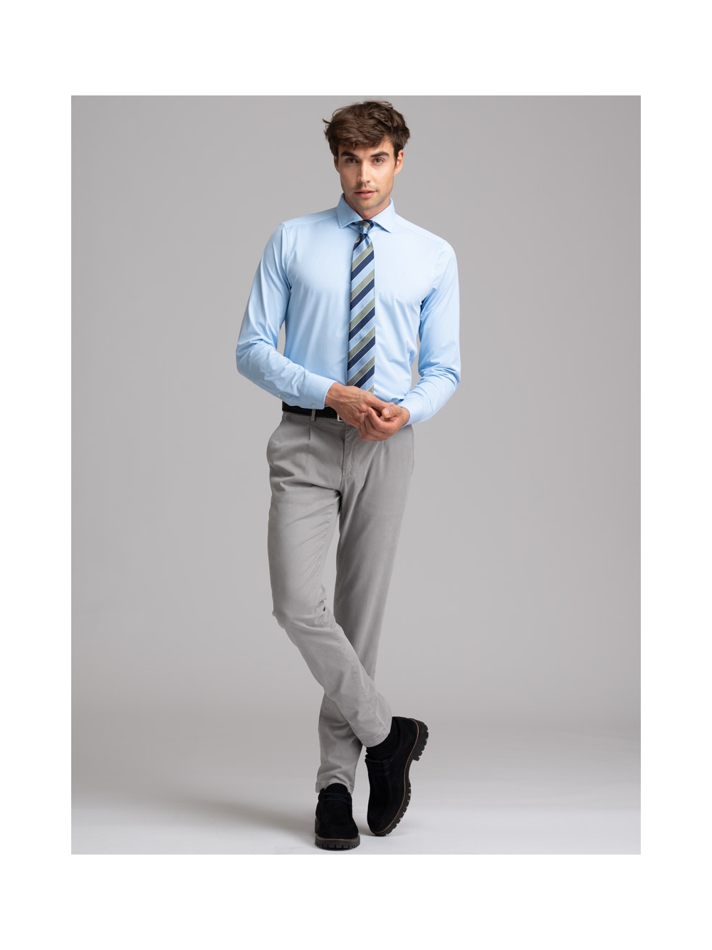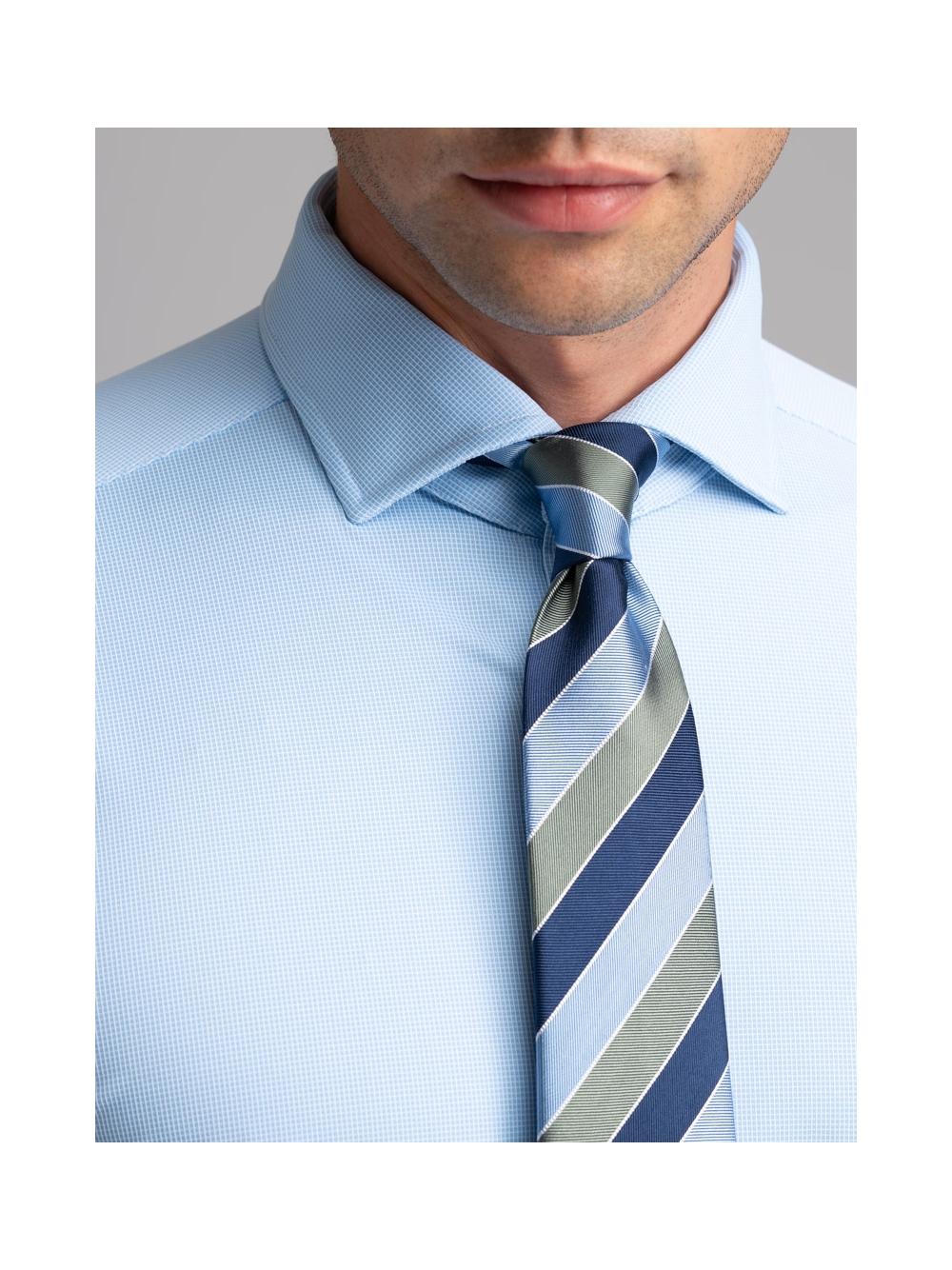 Camicia uomo a manica lunga realizzata in tessuto TECNO azzurro con armatura a micro quadretto e collo semi francese.