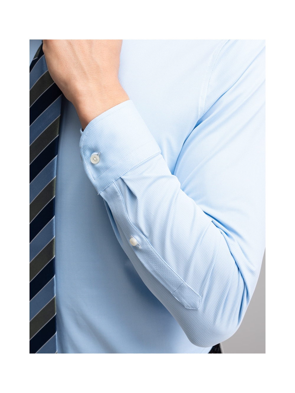 Camicia uomo a manica lunga, con collo semi francese, realizzata in tessuto TECNO armaturato con fantasia a micro quadretto colore azzurro. I tessuti della linea TECNO sono altamente performanti e assicurano: elasticità e resistenza, perfetta vestibilità, traspirabilità e leggerezza, controllo termico, rapida asciugatura e stiro facile.