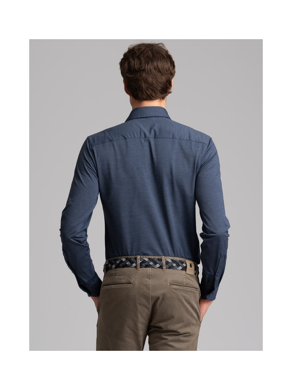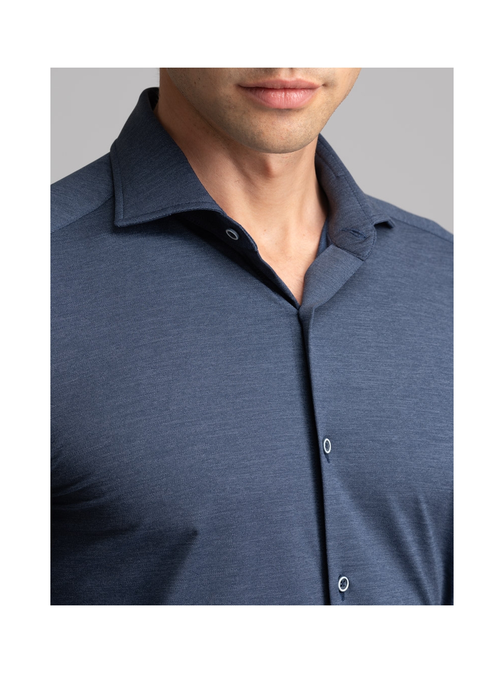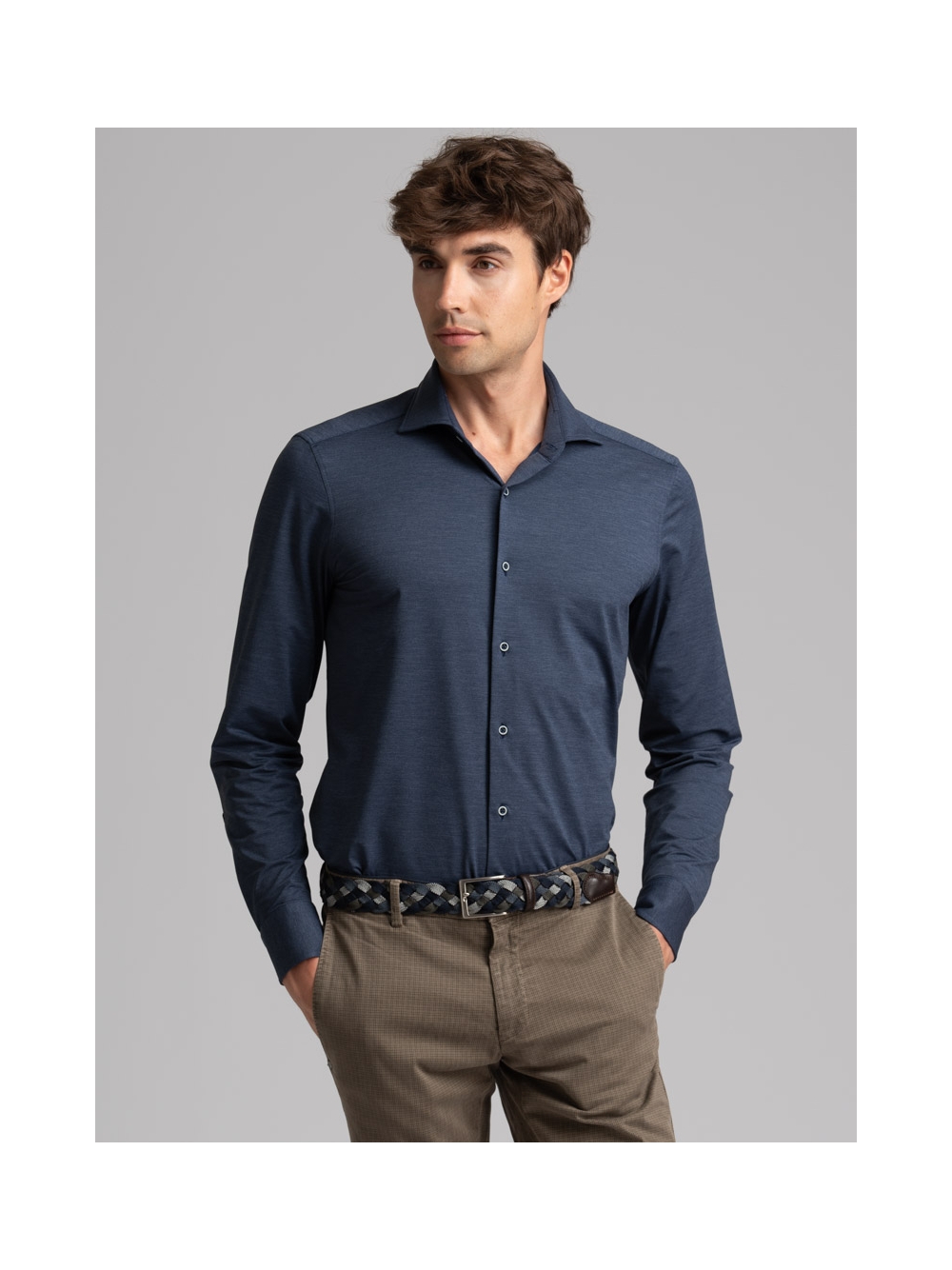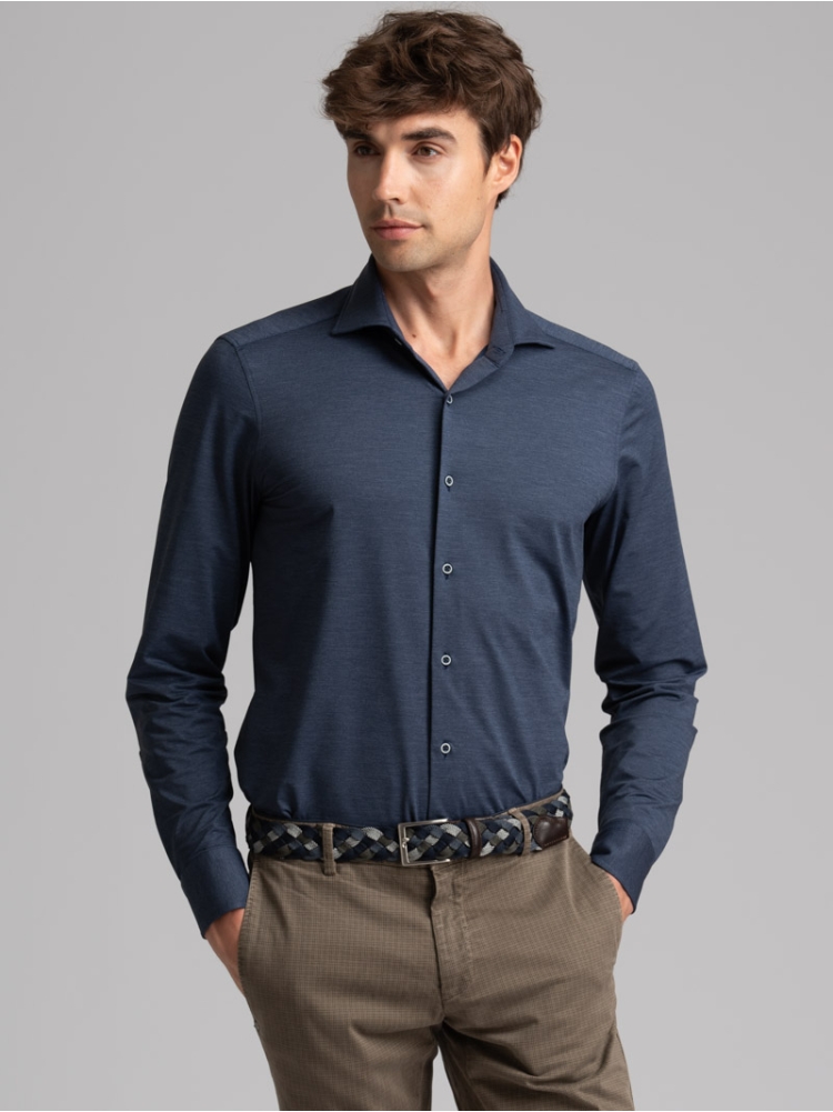 Camicia uomo a manica lunga realizzata in tessuto TECNO blu mélange con collo semi francese.
