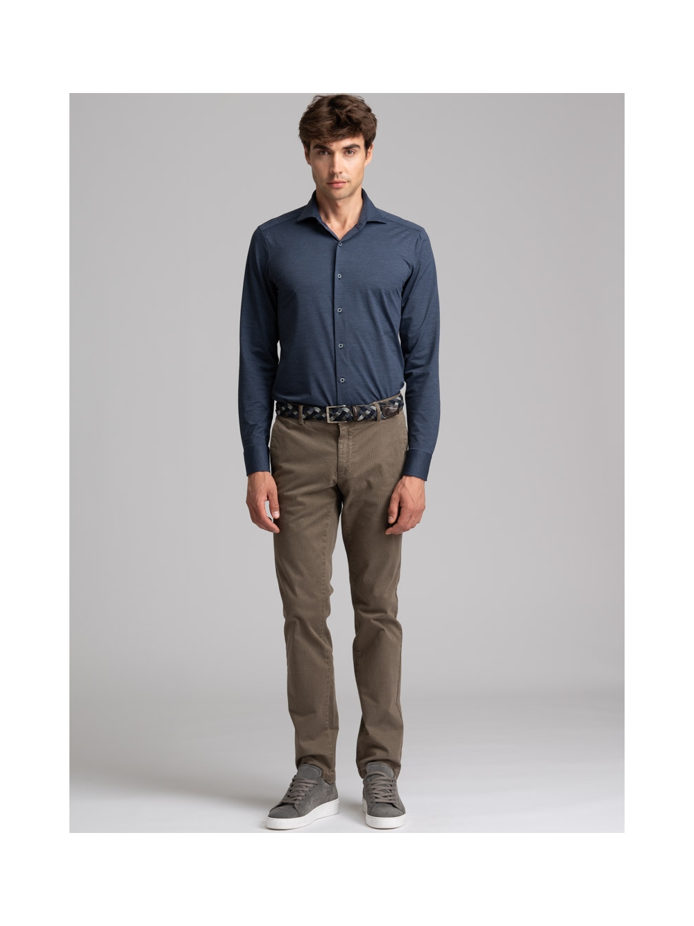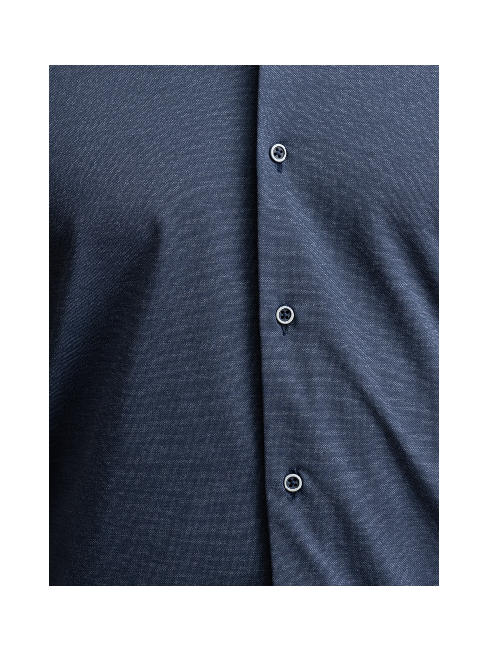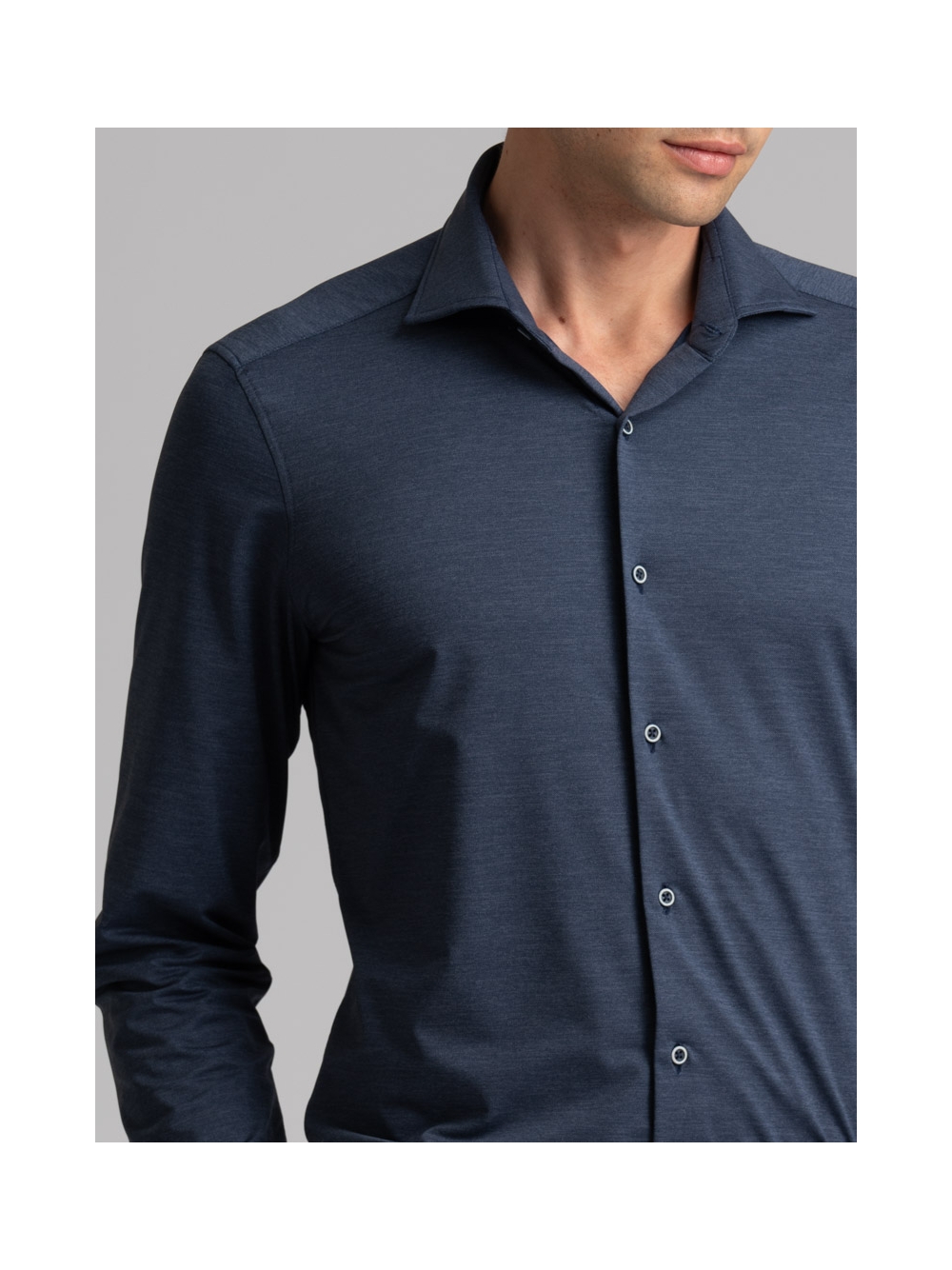 Camicia uomo a manica lunga, con collo semi francese, realizzata in tessuto TECNO tinta unita blu mélange. I tessuti della linea TECNO sono altamente performanti e assicurano: elasticità e resistenza, perfetta vestibilità, traspirabilità e leggerezza, controllo termico, rapida asciugatura e stiro facile.
