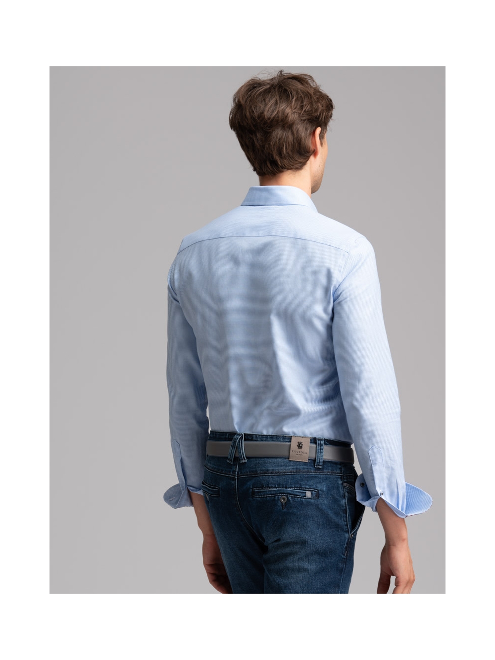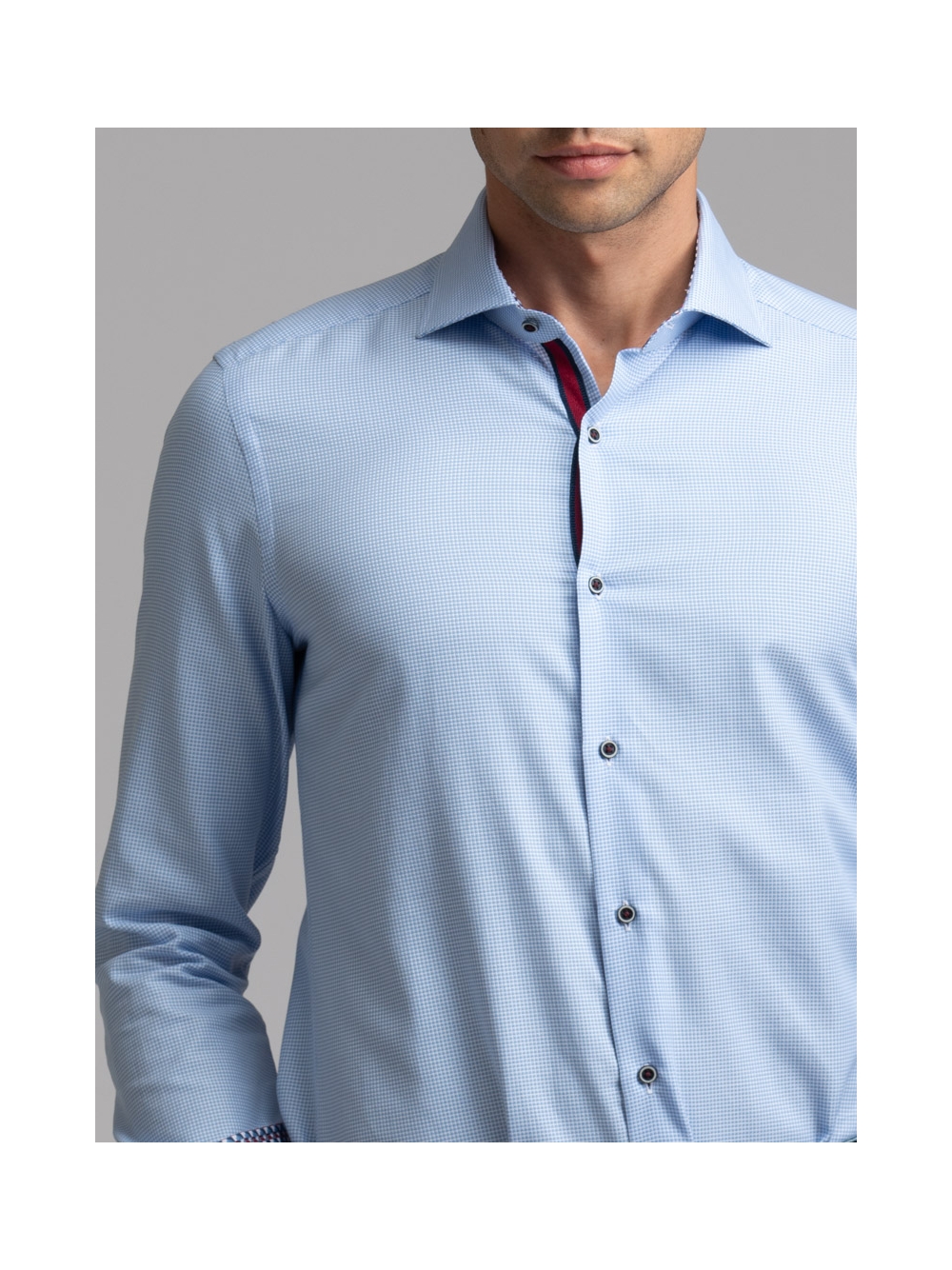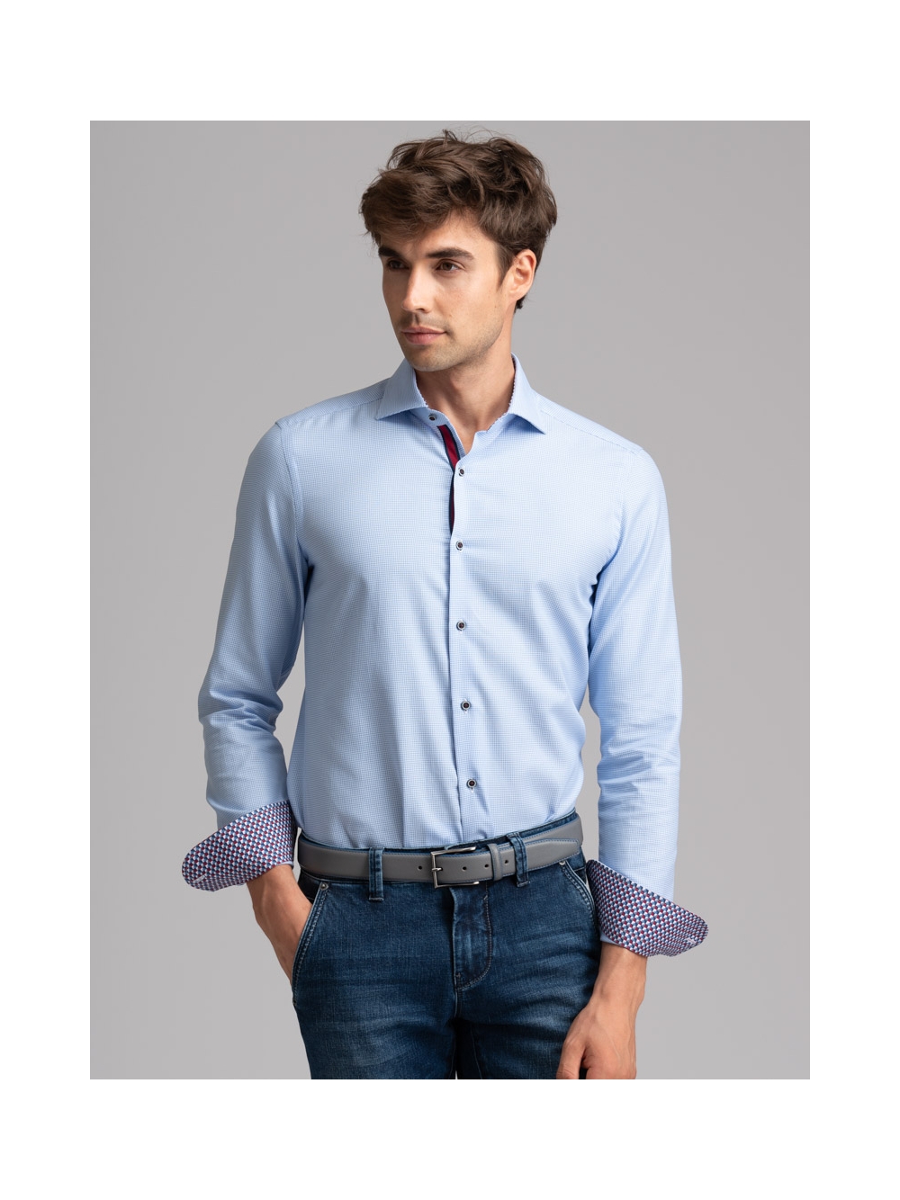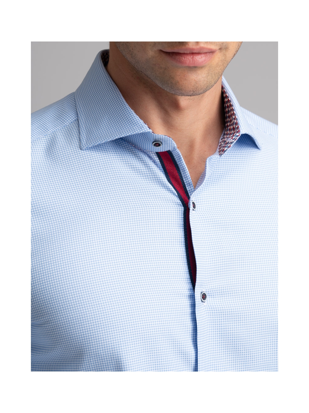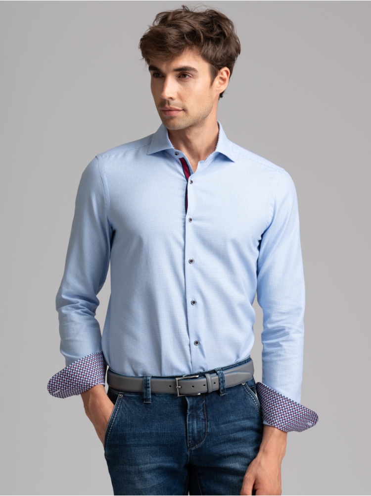 Camicia uomo con collo semi francese realizzata in tessuto armaturato azzurro con bottoni, mosca e inserti di tessuto a contrasto.