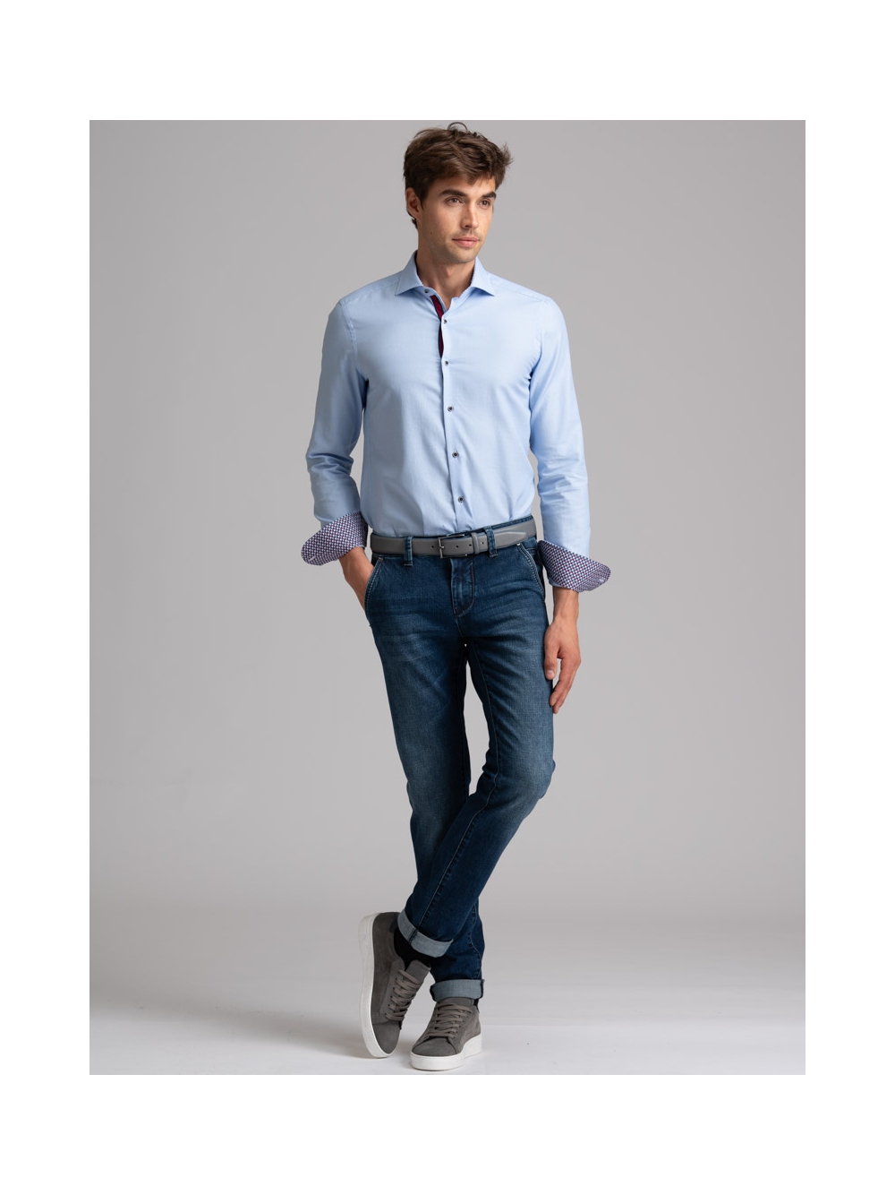 Camicia uomo azzurra in tessuto armaturato con collo semi francese e raffinati bottoni color blu a contrasto. La camicia è arricchita da inserti in tessuto fantasia a contrasto nell'interno collo, polsini e sulla mosca, e un nastro bicolore lungo il canolo dei bottoni. Con la manica lunga e una vestibilità slim, questa è una camicia casual per una moda uomo ricercata.