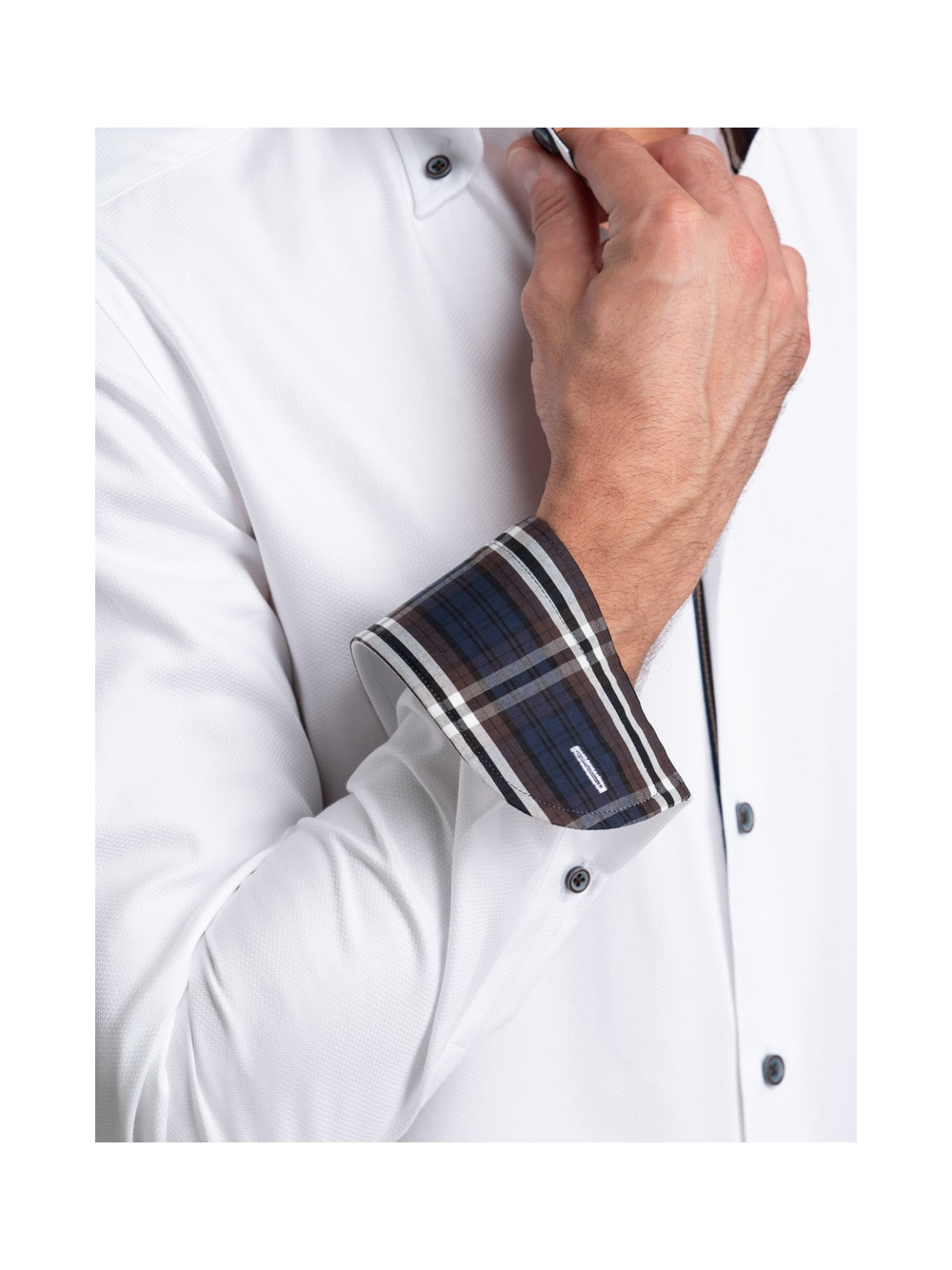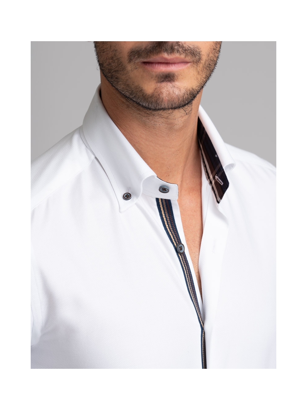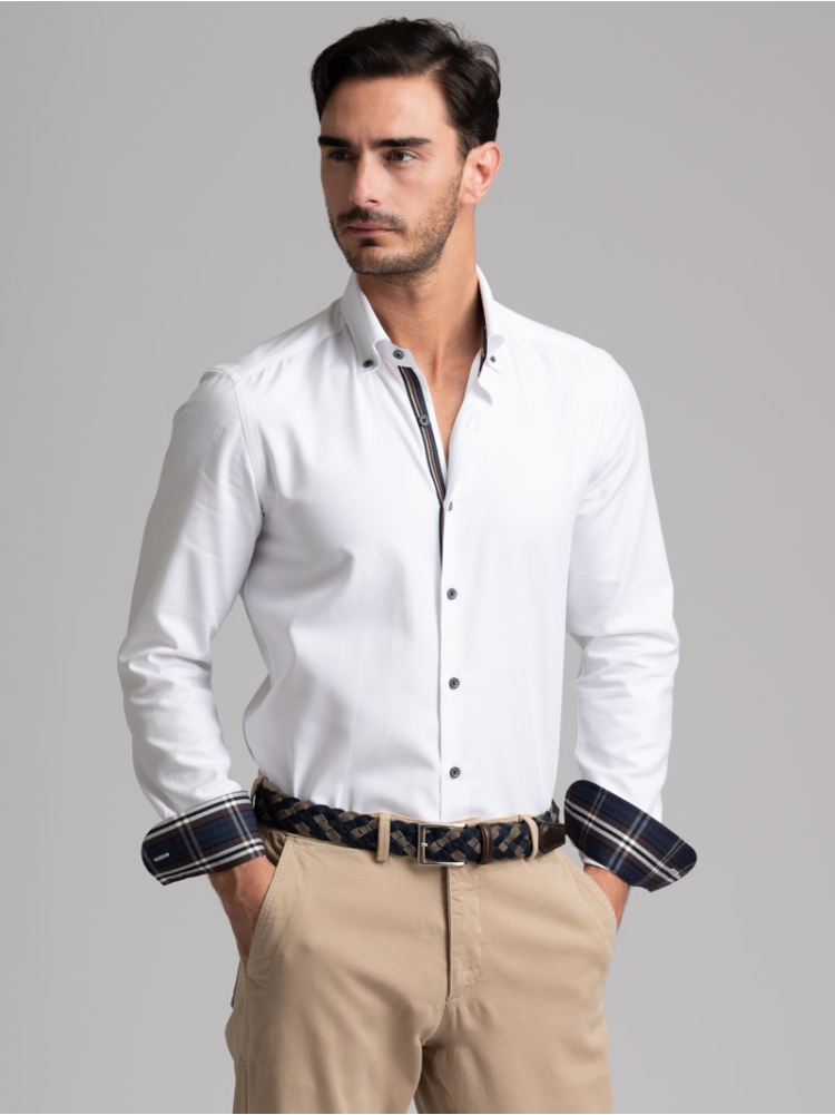 Camicia uomo realizzata in tessuto bianco micro armaturato con collo button down. La camicia è arricchita da un nastro di tessuto fantasia madras a contrasto - nei toni del blu, nero, bianco e marrone - nell’interno collo e polsi, con mosca abbinata. Sul canolo bottoni sono presenti un nastro decorativo degli stessi colori dell’inserto tessuto e bottoni a contrasto bicolore, moro e avio. Con la manica lunga e una vestibilità slim, questa è una camicia casual per una moda uomo ricercata.