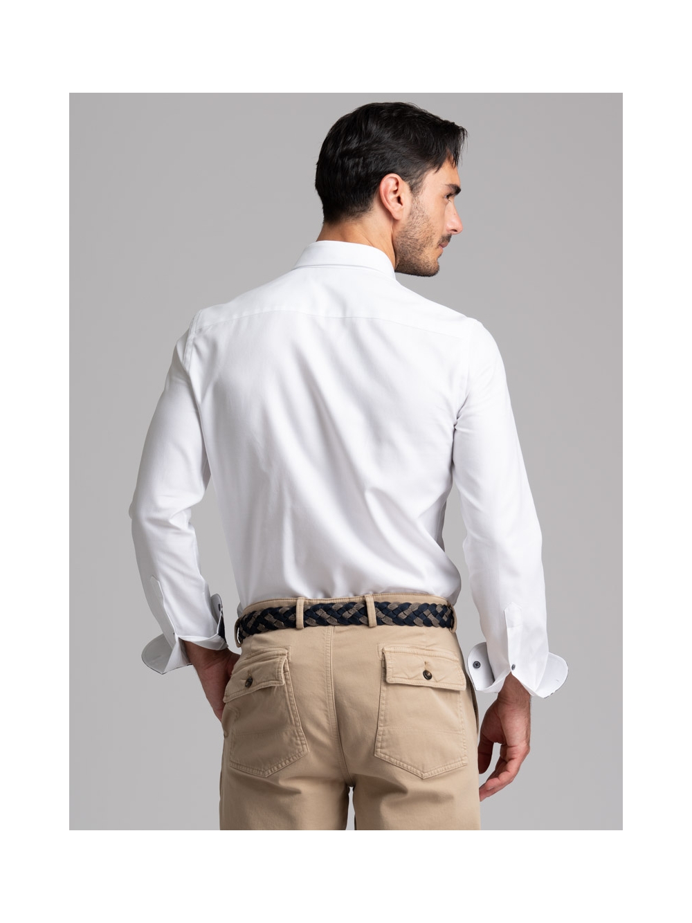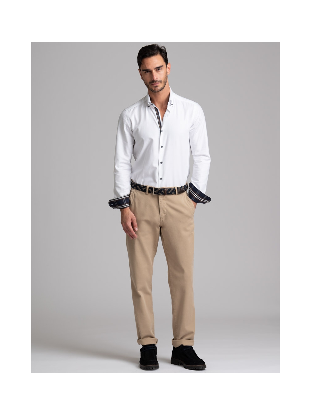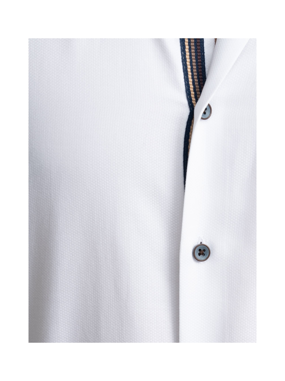 Camicia uomo realizzata in tessuto bianco micro armaturato con collo button down. La camicia è arricchita da un nastro di tessuto fantasia madras a contrasto - nei toni del blu, nero, bianco e marrone - nell’interno collo e polsi, con mosca abbinata. Sul canolo bottoni sono presenti un nastro decorativo degli stessi colori dell’inserto tessuto e bottoni a contrasto bicolore, moro e avio. Con la manica lunga e una vestibilità slim, questa è una camicia casual per una moda uomo ricercata.