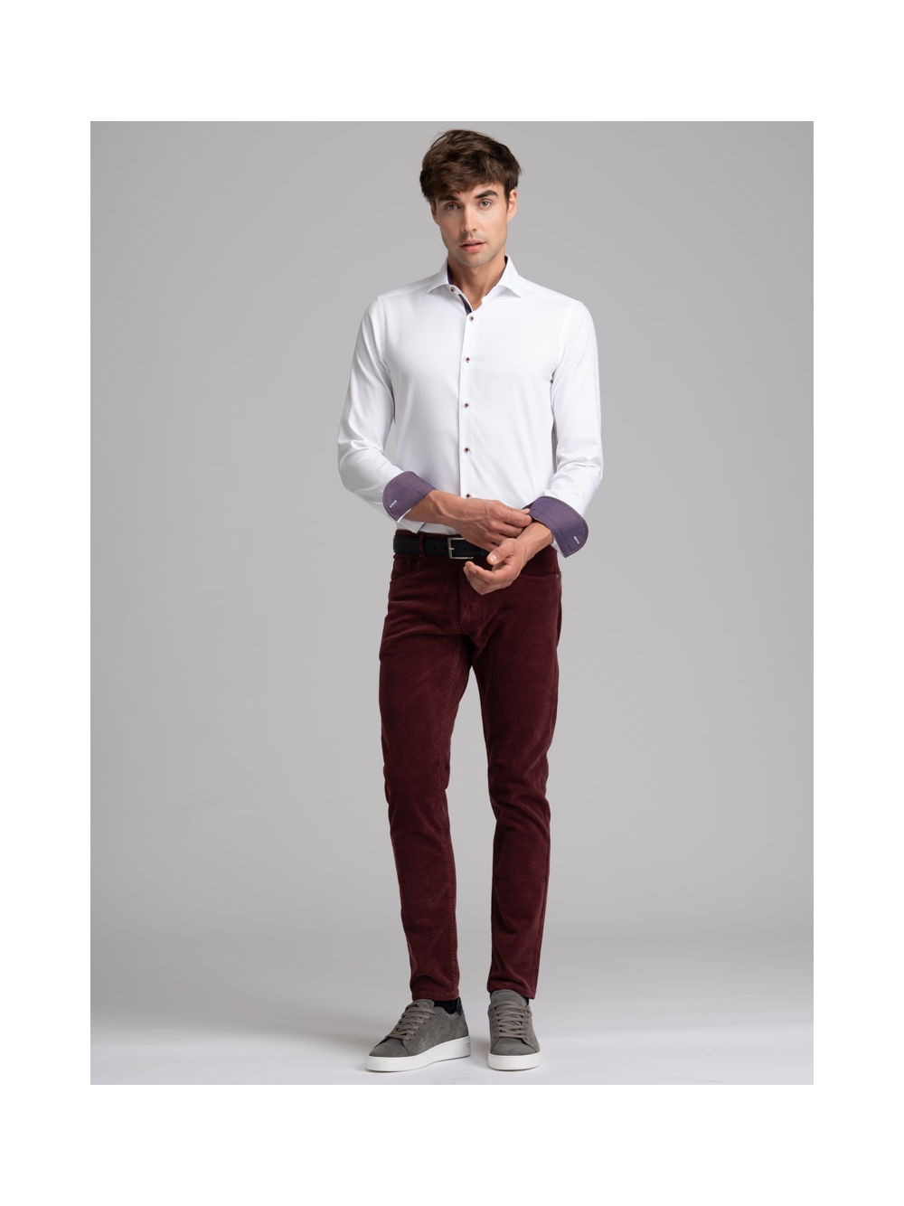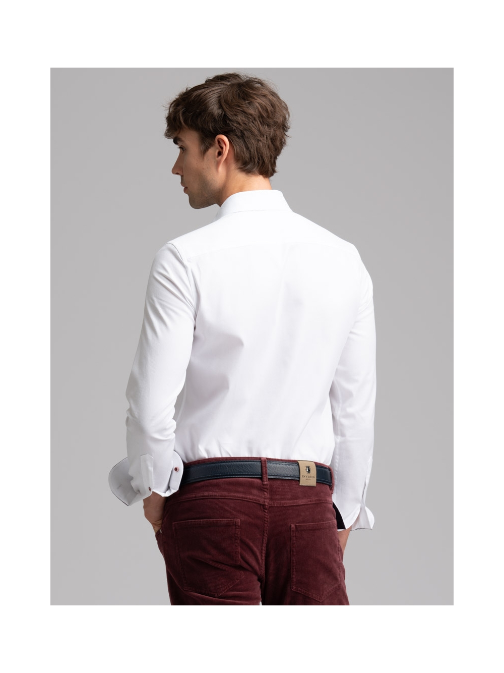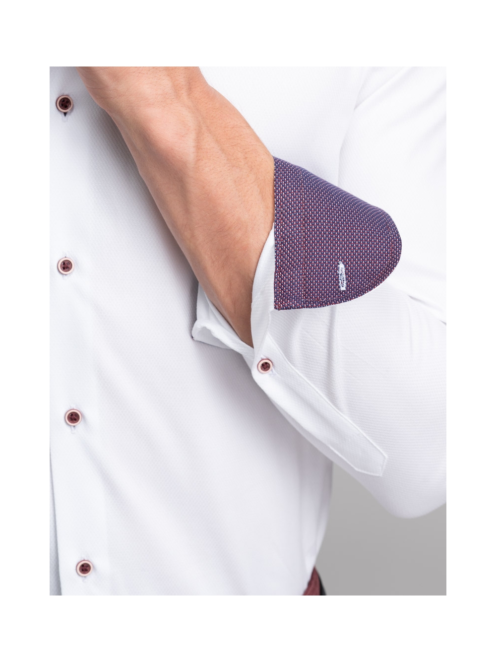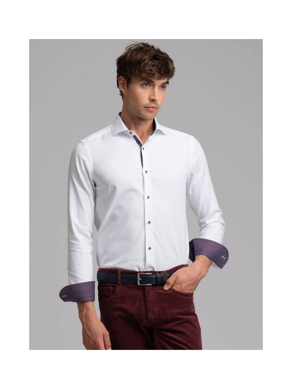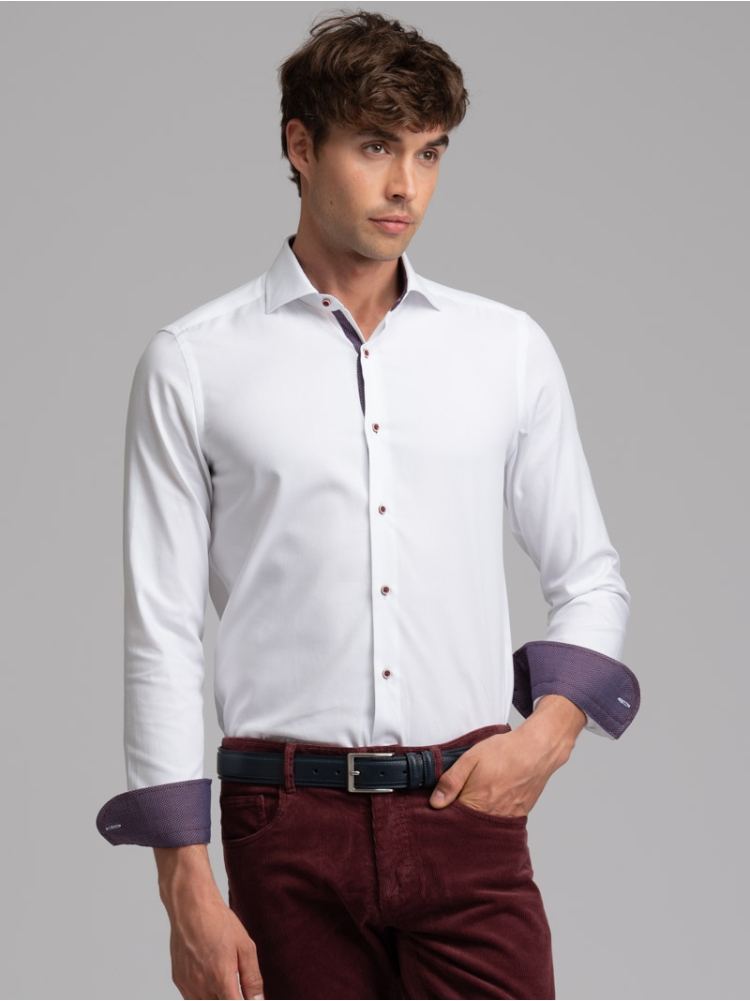Camicia uomo realizzata in tessuto bianco armaturato con collo semi francese. La camicia è arricchita da inserti in tessuto micro fantasia bordeaux nell’interno collo, polsi e canolo e rifinita con bottoni di colore a contrasto bordeaux. Con la manica lunga e una vestibilità slim, questa è una camicia casual per una moda uomo ricercata.