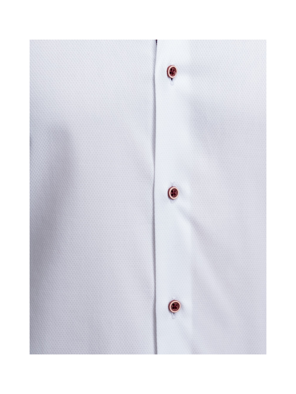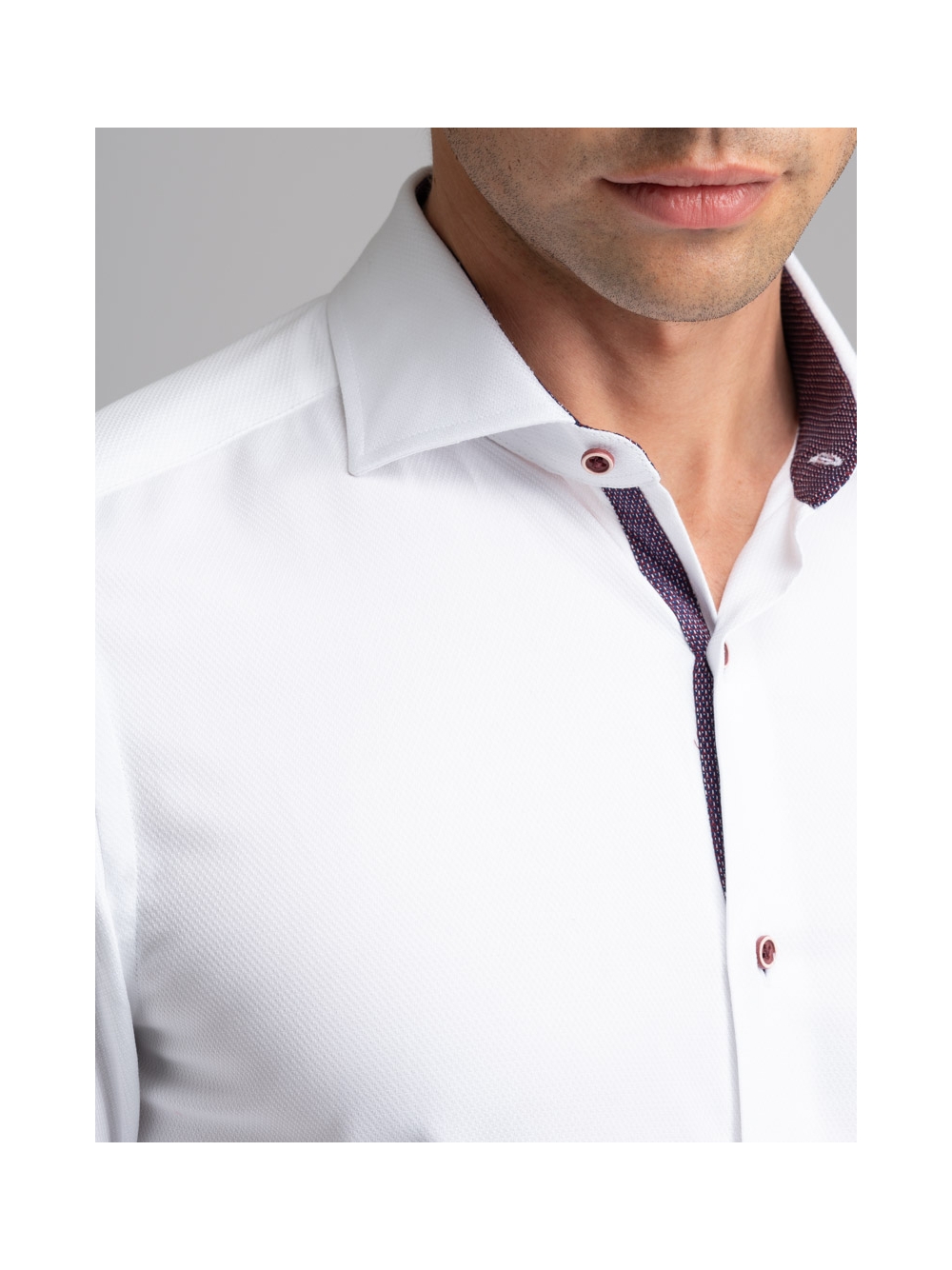 Camicia uomo con collo semifrancese realizzata in tessuto bianco armaturato e inserti in tessuto micro fantasia bordeaux con bottoni abbinati.