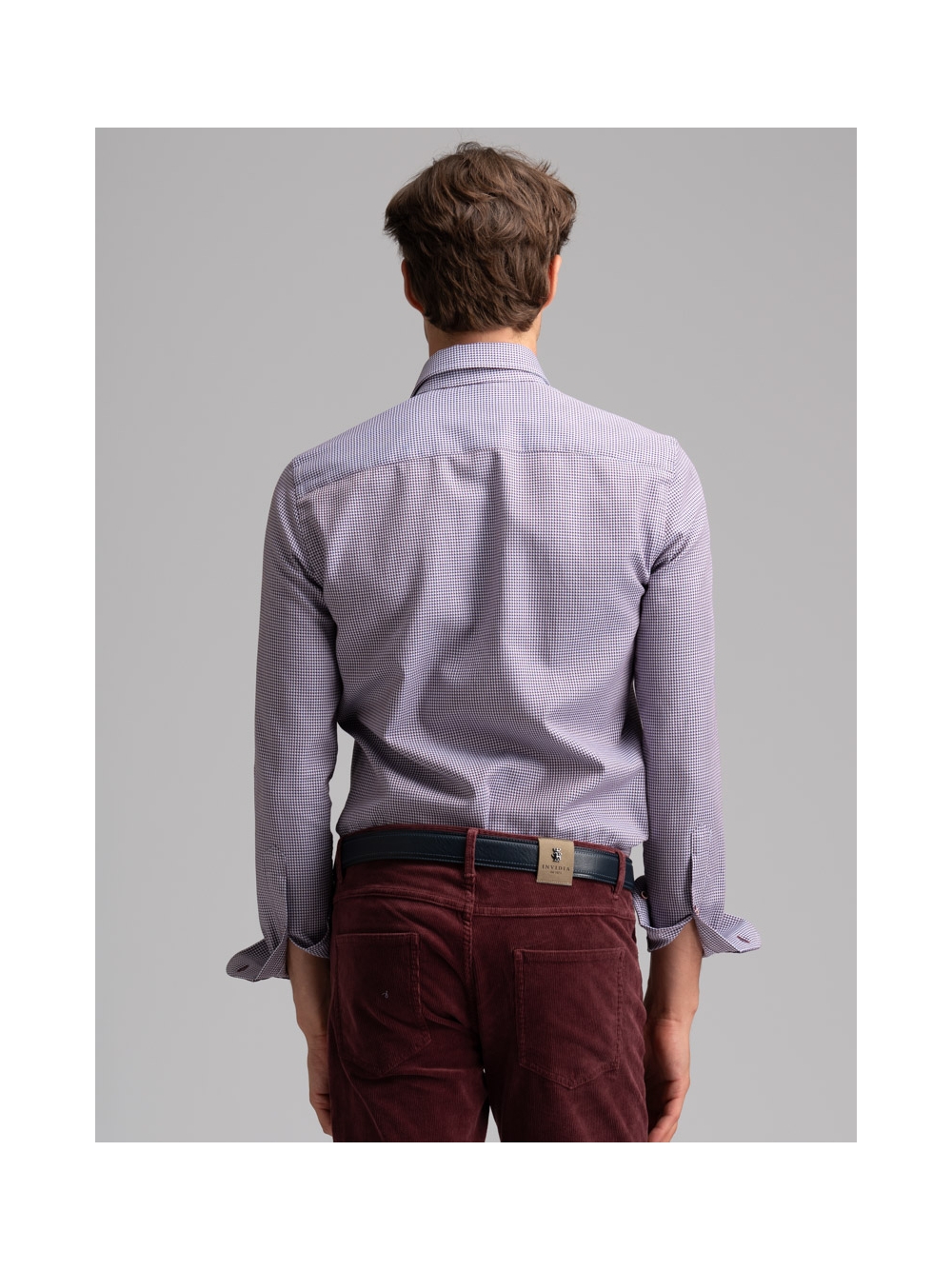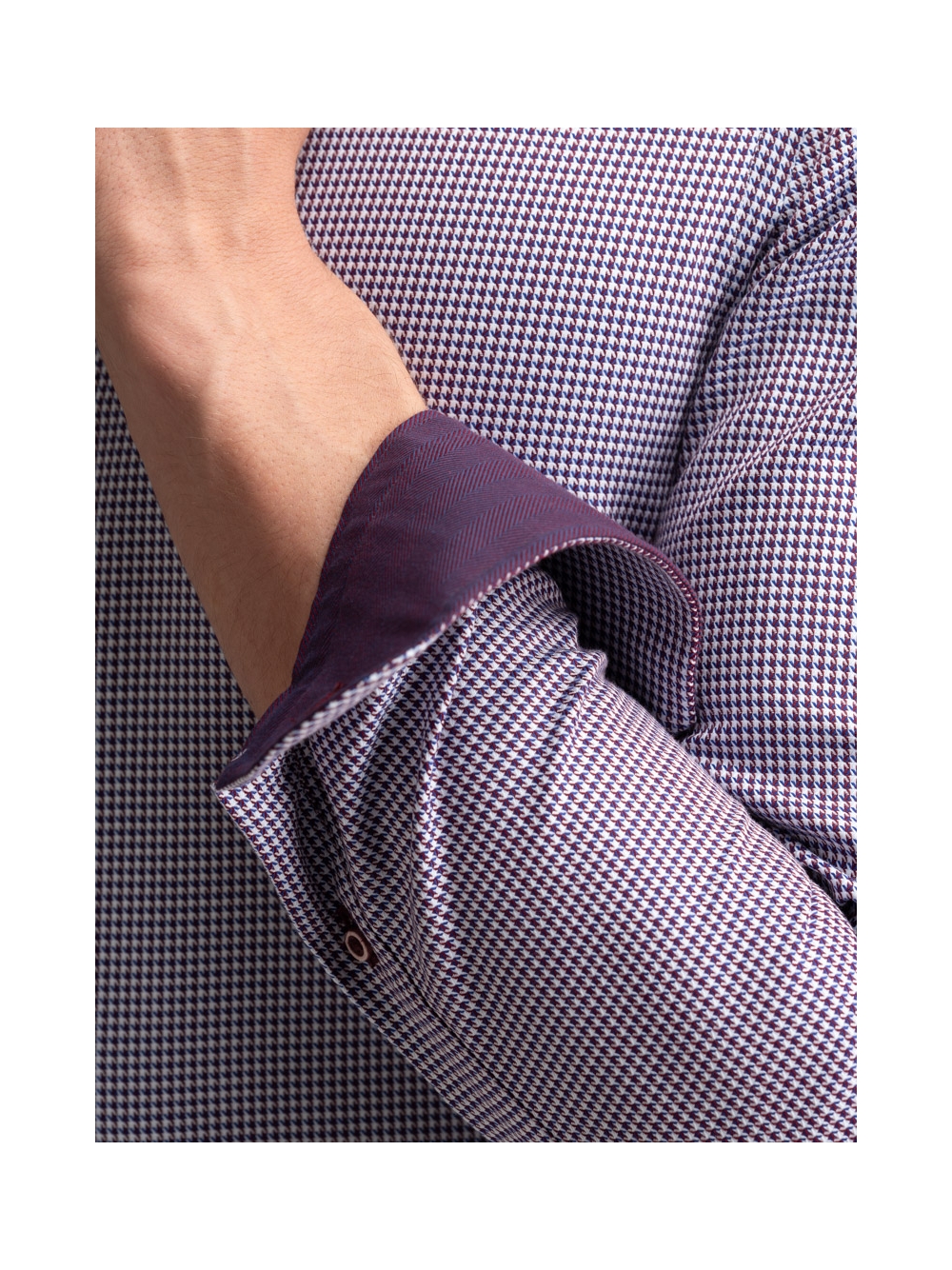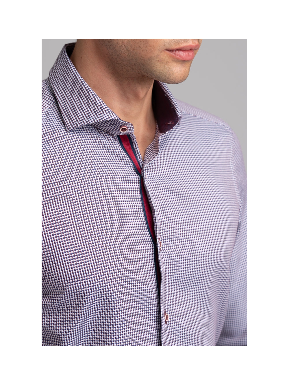Camicia uomo con collo semi francese in tessuto base twill con disegno pied de poule nei toni del blu, bordeaux e bianco, inserti in tessuto a contrasto.