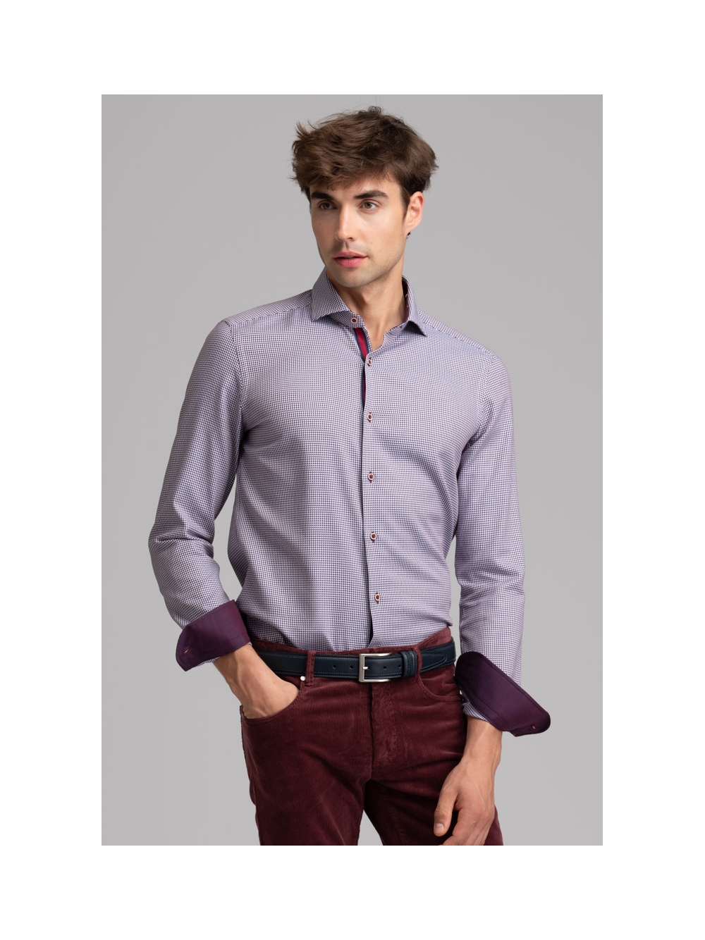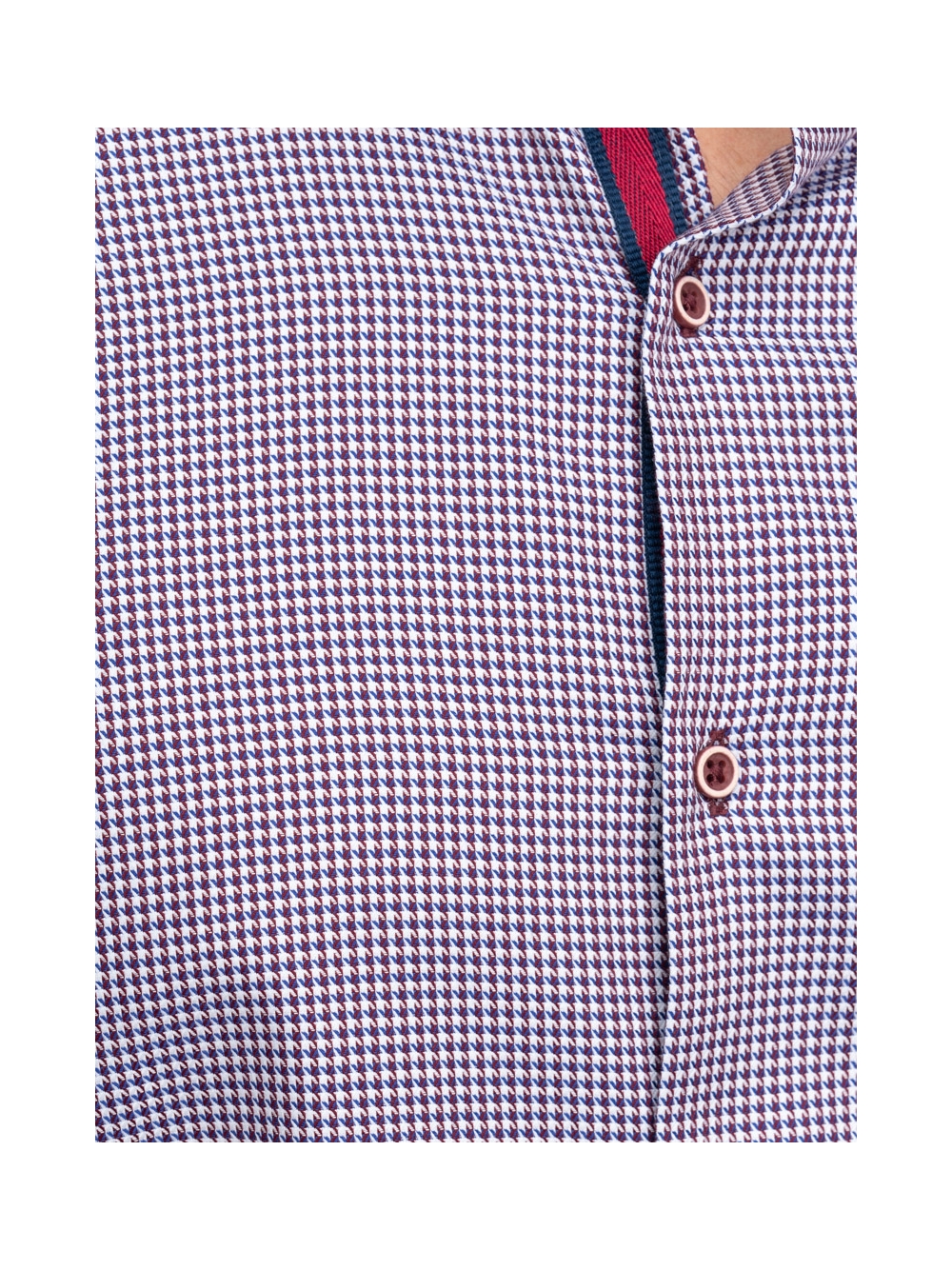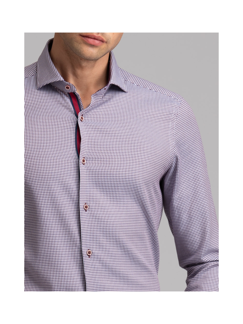 Camicia uomo con collo semi francese in tessuto base twill con disegno pied de poule nei toni del blu, bordeaux e bianco, inserti in tessuto a contrasto.