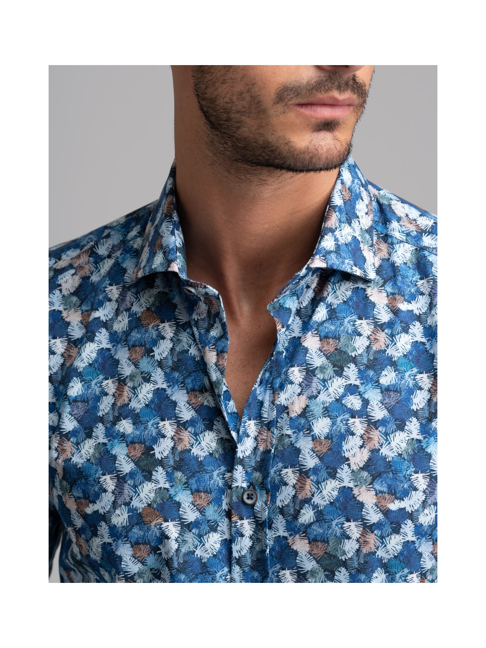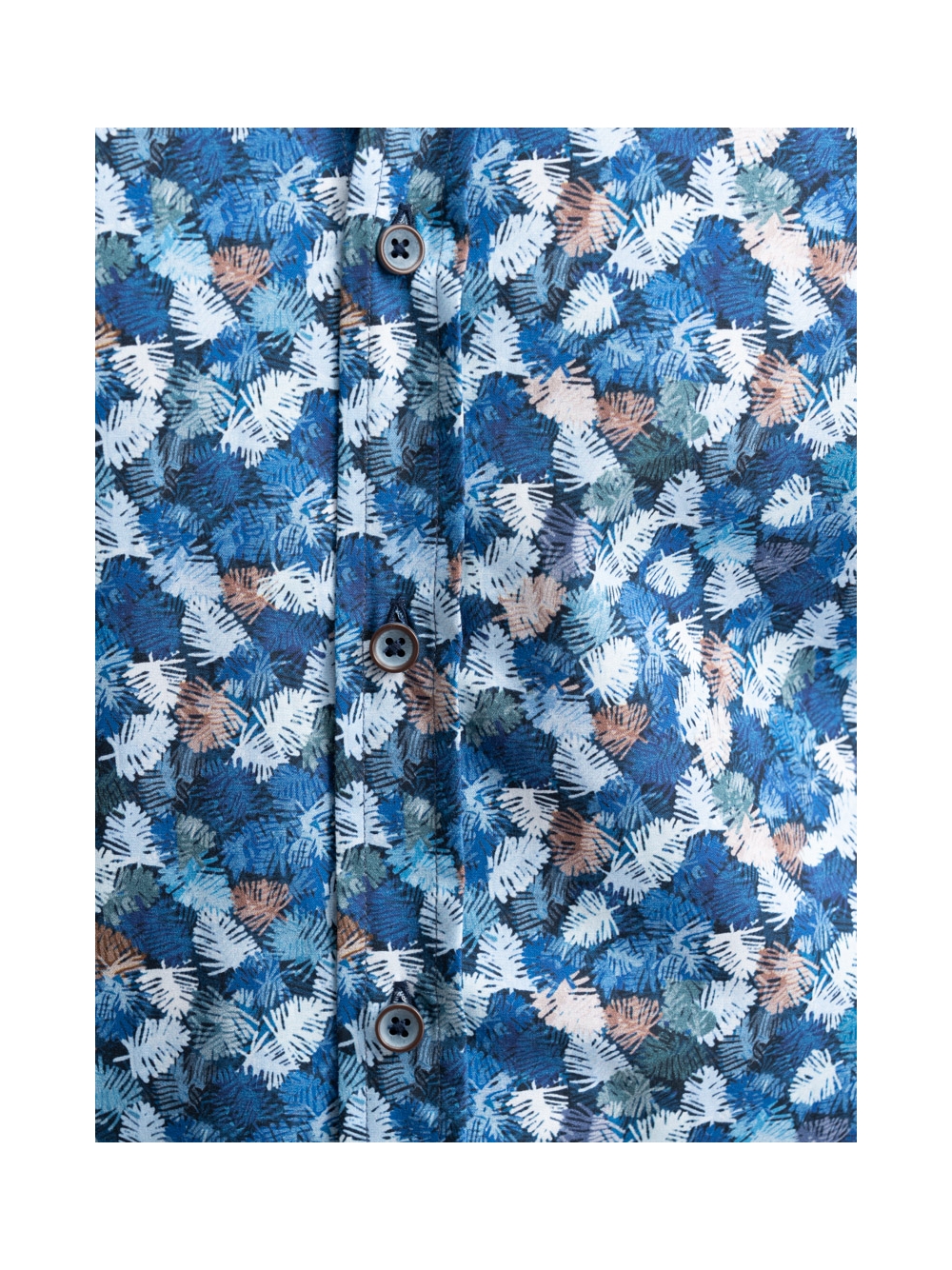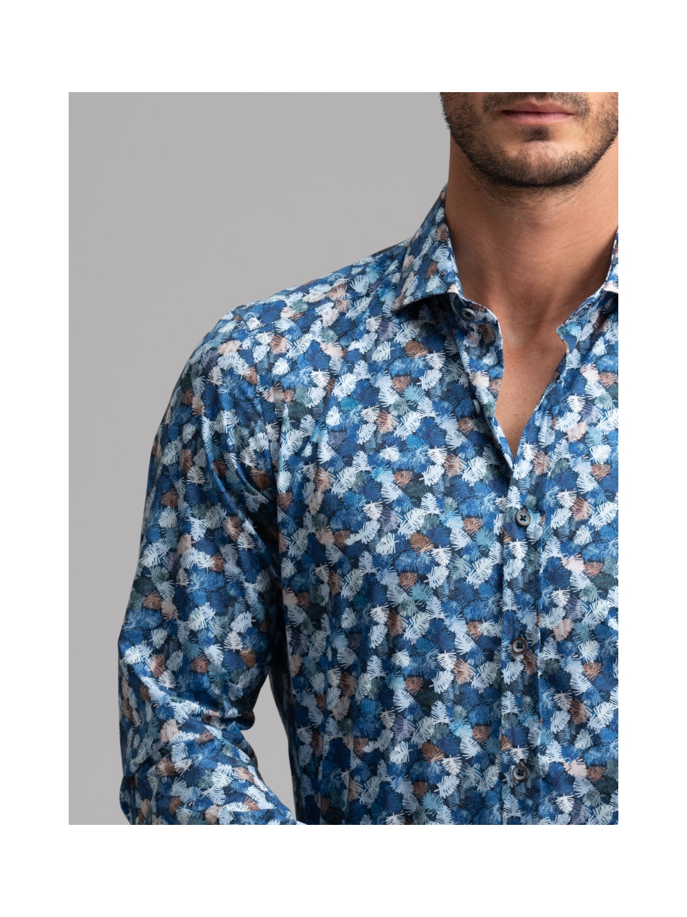 Camicia uomo con collo semi francese realizzata in tessuto base popeline con stampa fantasia a foglie colorate nei toni del blu, moro e bianco. La camicia è arricchita da un’applicazione nastro nell’interno collo e bottoni bicolore moro e avio. Con la manica lunga e una vestibilità slim, questa è una camicia casual per una moda uomo ricercata.