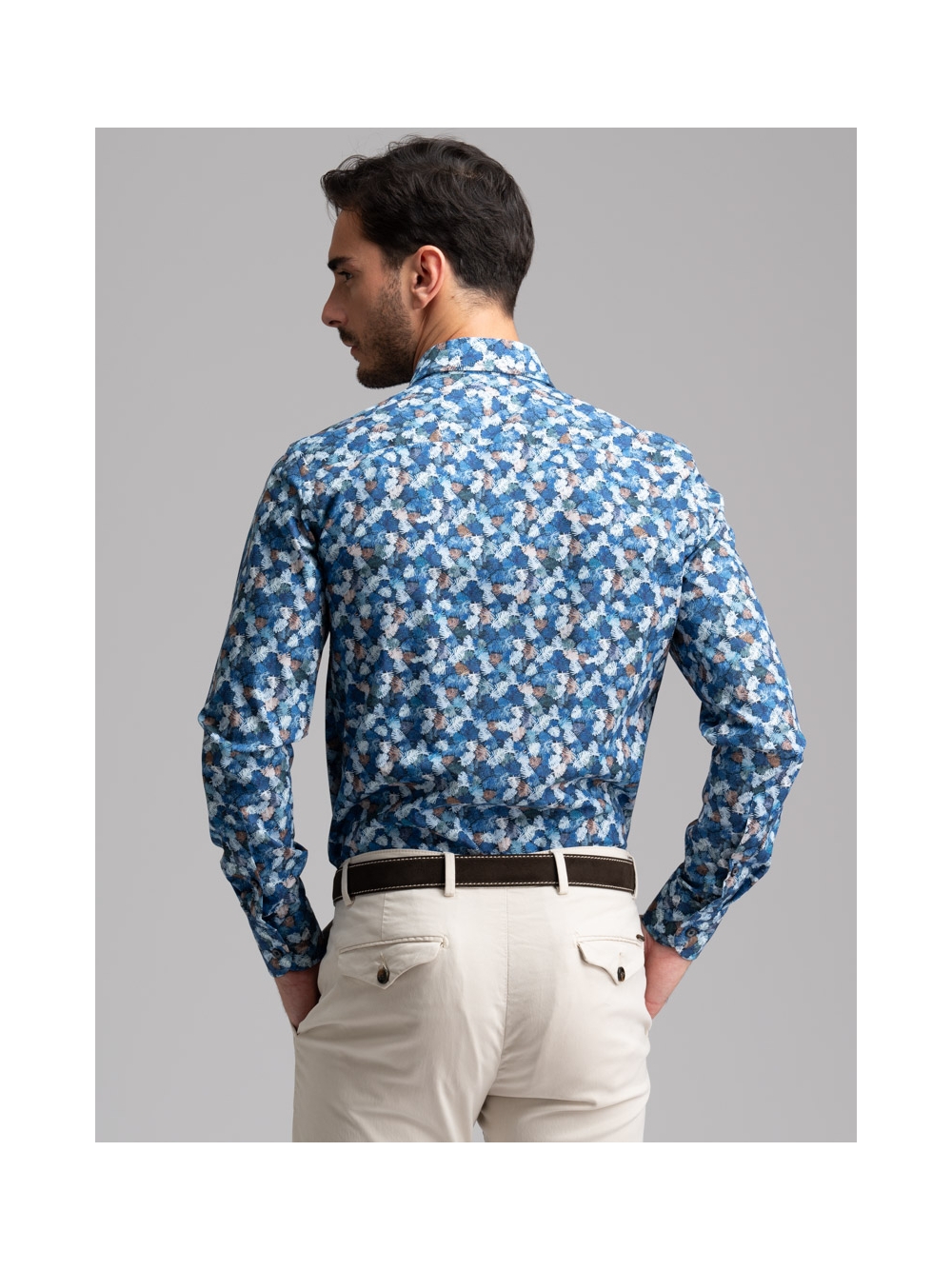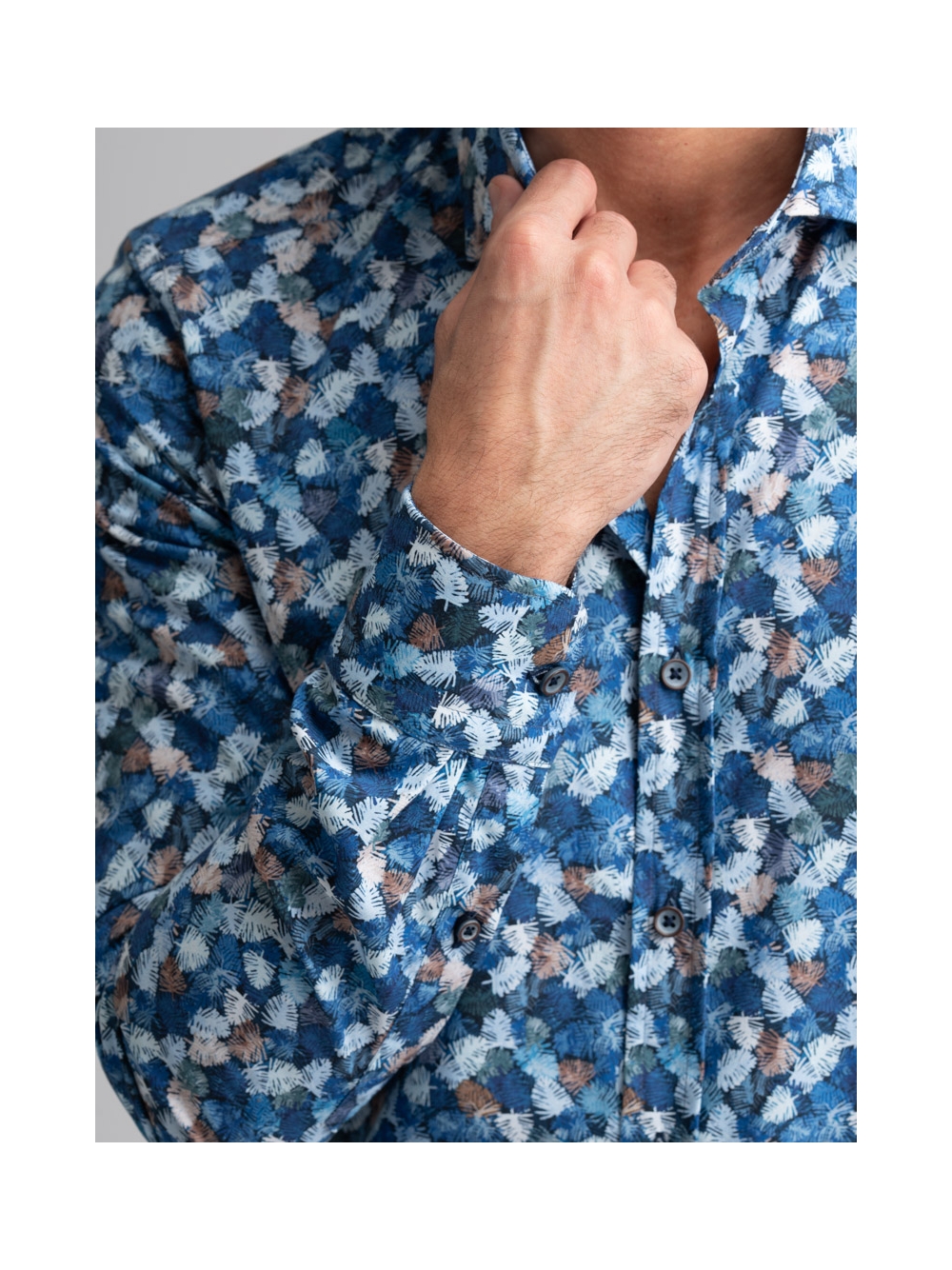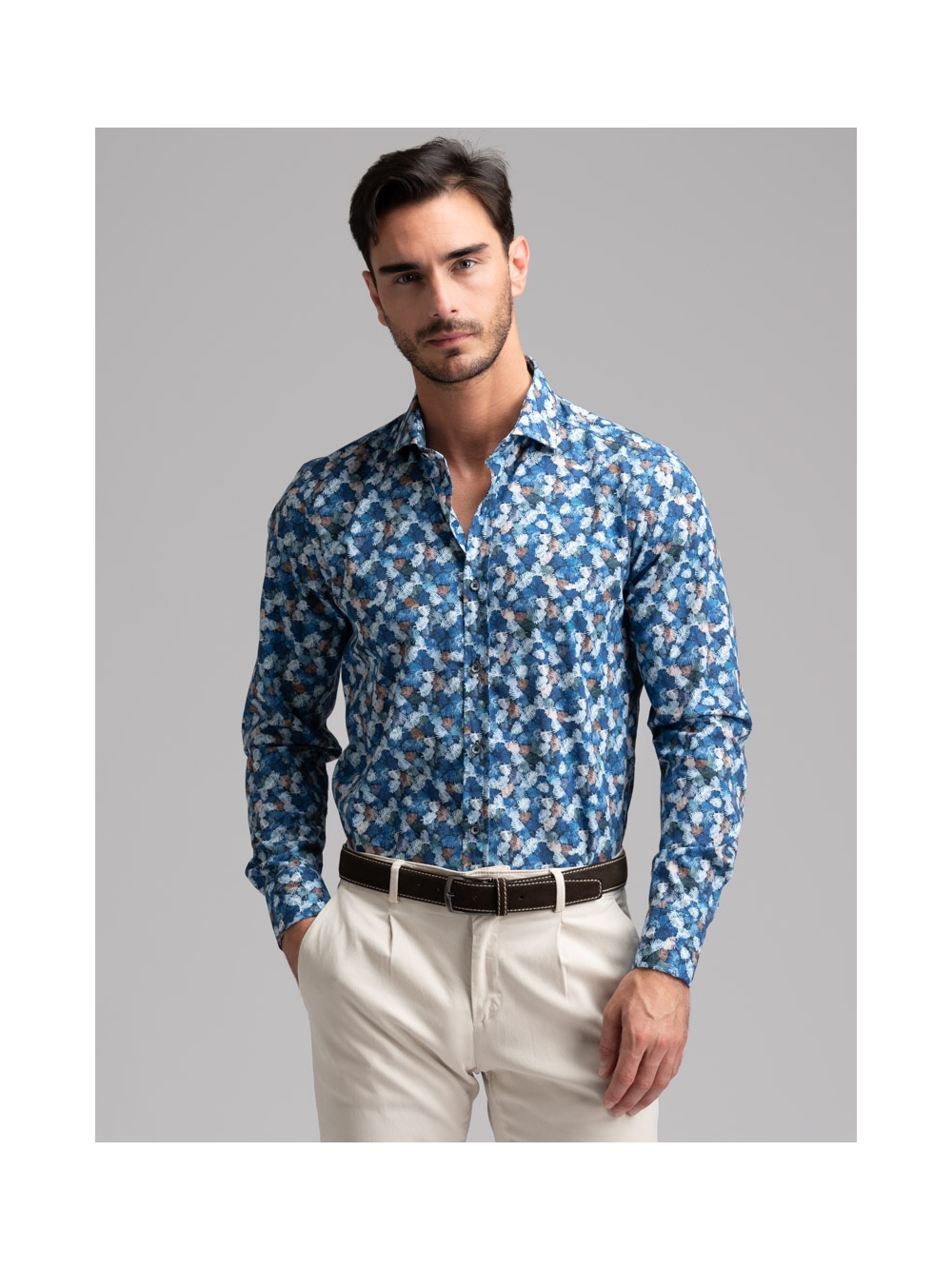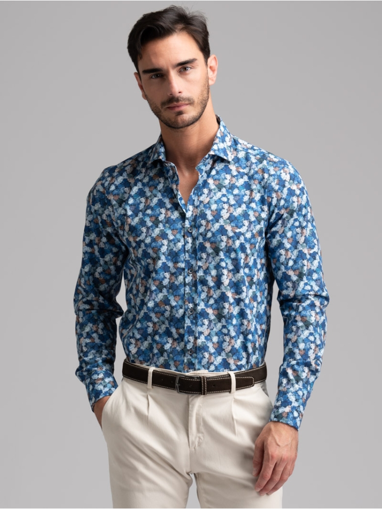 Camicia uomo con collo semi francese realizzata in tessuto base popeline con stampa fantasia a foglie colorate nei toni del blu, moro e bianco. La camicia è arricchita da un’applicazione nastro nell’interno collo e bottoni bicolore moro e avio. Con la manica lunga e una vestibilità slim, questa è una camicia casual per una moda uomo ricercata.