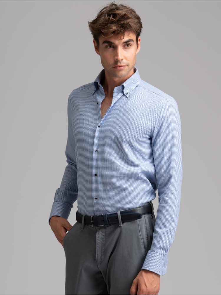 Camicia uomo realizzata in tessuto unito con collo button down, caratterizzato da una micro fantasia nei toni dell’azzurro. La camicia è arricchita da un nastro di tessuto azzurro nell’interno collo e polsi e bottoni blu a contrasto. Con la manica lunga e una vestibilità slim, questa è una camicia casual per una moda uomo ricercata.